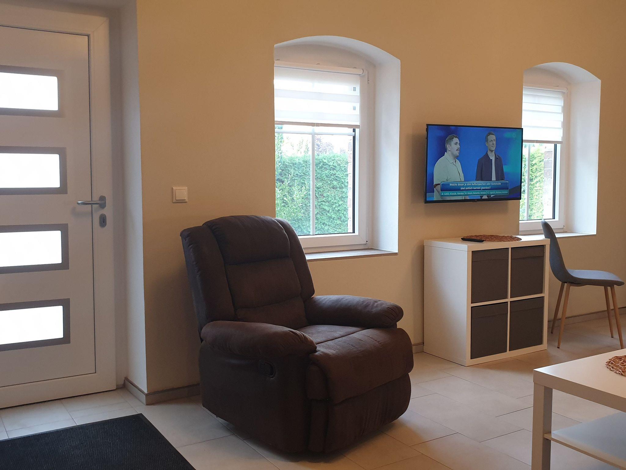 Die Ferienwohnung ist ebenerdig gelegen und hat einen Wohnraum mit TV, einer kleinen offenen Küche mit Kühlschrank, einer Kochmöglichkeit und einer Sitzmöglichkeit zum Essen, einer Schlafcouch (bei Aufbettung), ein separates Schlafzimmer mit einem Doppelbett (160x200), einem kleinen Flur und einem großen Bad mit DU/WC.