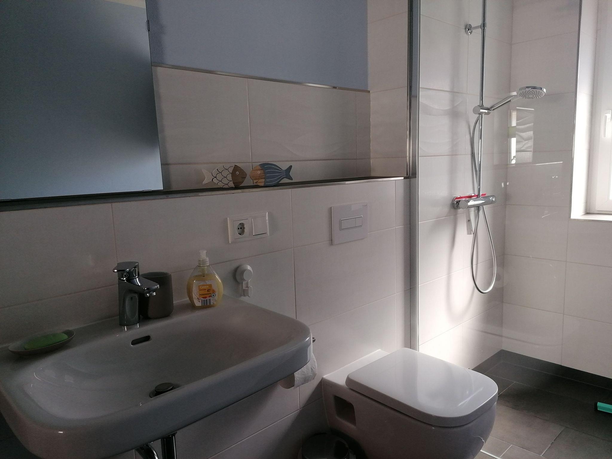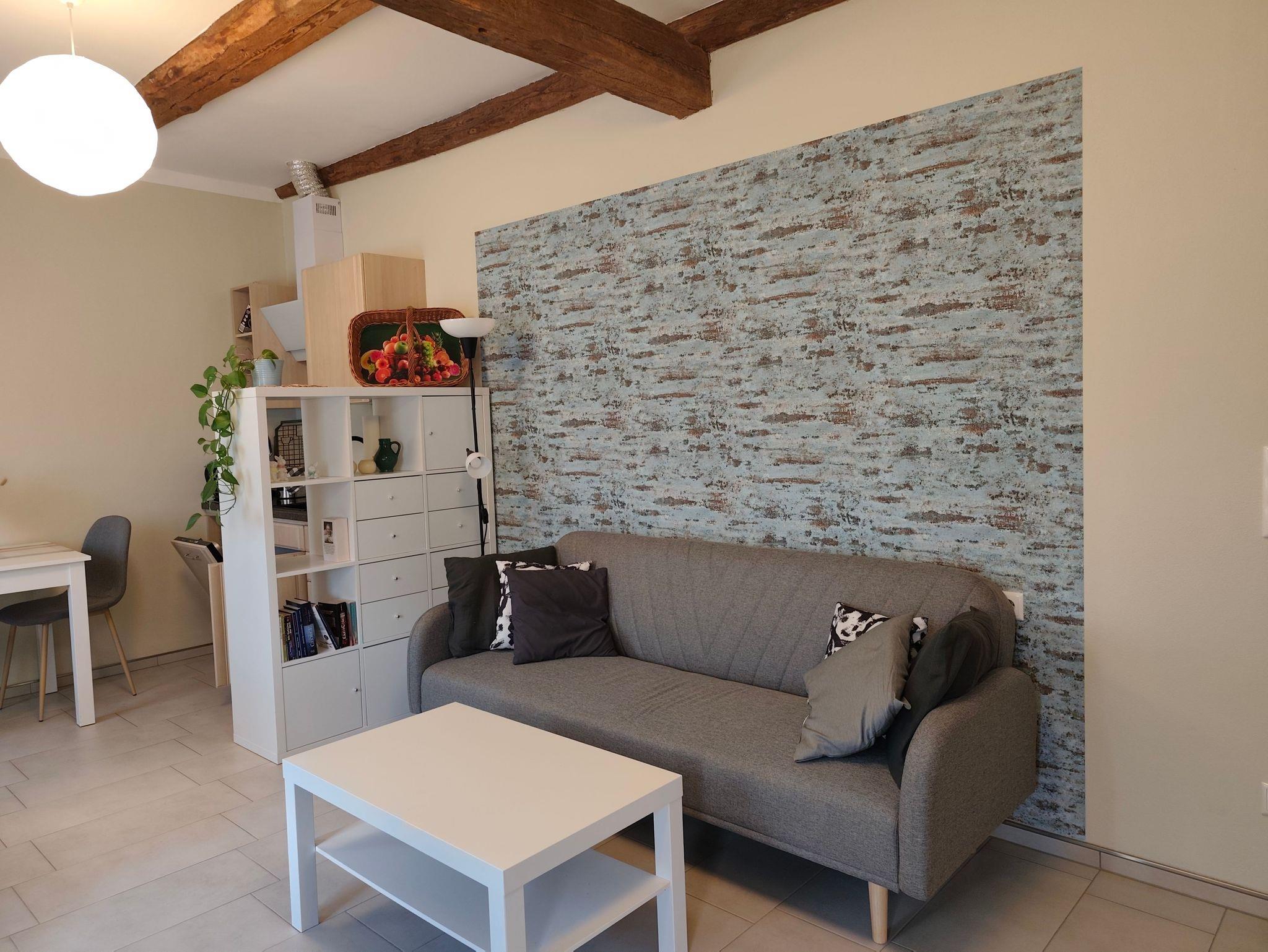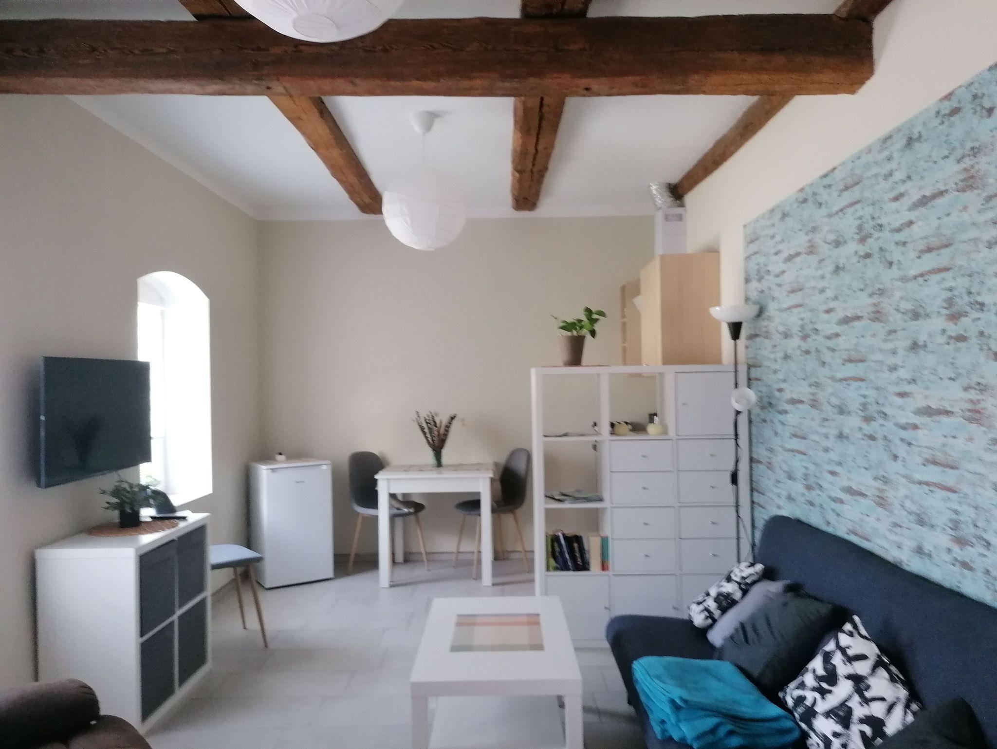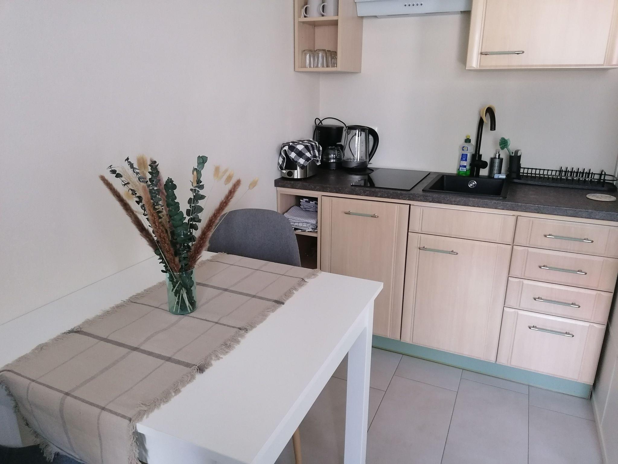 Die Wohnung bietet genügend Platz für 2 Personen und ist ausgestattet mit einem Schlafraum, einem Wohnraum mit TV und einer offenen Küche. Das modern eingerichtete Bad hat eine große, ebenerdige Dusche.