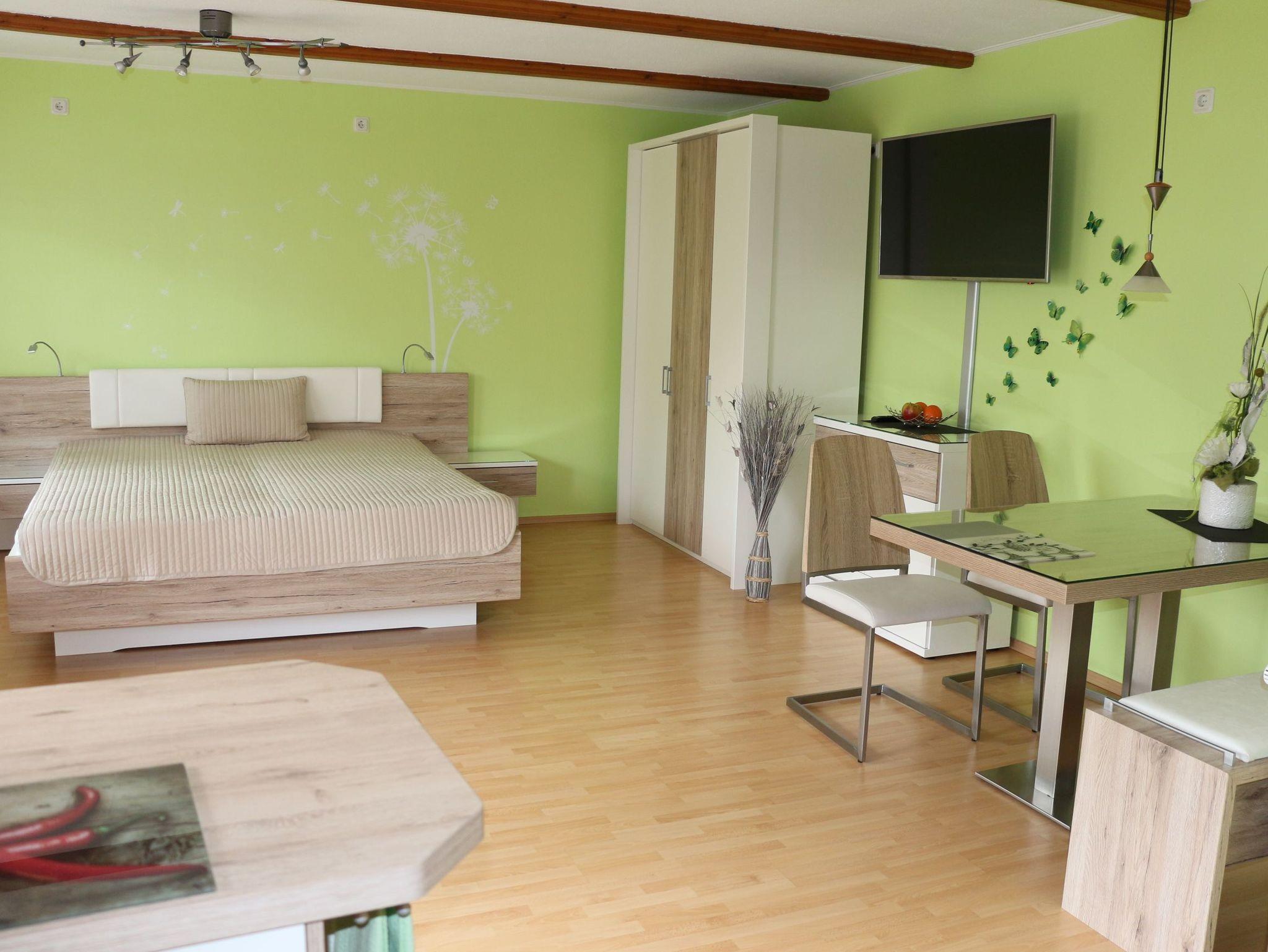 Das Nichtraucher - Ferienapartment liegt absolut ruhig und ist modern ausgestattet mit einem kombiniertem Wohn - Schlafraum mit TV - Flachbildschirm, einer offenen, komplett ausgestatteten Küche, Bad mit Badewanne und separater Dusche, WC.