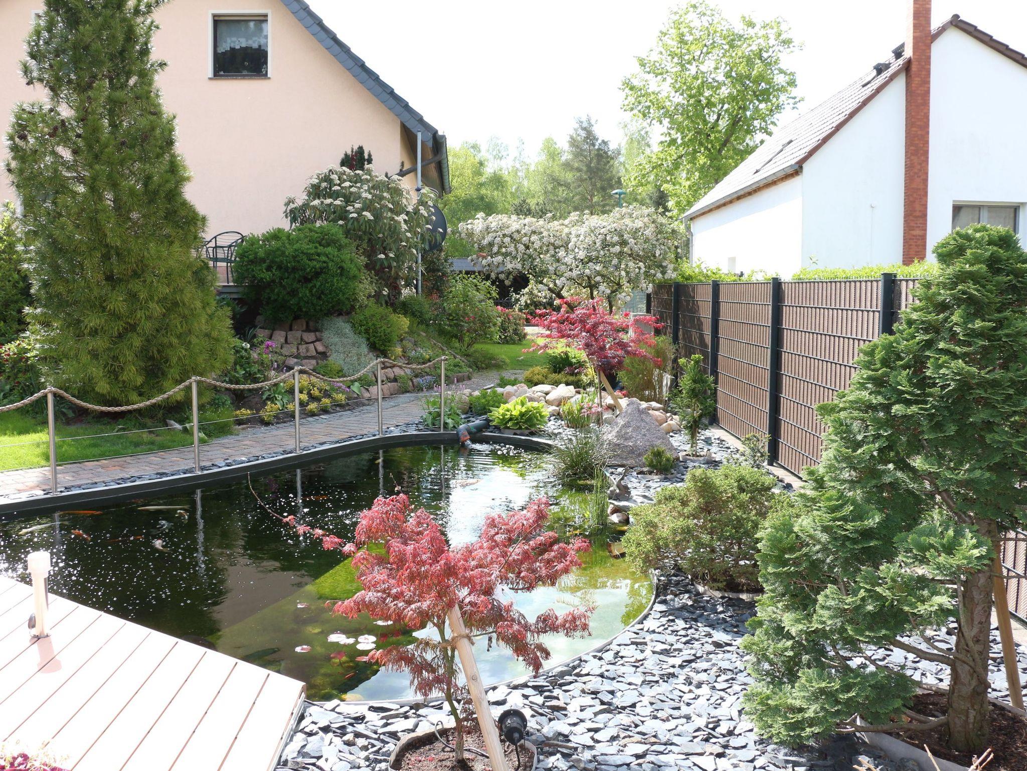 Eine ebenerdige Terrasse mit Grillmöglichkeit und Blick auf den Garten mit Teich ist ebenso für die Gäste nutzbar wie der eigene Parkplatz auf dem Grundstück.