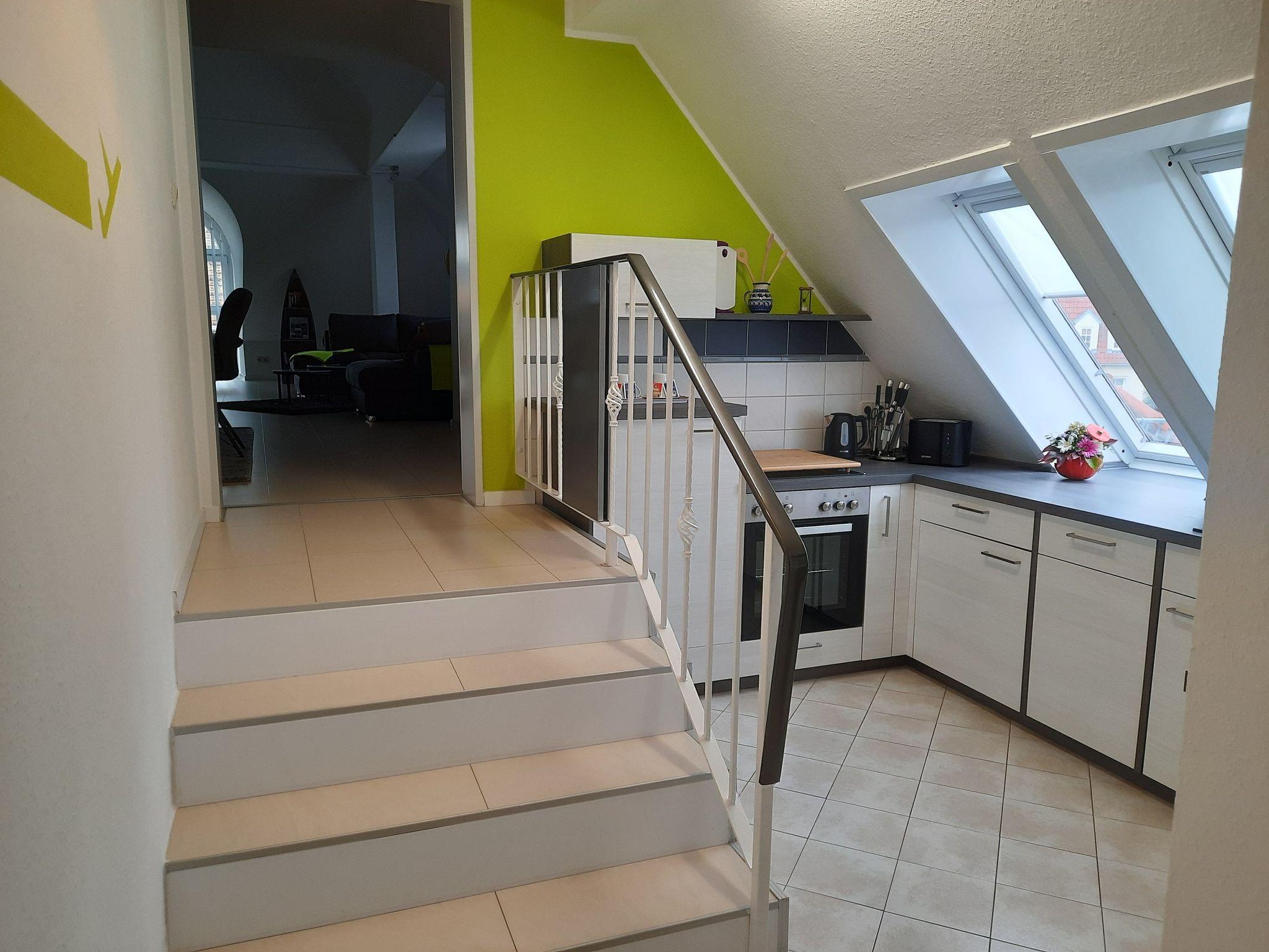 Die Ferienwohnung liegt in einem ruhigen Geschäftshaus mit separatem Eingang, in fußläufiger Lage vom Markt entfernt, im oberen Dachgeschoss und ist über einen Treppenaufgang erreichbar. Eine Unterstellmöglichkeit für Fahrräder ist gegeben.
