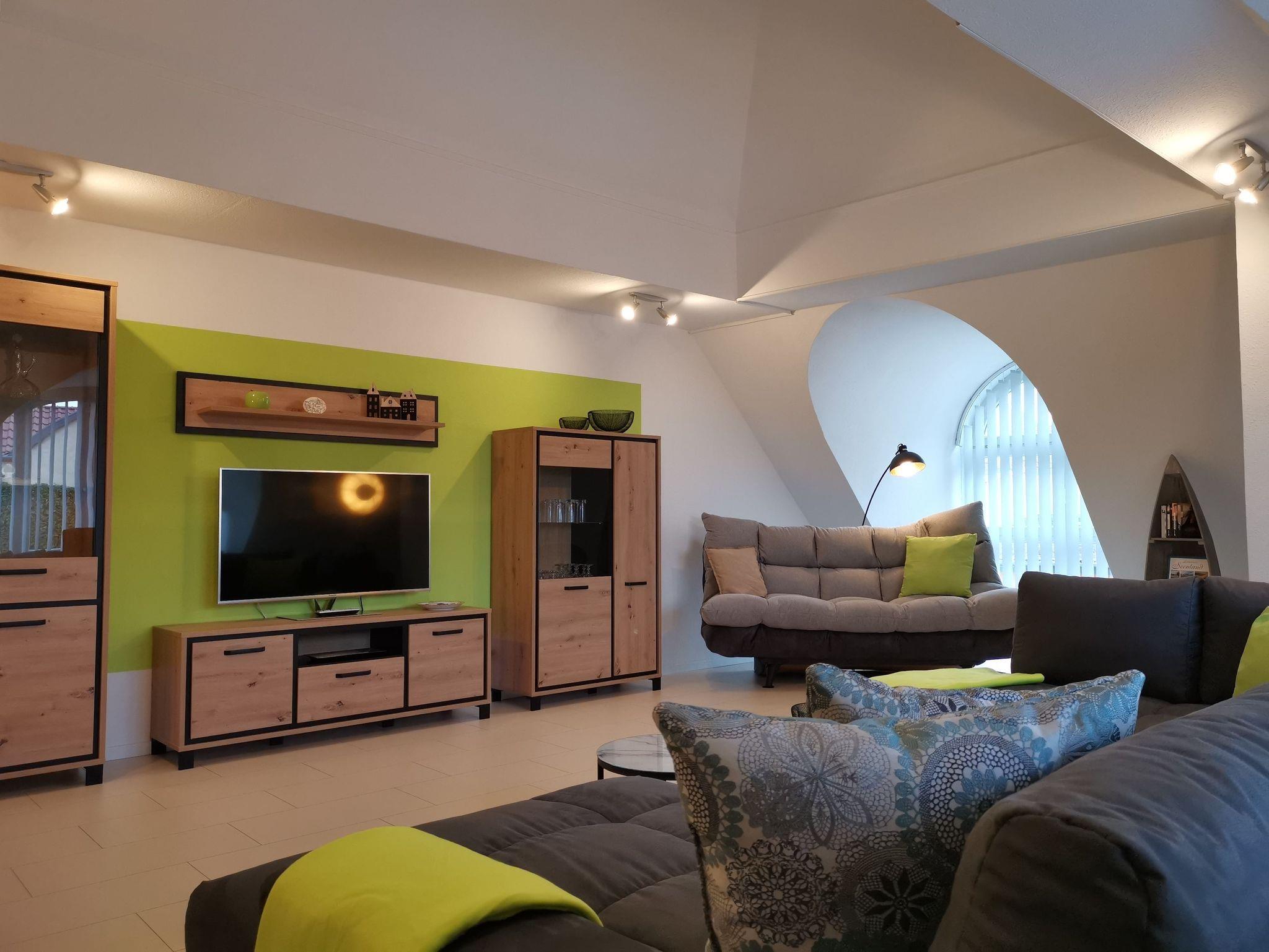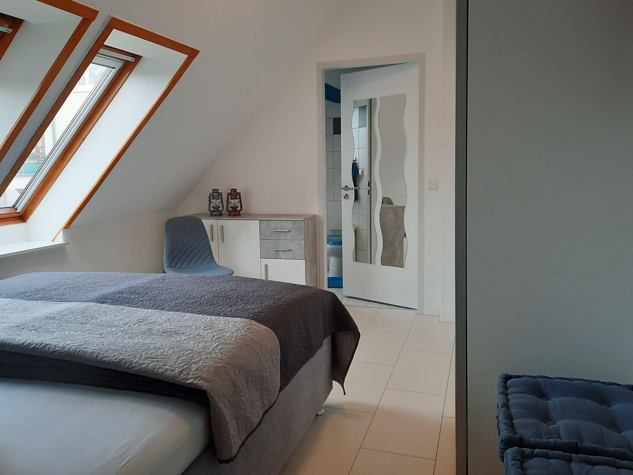 Für einen entspannten Aufenthalt bietet die Ferienwohnung einen Flur, einen kombinierten Wohn-Schlafraum, ein Schlafzimmer mit einem Doppelbett (180x200), ein Bad mit DU/WC, ein Gäste-WC, eine offene Küche mit Geschirrspüler, Backofen, Kühlschrank, Kaffeemaschine und Toaster. Den kombinierten Wohn-Schlafraum erreicht man bequem über 4 Stufen. Der großzügig gestaltete Wohn-Schlafraum bietet viel Platz zum Entspannen, Lesen und gemeinsamen Essen.