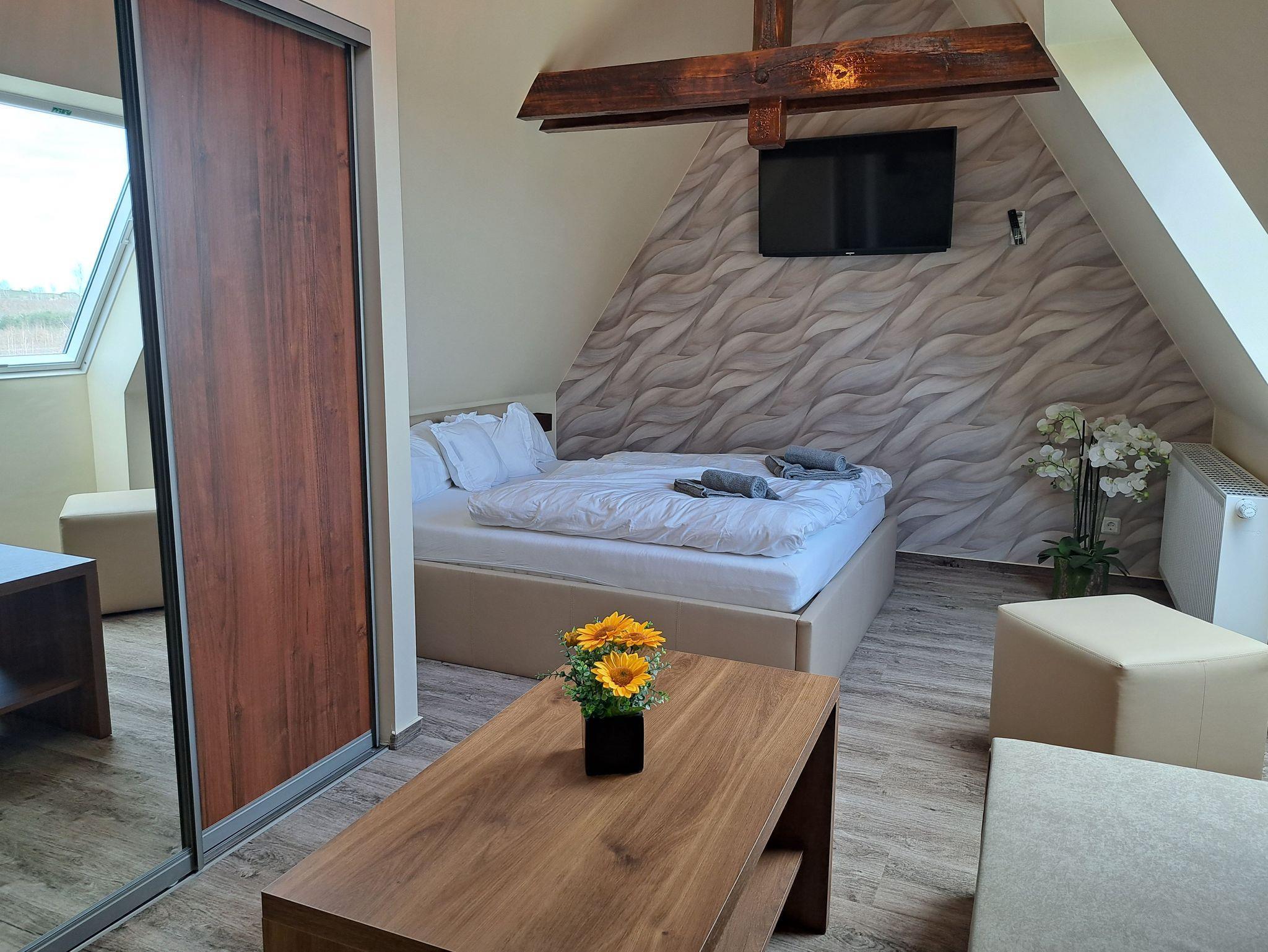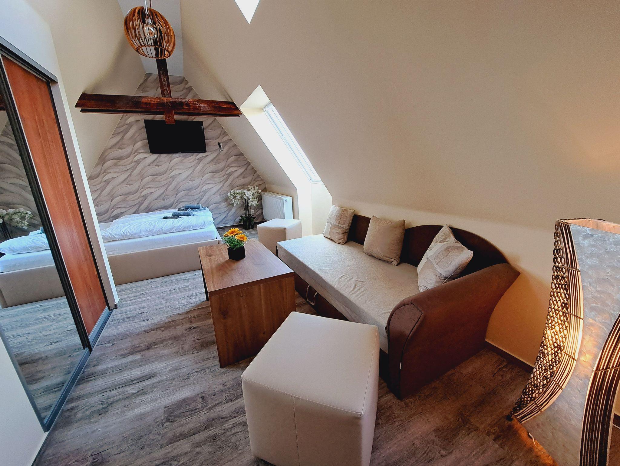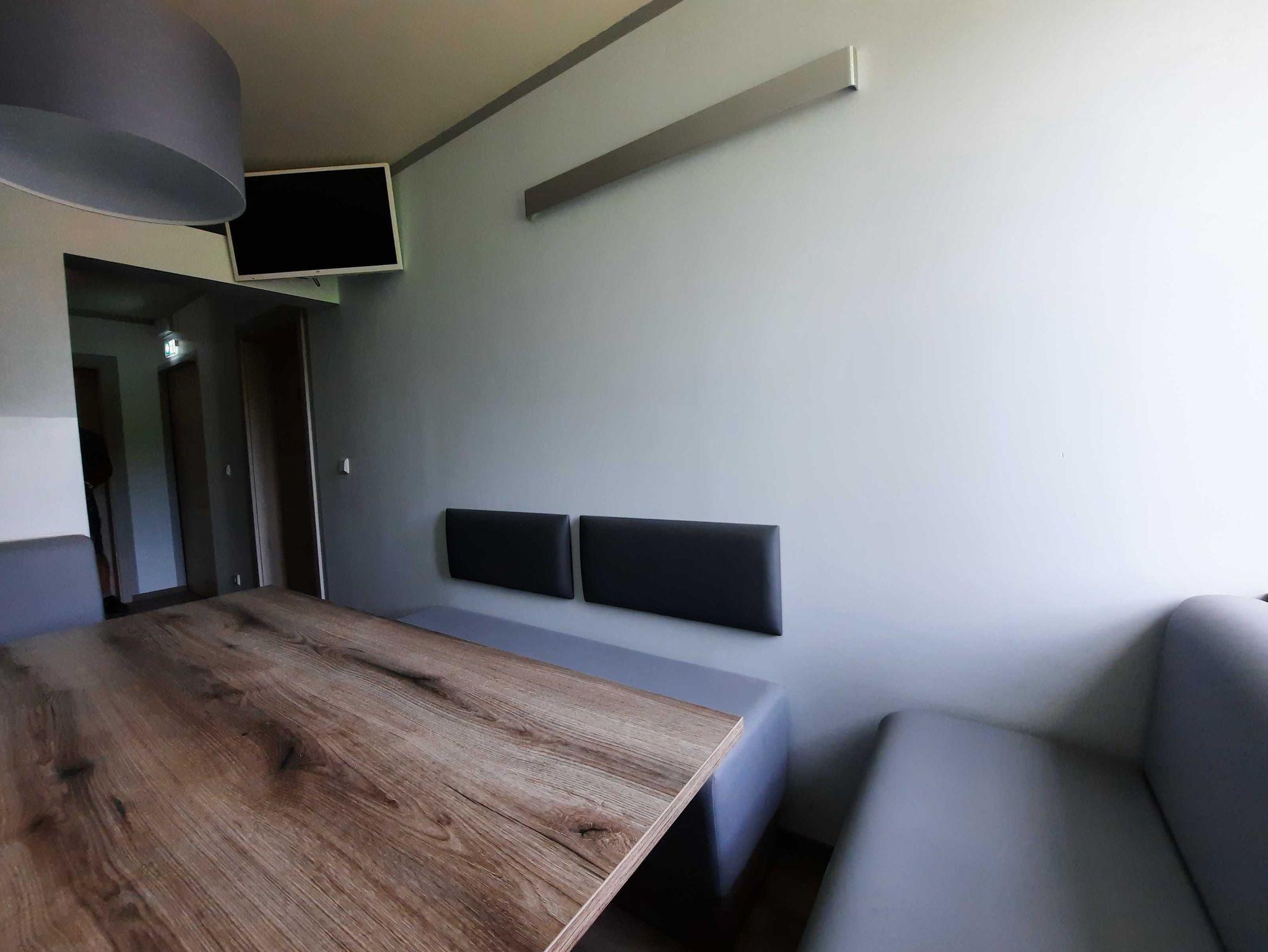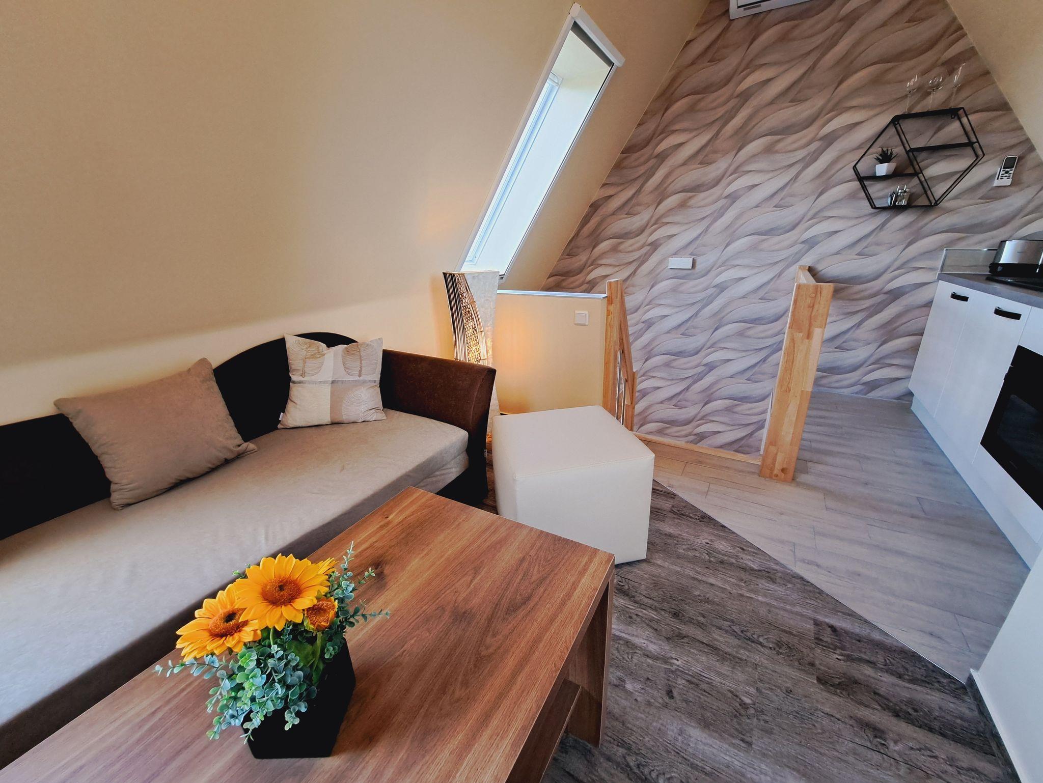 Das Appartment ist modern eingerichtet und hat 1 kombinierten Wohn-Schlafraum mit einem Doppelbett und einer Schlafcouch und eine Einbauküche im oberen Bereich, der durch eine Treppe erreichbar ist. Das Bad mit Dusche/WC liegt im unteren Bereich. Zur optimalen Raumtemperatur ist eine Klimaanlage vorhanden.