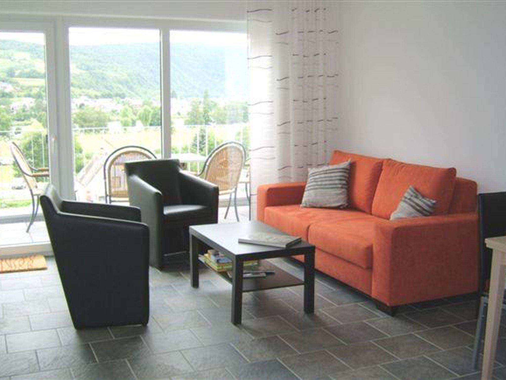 Helles 1-Raum-Appartement (30 qm), Dusche/WC, voll eingerichtete Kochnische, Doppelbett, Schlafsofa als zusätzliche Schlafmöglichkeit, Balkon mit Panoramablick ins Moseltal, WLan, Radio/CD