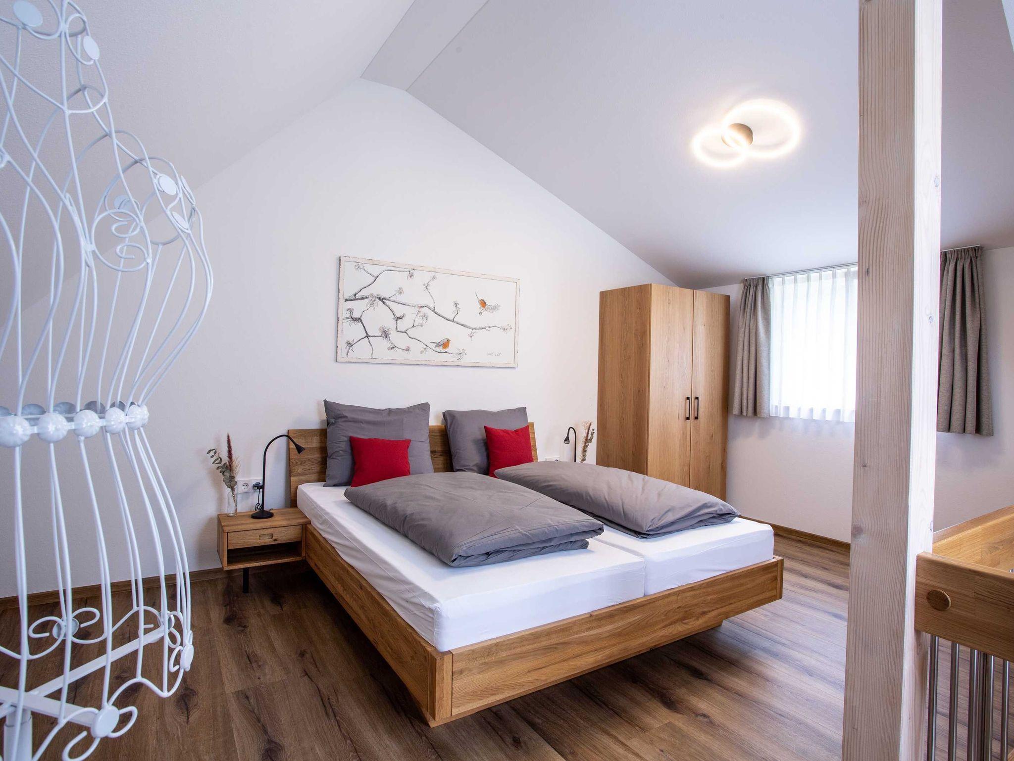 Unsere Maisonette-Ferienwohnung mit 42 m², hat ihren Eingang im Erdgeschoss und ist eine Nichtraucherwohnung. Sie verfügt über ein Schlafzimmer mit Doppelbett im Obergeschoss, ein Wohnzimmer mit Schlafsofa, eine Küchenzeile mit 2-Platten-Induktionsherd, einen Balkon, Dusche/WC, SAT-TV-Flatscreen und W-LAN.