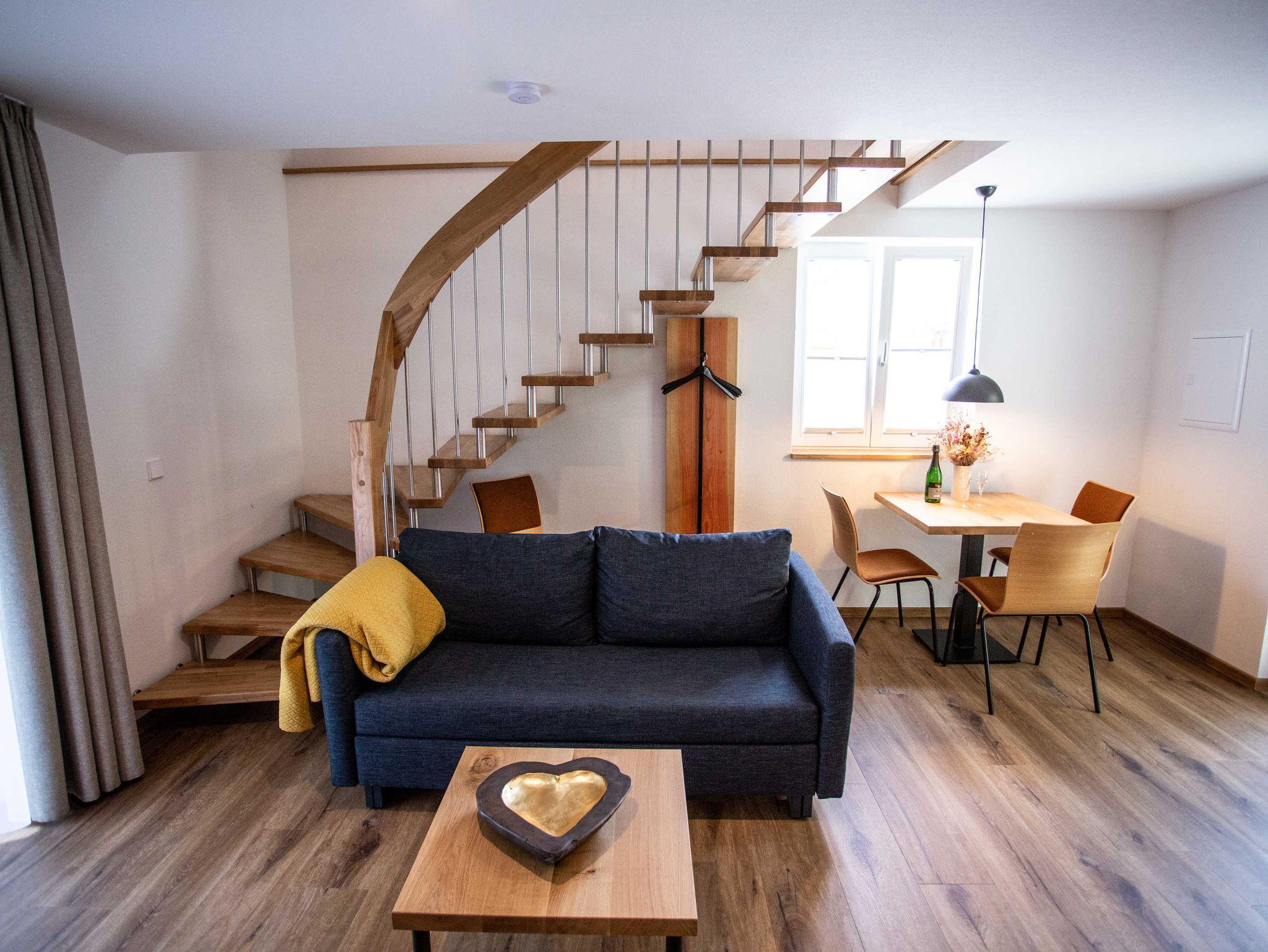 Die Maisonette-Wohnung die Douglasie besticht mit ihrem ganz besonderen Charme. Im Erdgeschoss bietet die Wohnecke mit Schlafcouch einen schönen Ort zum Verweilen. Der Küchenbereich befindet sich direkt am Eingang zur Terrasse, sodass man sein Abendessen schon gerne mal draußen genießen kann. Im Obergeschoss ist das Schlafzimmer.
