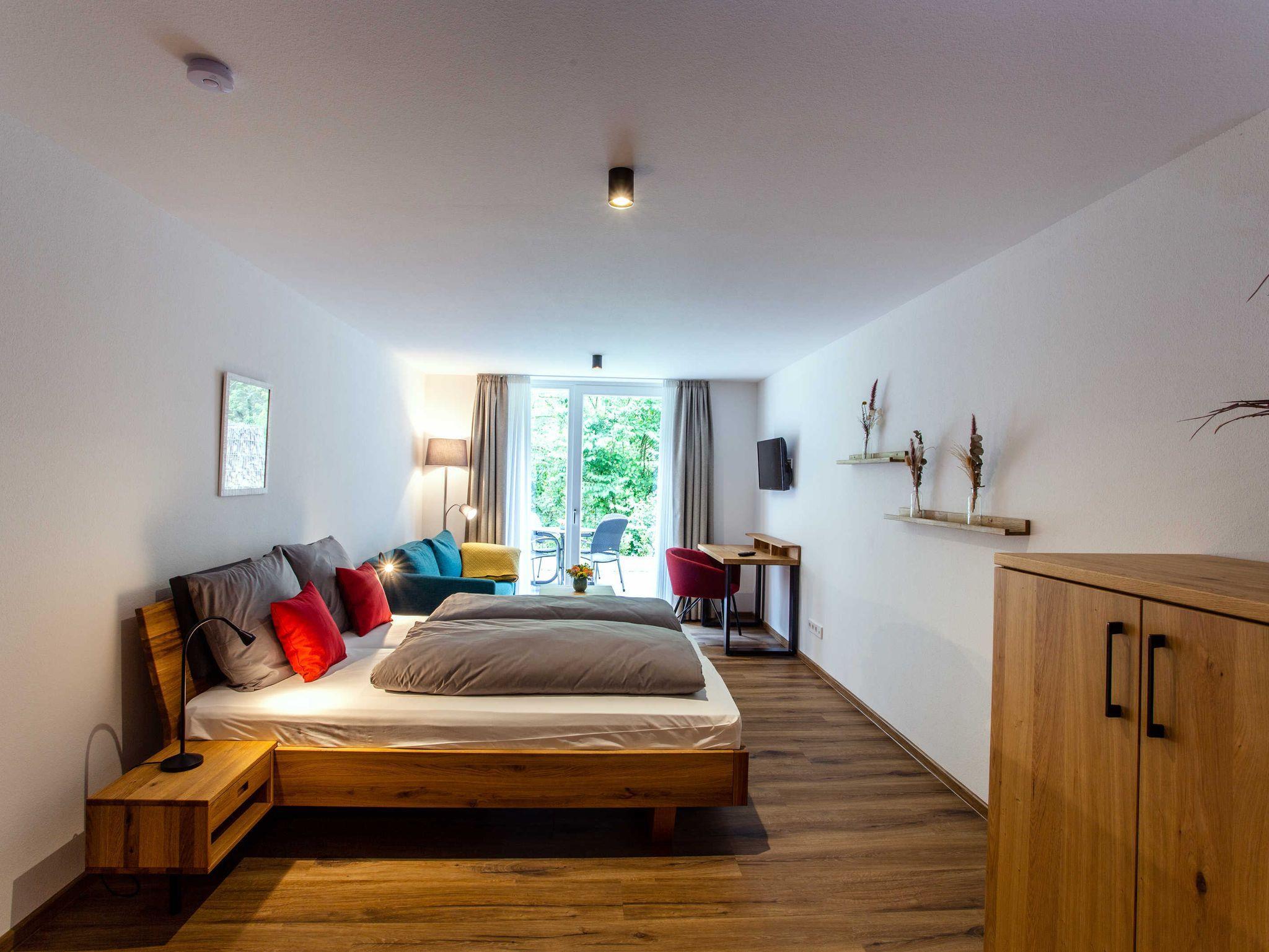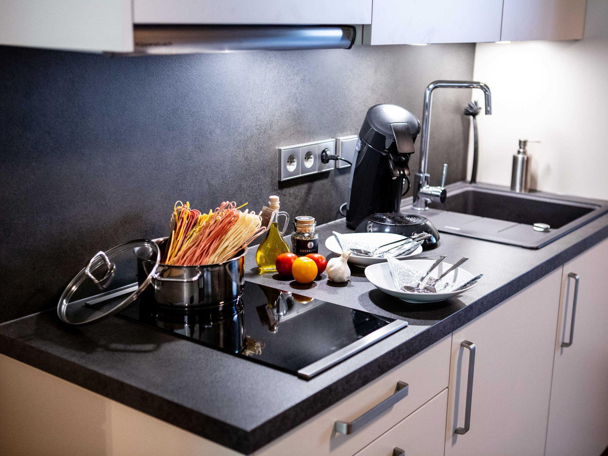 Unsere Ein-Zimmer-Ferienwohnungen haben 40-43 m² und sind Nichtraucherwohnungen. Darüber hinaus gibt es zwei barrierefreie Wohnungen, welche im Erdgeschoss des Hauses liegen. Alle verfügen über ein Doppelbett und ein Schlafsofa, eine Küchenzeile mit 2-Platten-Induktionsherd, eine Terrasse, Dusche/WC, SAT-TV-Flatscreen und W-LAN.