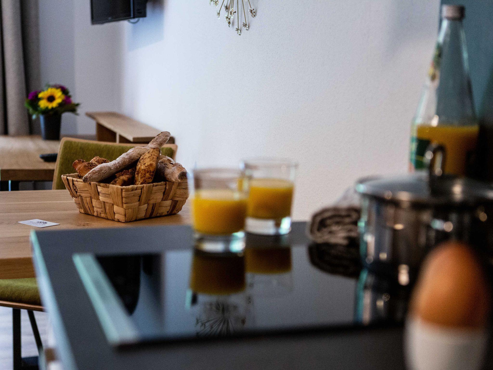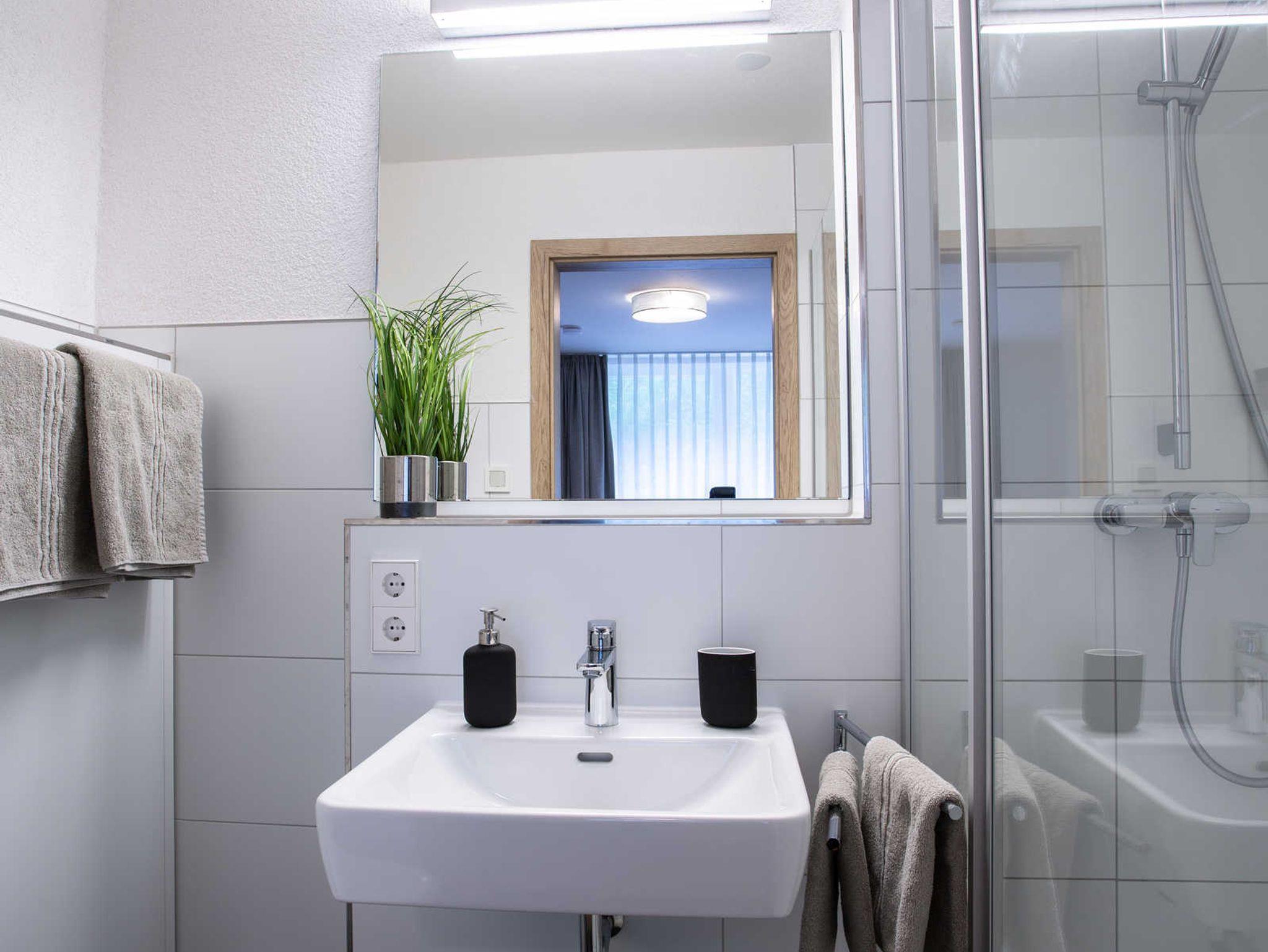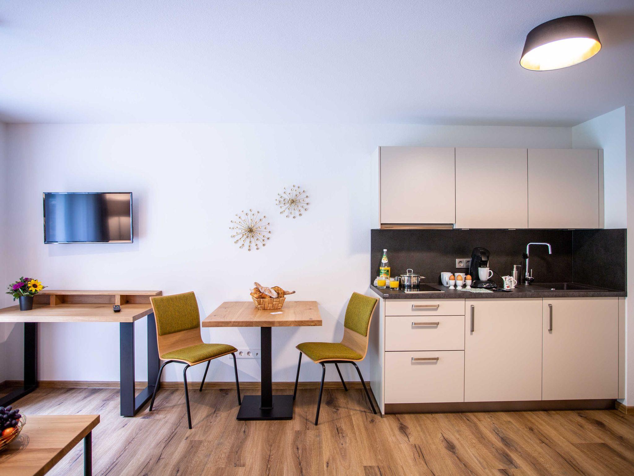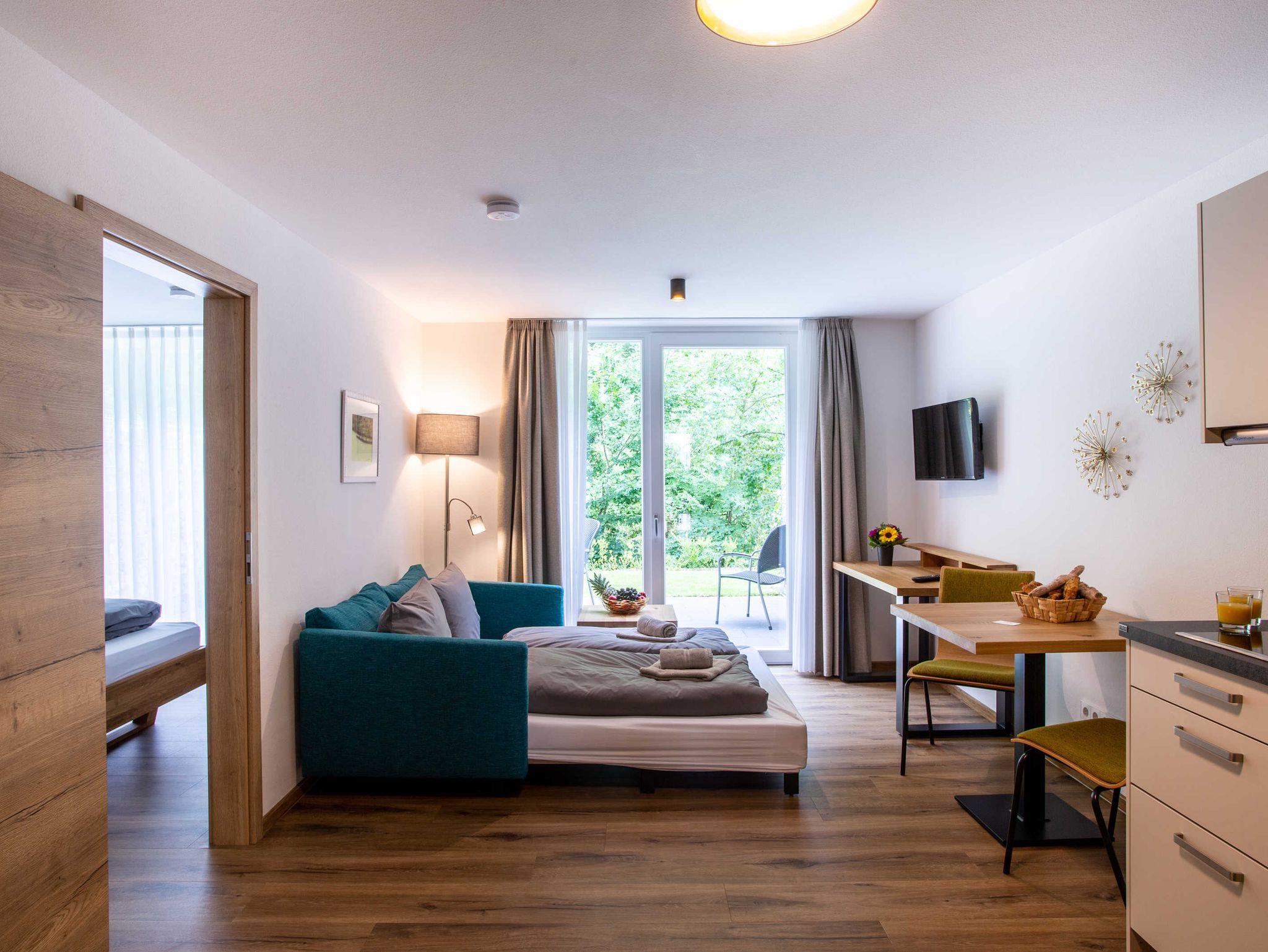 Unsere Zwei-Zimmer-Ferienwohnungen von 36 bis 50 m² sind Nichtraucherwohnungen und verfügen über ein Schlafzimmer mit Doppelbett, ein Wohnzimmer mit Schlafsofa, eine Küchenzeile mit 2-Platten-Induktionsherd, teilweise mit Balkon oder Terrasse, Dusche/WC, SAT-TV-Flatscreen und W-LAN.