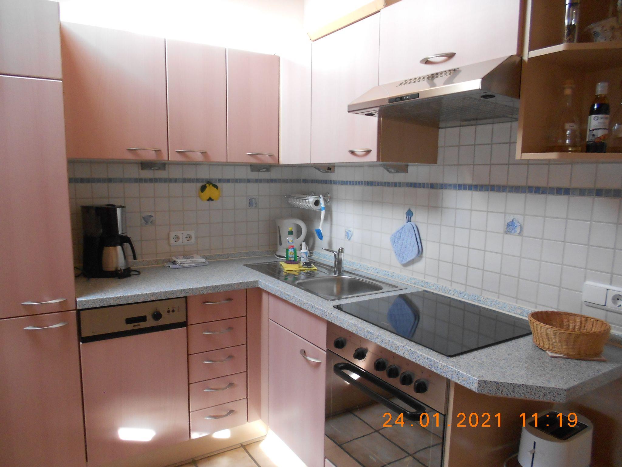 Einbauküche extra. Ausgestattet mit Kaffeemaschine, Toaster, Herd mit Ceranfeld und 4 Kochplatten sowie Backofen, Geschirrspülmaschine, Wasserkocher, Brotschneidemaschine, Kühlschrank, Radio, Sitzecke.
