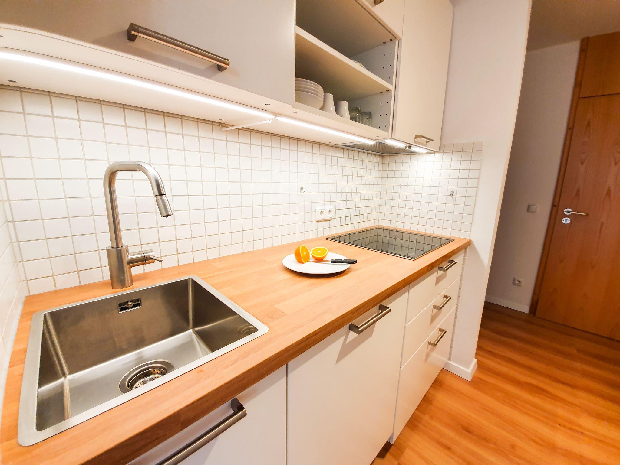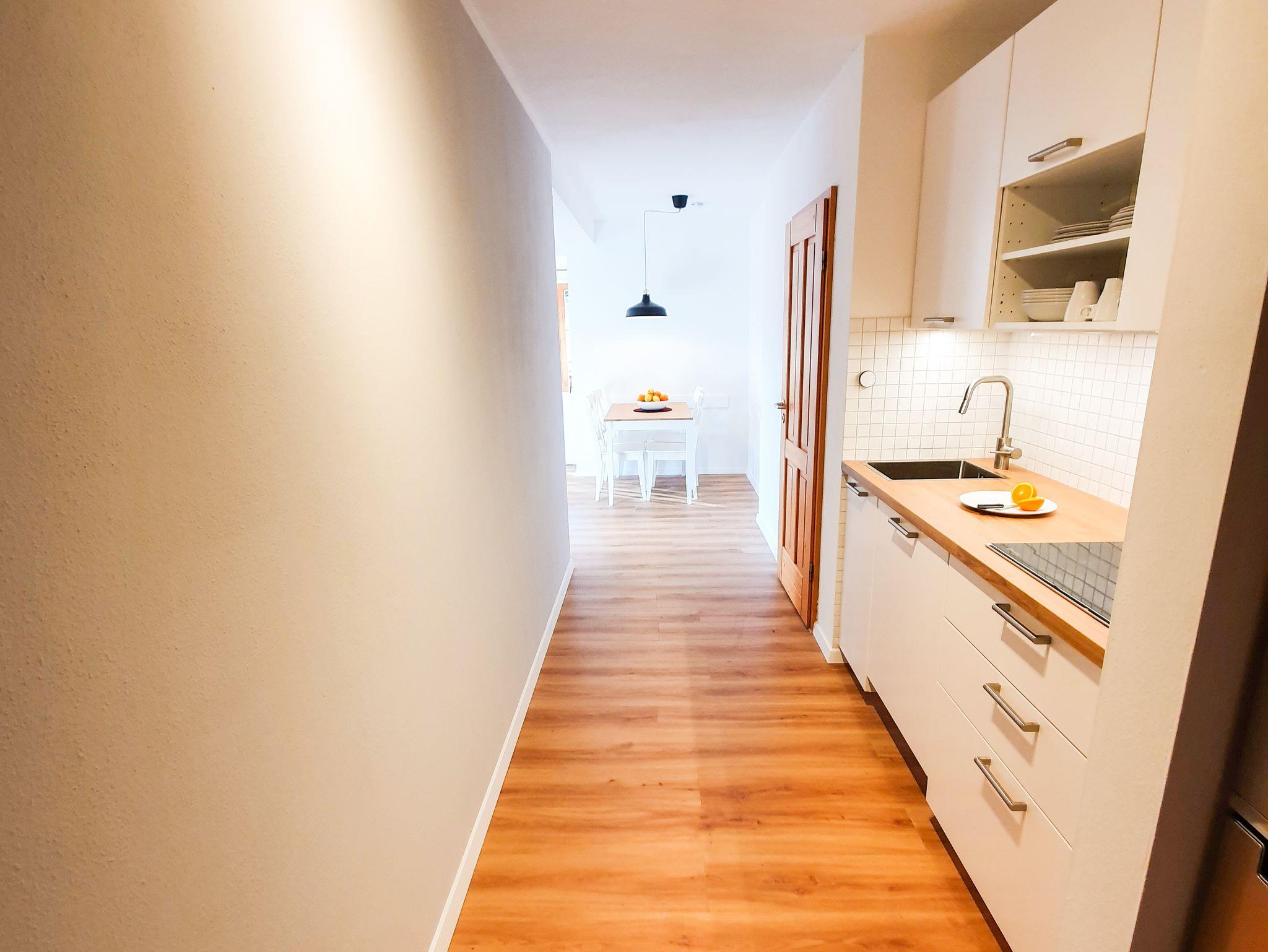 Neben dem großzügigen Wohnzimmer mit 2 Balkonen finden Sie in der unteren Etage eine komplett ausgestattete Küche - mit neuer SENSEO Kaffeepad-Maschine -, einem Essbereich sowie ein Duschbad mit Fußbodenheizung. Im oberen Stockwerk sind die zwei Schlafzimmer mit Doppelbetten a 180x200 und 140x200 cm. Beide Schafzimmer wurden mit neuen Fenster mit Sonnenschutzfolien und Ventilatoren ausgestattet.