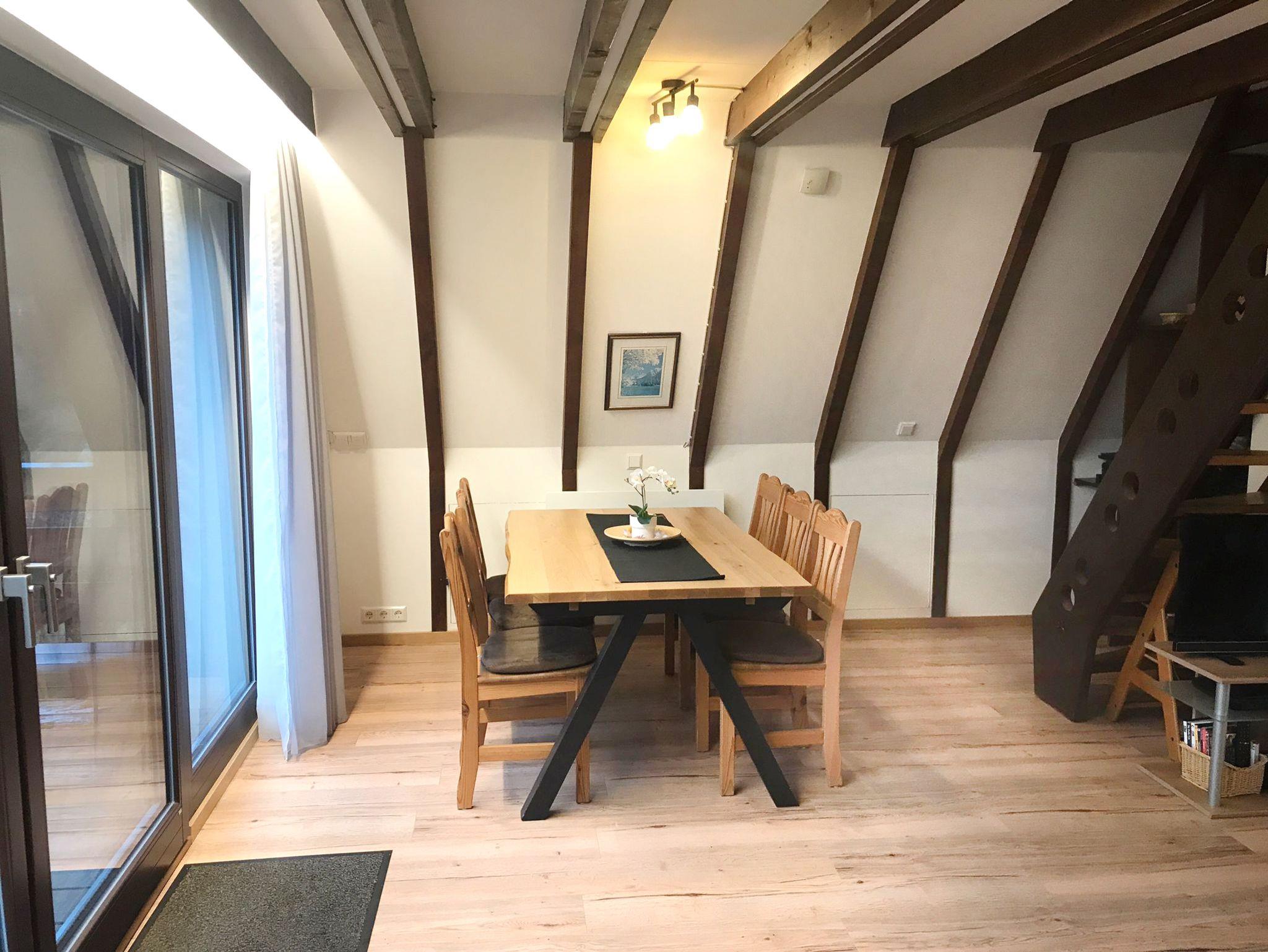 Im Erdgeschoss befindet sich das Wohnzimmer, ca 35 m², mit Glasfront nach Süden und großem Balkon. Gemütliche Sitzgarnitur (ausklappbar) und Essecke. Die Einbauküche ist durch einen Bartresen vom Wohnzimmer abgeteilt.