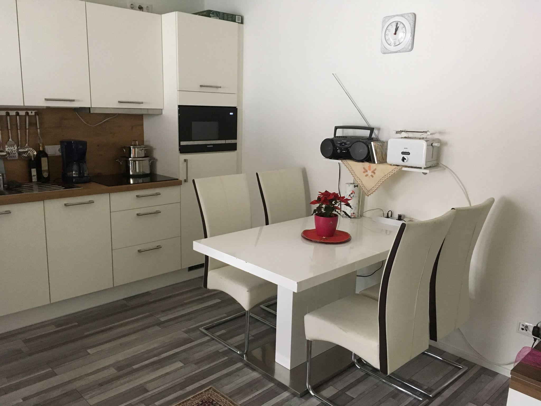 Die kleine Wohnung hat neben einem Wohnzimmer mit Schlafcouch, Essbereich und Küche ein Schlafzimmer, ein Duschbad und einen kleinen Flur. Bei schönem Wetter könnt Ihr die Terrasse mit Sitzbank, Tisch und Stühlen gern nutzen. Grillen ist ausdrücklich erlaubt. Das Haus ist neu und somit die Wohnung auch modern eingerichtet. Neben schnellem WLAN gibt es digitales Fernsehen, eine voll ausgestattete Küche und Fußbodenheizung für kalte Tage.