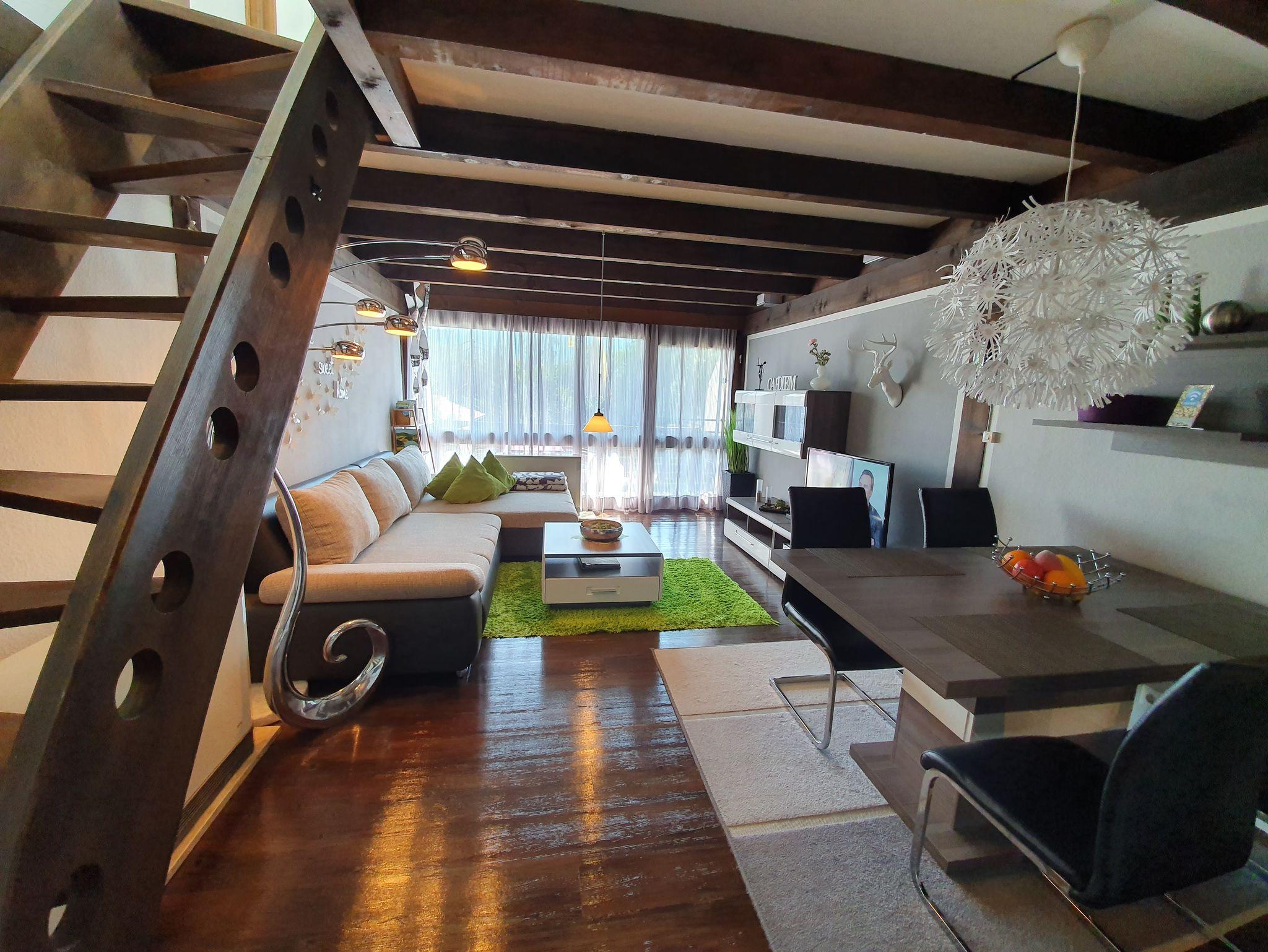 Das liebevoll eingerichtete Appartement, welches sich über zwei Etagen erstreckt (56 m²), kann mit 4 Personen bewohnt werden. Zur Not findet eine 5. Person noch Platz auf der ausziehbaren Couch.