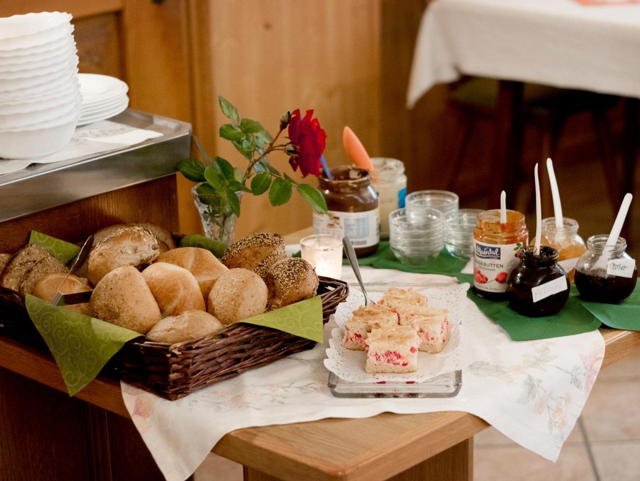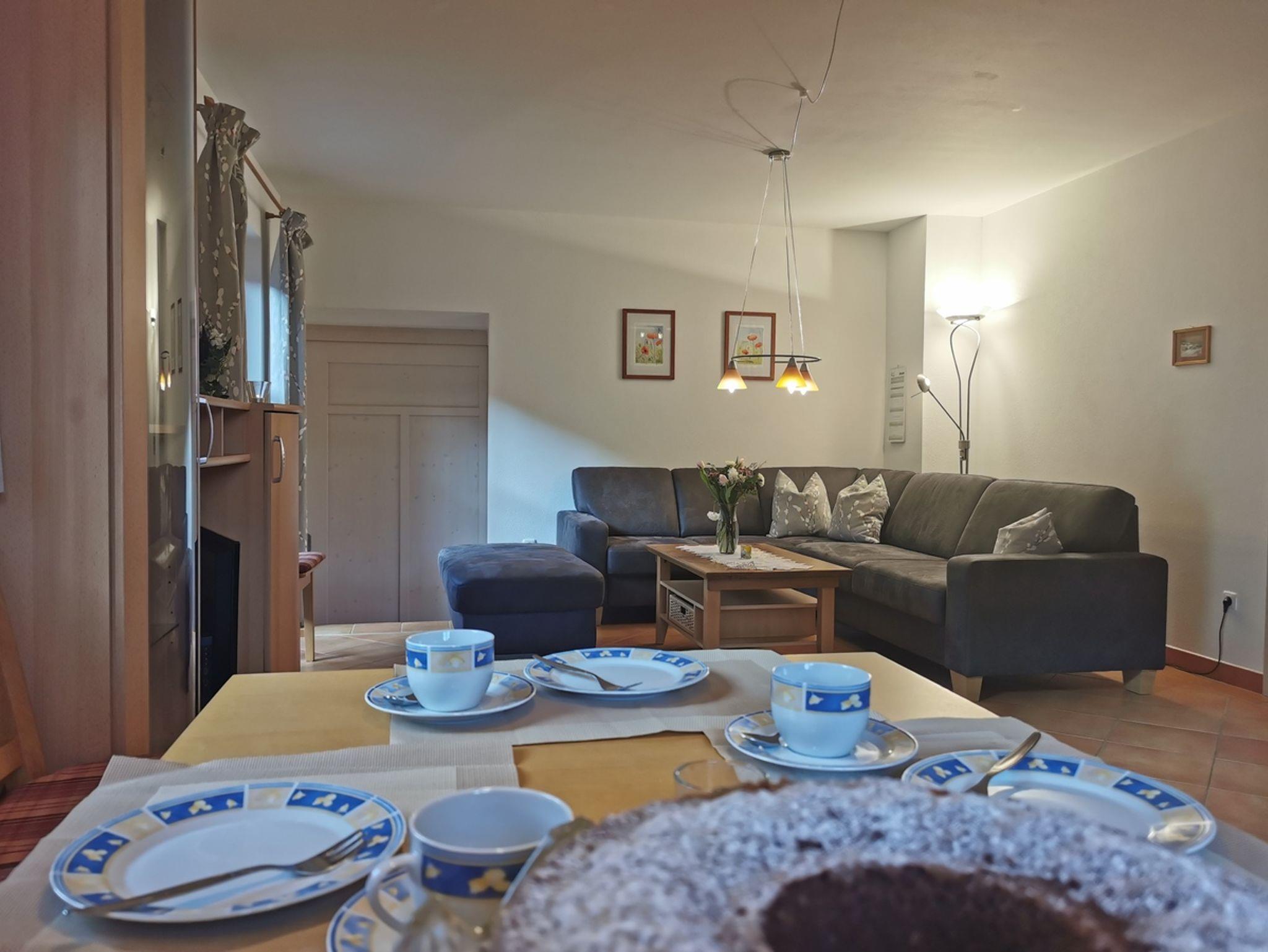 Die Ferienwohnung Hänsel im Erdgeschoß und Untergeschoß des Zuhauses bietet auf 106 m² viel Raum für die ganze Familie. Mit ihren drei Schlafzimmern finden auch große Familien mit bis zu 6 Personen bequem Platz. Im Erdgeschoß sind Küche und Wohnzimmer, Eltern- und Kinderzimmer sowie eine Diele mit WC untergebracht. An der Süd- und Westseite liegt die großflächige Terrasse mit Blick auf unverbaute Natur und unsere Berge. Diese Terrasse steht Ihnen zur alleinigen Nutzung mit Sitzgelegenheiten zur Verfügung. Im Untergeschoß befindet sich ein weiteres Schlafzimmer sowie das Badezimmer. Aus Rücksichtnahme auf unsere Gäste sind Haustiere im Zuhaus nicht erlaubt.