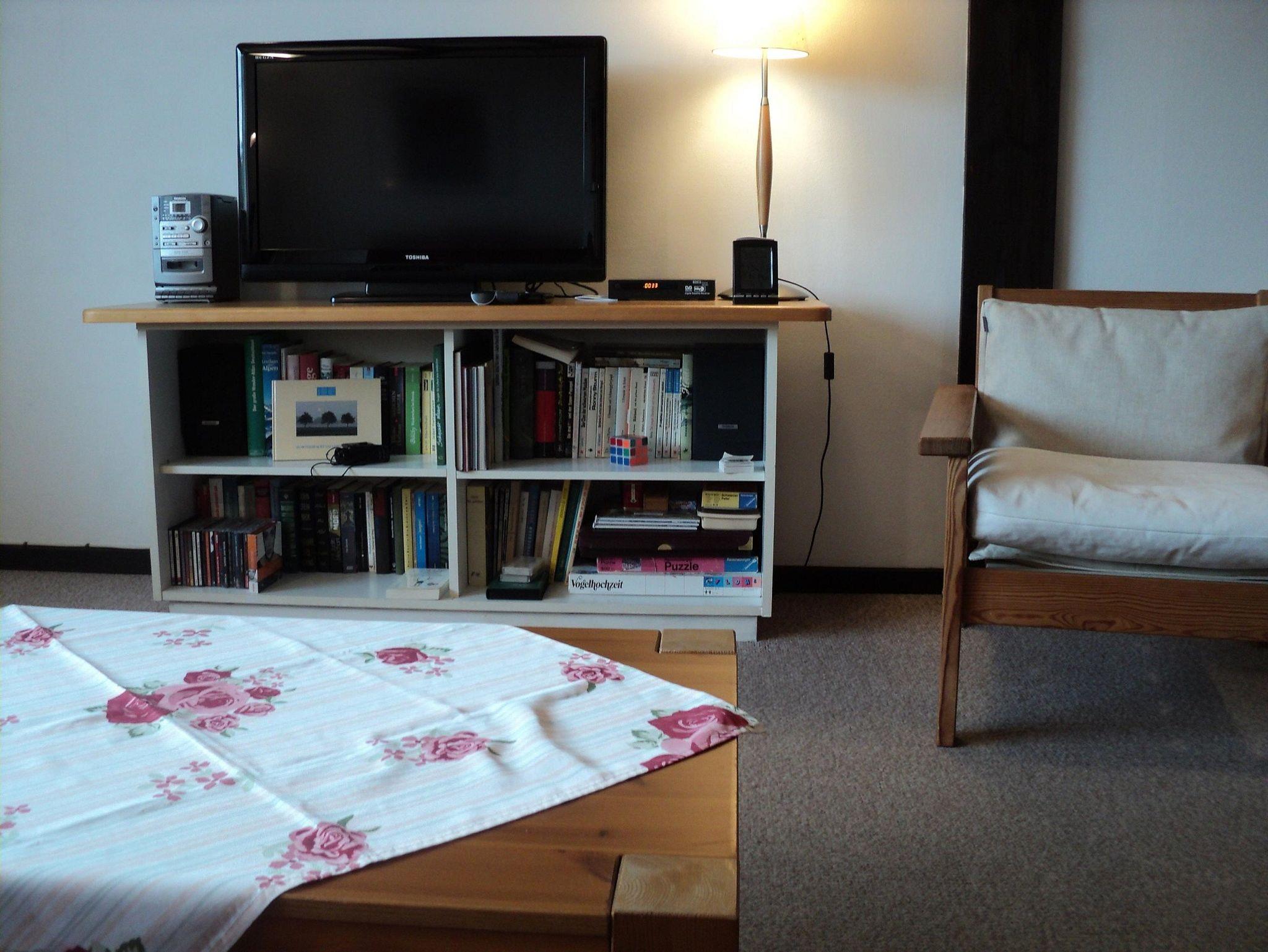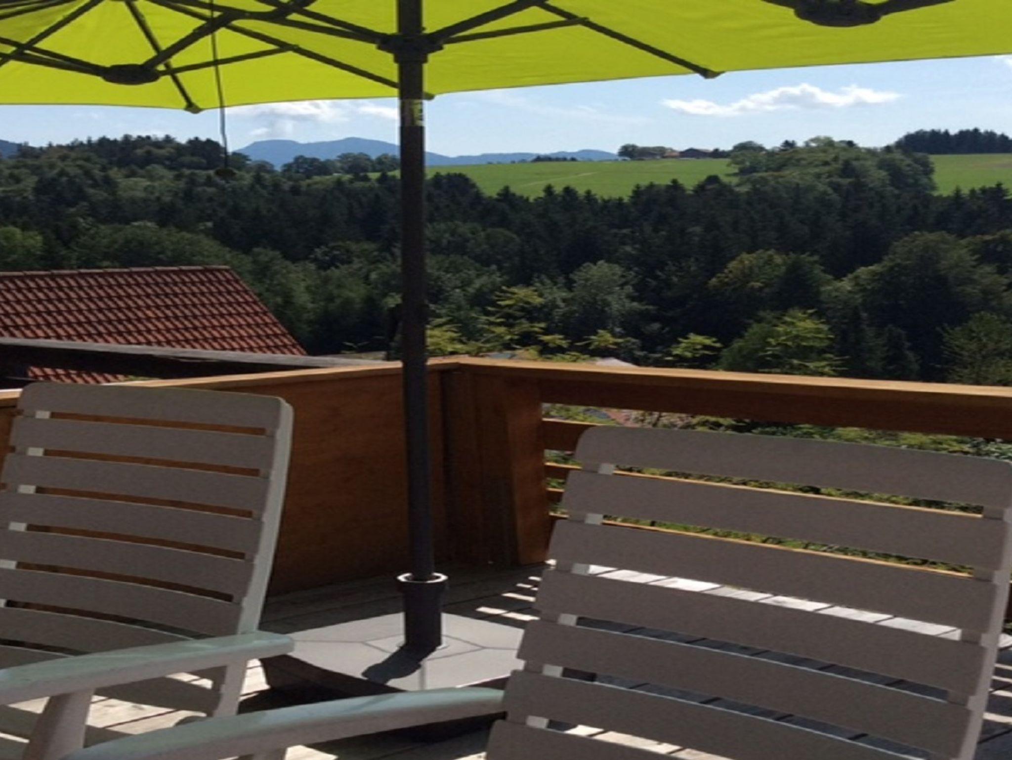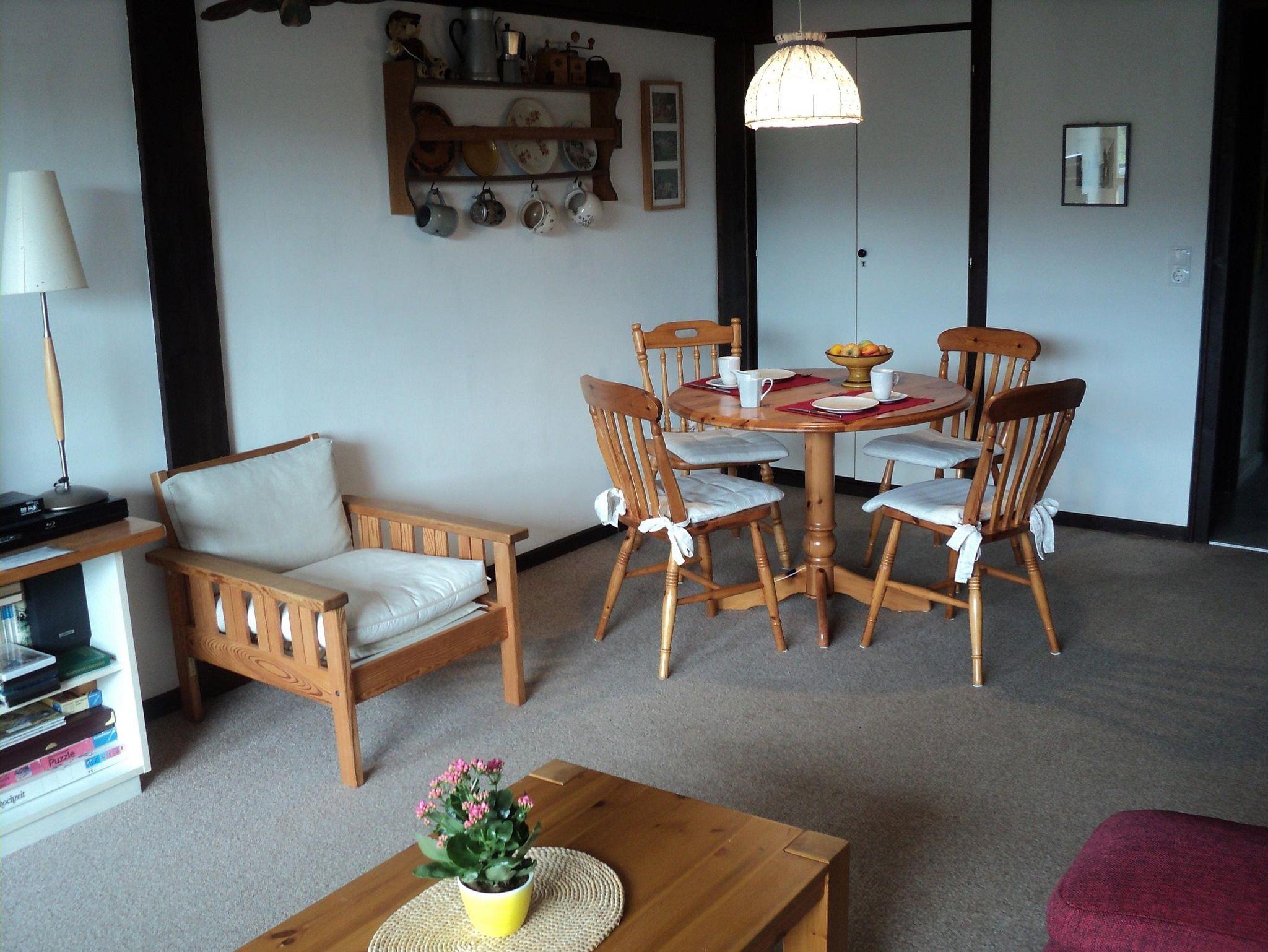 Gemütliches Appartement im Holzhaus mit eigenem Eingang für bis zu 4 erwachsene Personen (68 m²) über 2 Etagen, 2 Balkone m. Sitzmöbel davon ein Balkon mit Markise, der andere mit Sonnenschirm, Nachtspeicherheizung, Nichtraucherwohnung. Weiter Blick auf Wiesen und Berge, ruhige Lage, PKW oder Rad erforderlich. Erdgeschoss: kleiner Flur, neue gut ausgestattete separate Küche mit 3-Platten-Ceranherd, Kühlschrank***, Mini-Backofen, Mikrowelle, Bad mit Dusche u. WC, Fön. Wohn- und Schlafraum mit ausziehbarer Doppelcouch, Essecke, Sitzecke mit Sofa, Sat.-TV, DVD und Blue-ray, Radio, Regal mit Spielen und Büchern (in deutsch u. englisch) für Kinder und Erwachsene. Obergeschoss: Über eine offene Holztreppe gelangen Sie zum abgeschlossenen Schlafraum, Doppelbett (2 x 80 cm x 200 cm) und ein Einzelbett (90 cm x 200 cm) mit einem darunter befindlichen ausziehbaren Bett in geringer Bodenhöhe für Kleinkinder. Einbauschrank, Regal mit Büchern, Wecker. Anzahlung 50 % des Mietpreises bei Buchung per Überweisung, der Restbetrag ist 14 Tage vor Reiseantritt fällig, die Kaution in Höhe von 200,00 € bei Wohnungsübergabe. Zusätzlich zum Mietpreis anfallende Stromkosten werden nach Verbrauch berechnet.