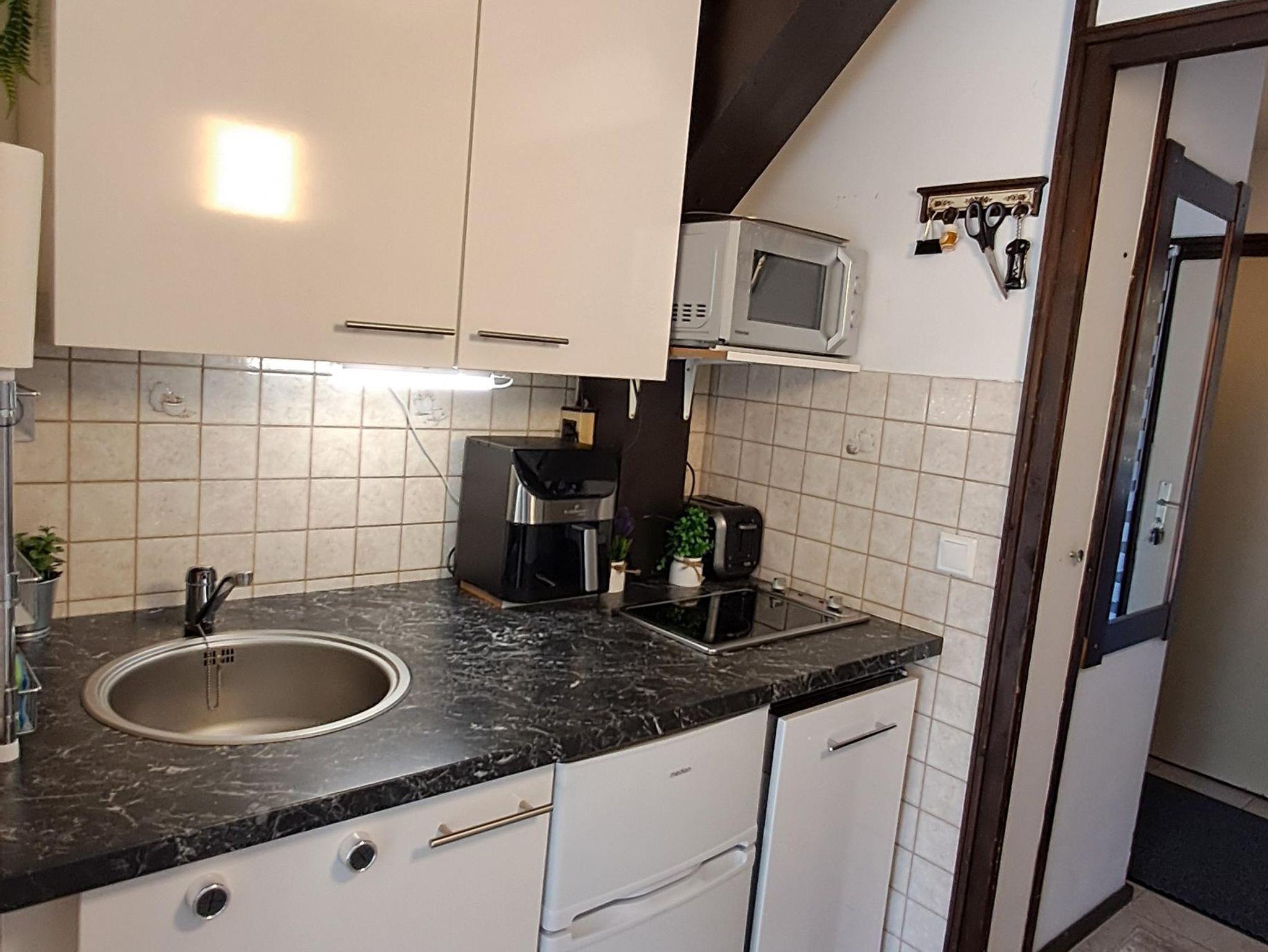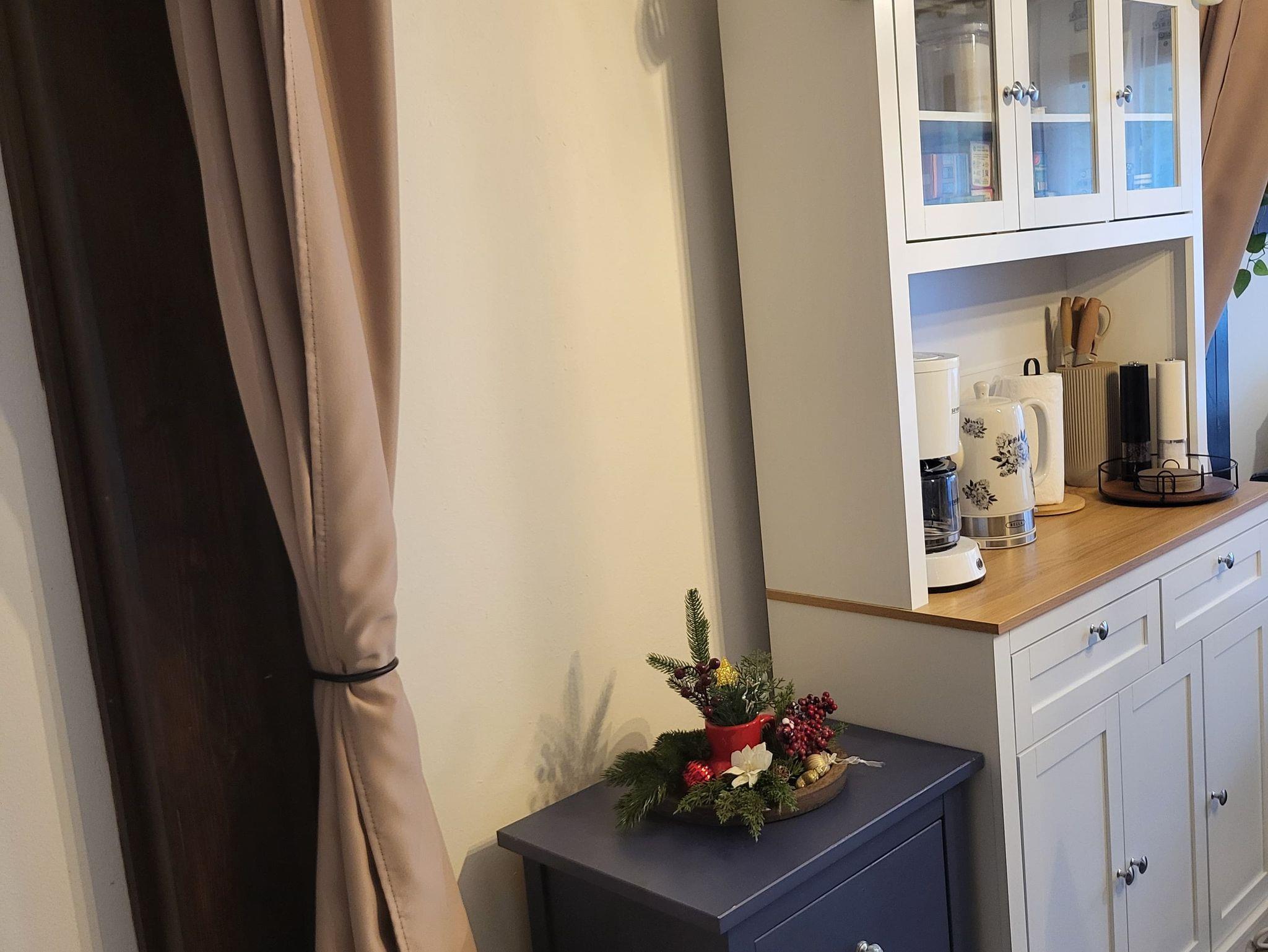 • eine gut ausgestattete Küche mit einem Kühlschrank, Airfryer, einer Herdplatte, einen Toaster und 3 in 1 Sandwichmaker mit Grill und Waffeln, ein Wasserkocher, Kaffeemaschine und einem Geschirrspüler, sowie