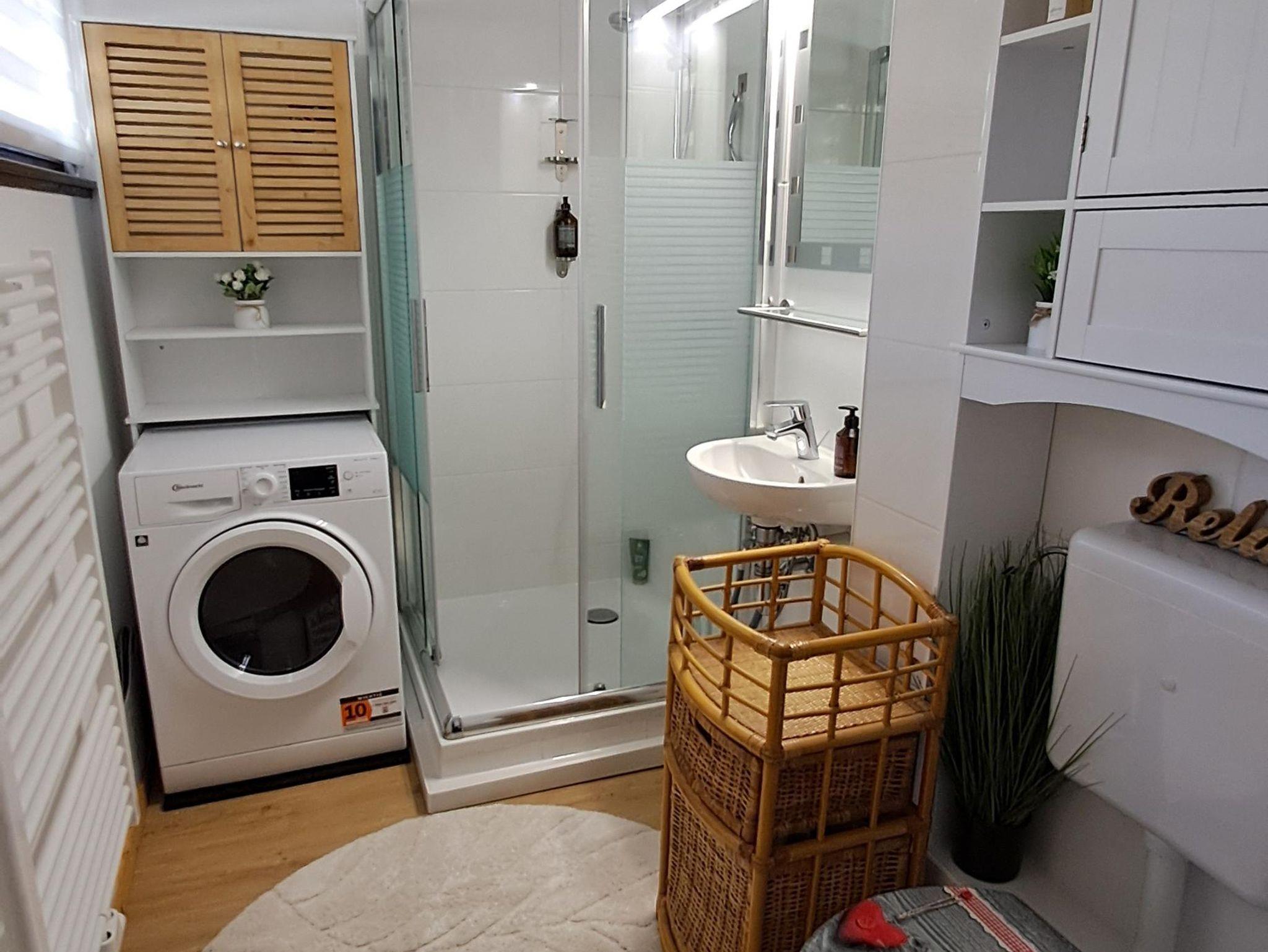 • 1 Badezimmer mit einer Dusche, einem Föhn und Waschmaschine inkl. Trockner