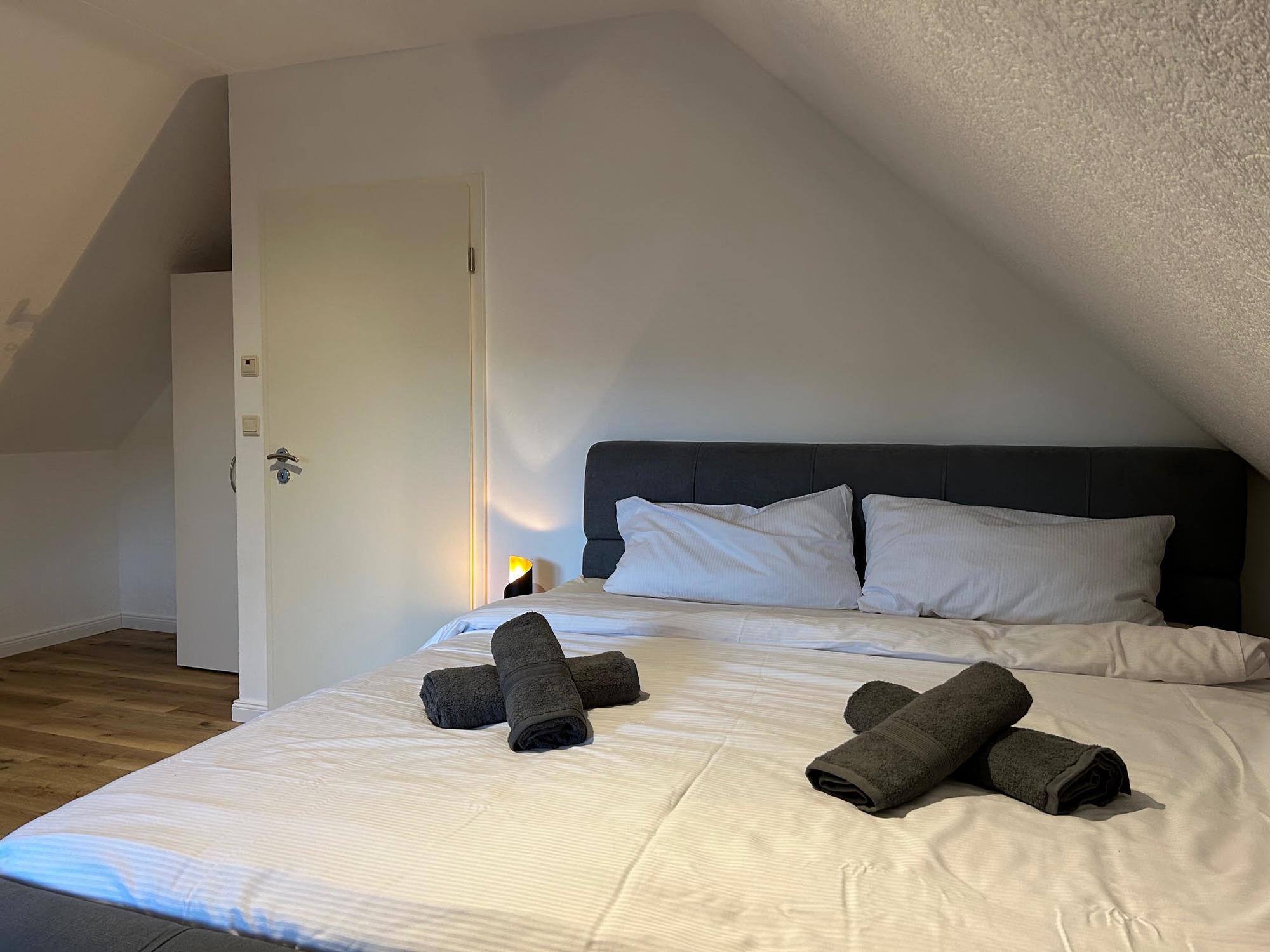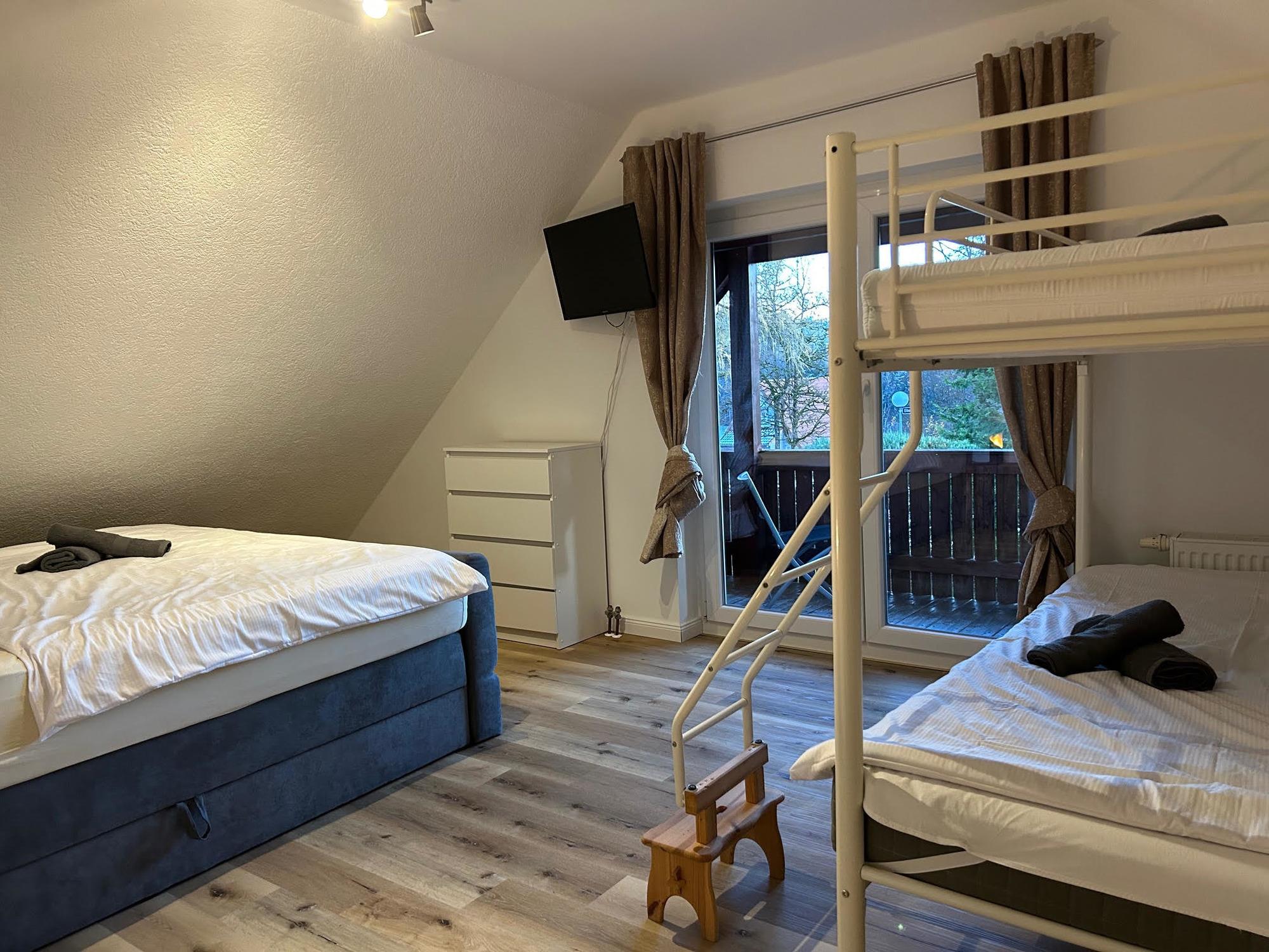 Das Obergeschoss beherbergt das erste Schlafzimmer, ausgestattet mit Etagenbetten in zwei Größen (90 cm x 200 cm und 140 cm x 200 cm) sowie einem komfortablen Doppelbett (180 cm x 200 cm). Im Souterrain befindet sich das zweite Schlafzimmer, ebenfalls mit einem Doppelbett (180 cm x 200 cm) ausgestattet. Für die kleinen Gäste steht ein Kinderzimmer bereit, das mit zwei Etagenbetten in den Größen( 90 cm x 200 cm und 140 cm x 200 cm) eingerichtet ist.