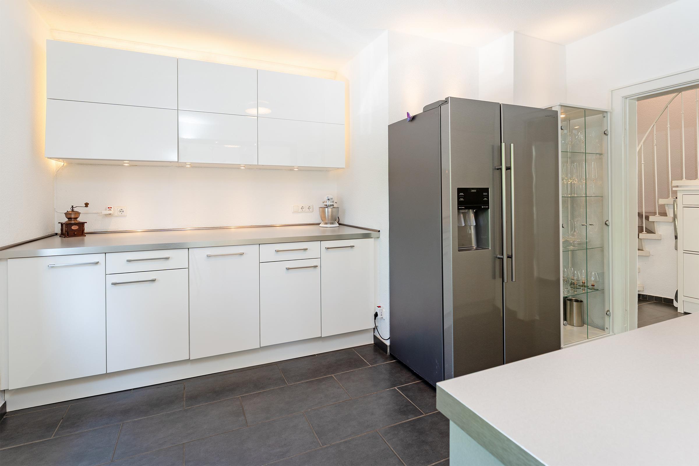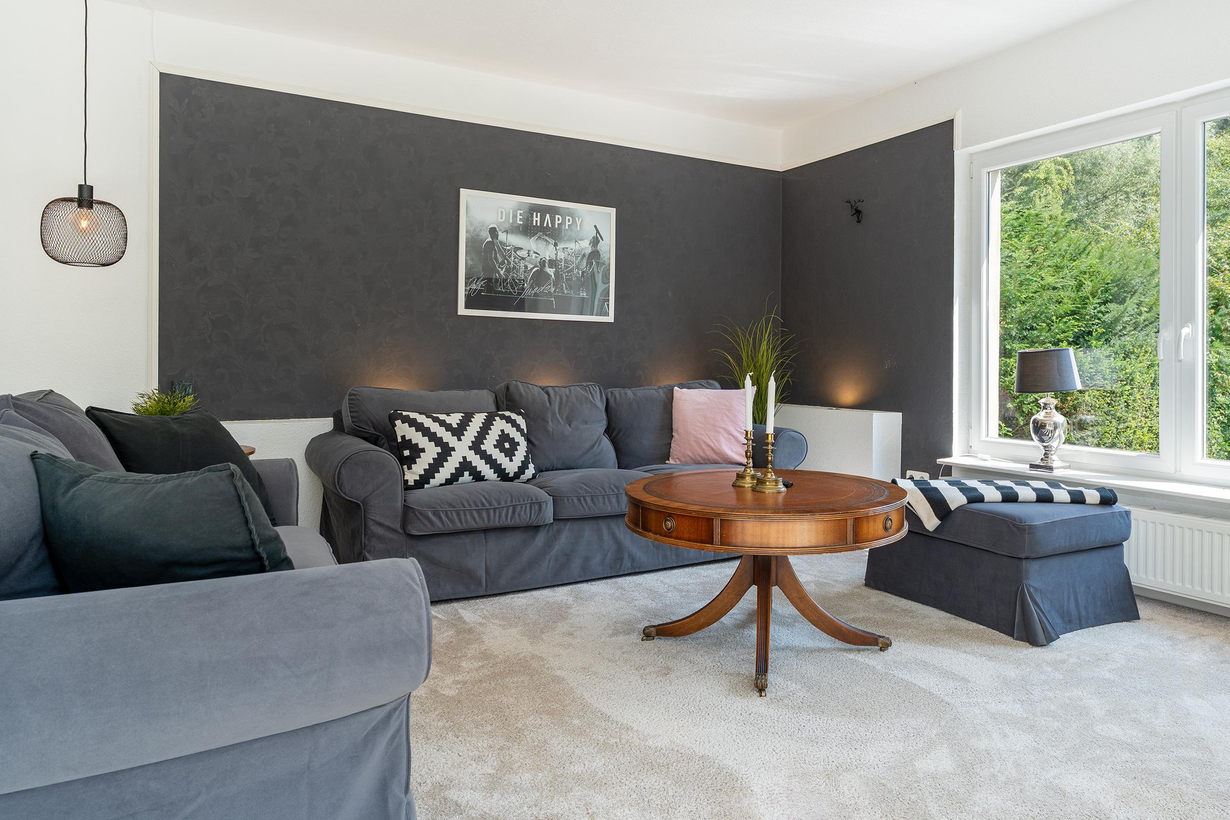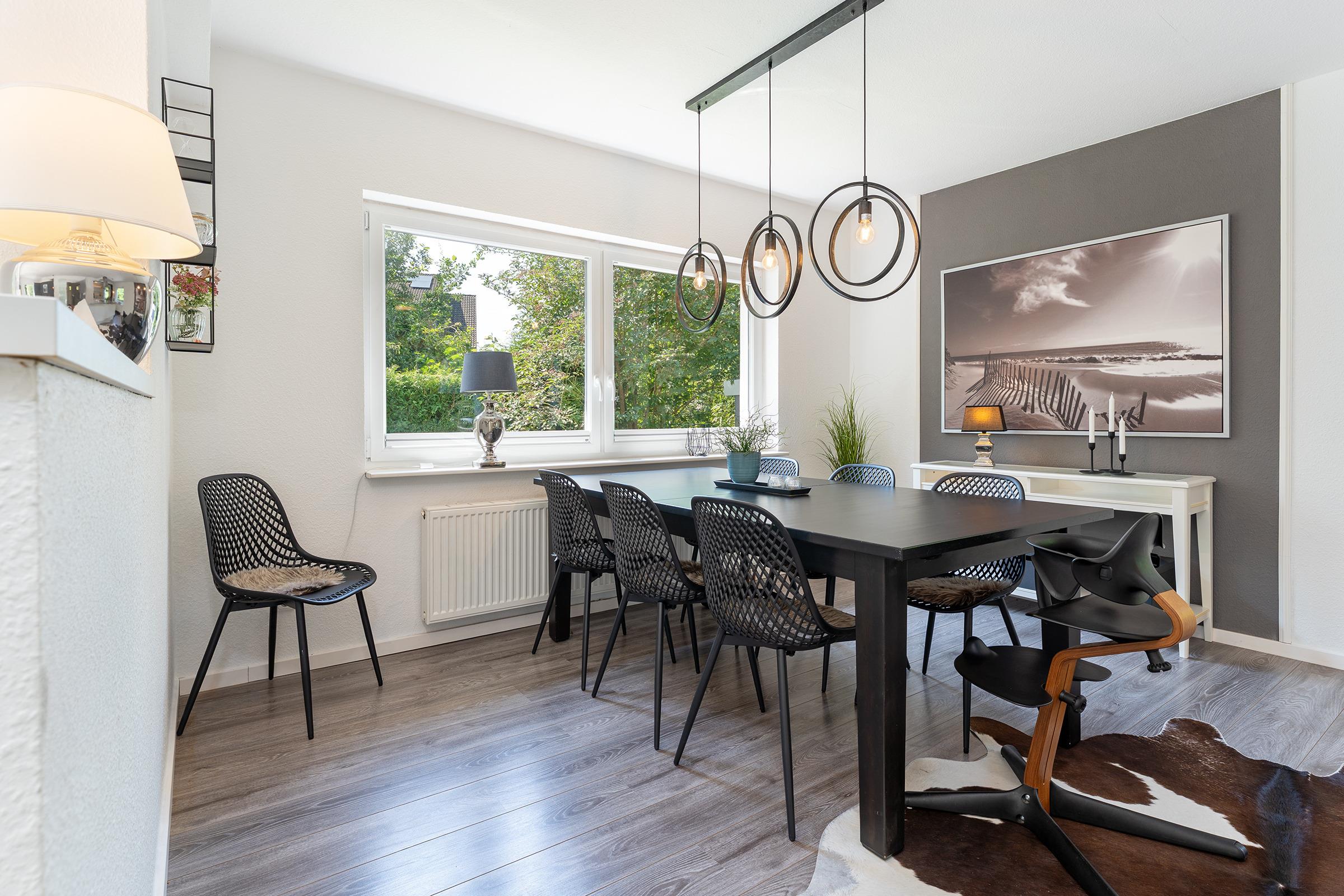 Der einladende Wohnbereich im Erdgeschoss ist das Herzstück des Hauses. Hier entspannen Sie auf einer gemütlichen Couch am wärmenden Kaminofen – ideal für gemütliche Abende. Die angrenzende, offene Küche ist vollständig ausgestattet und lässt keine Wünsche offen. Im Außenbereich erwarten Sie zwei möblierte Terrassen, ideal für Mahlzeiten im Freien oder einen entspannten Abend mit Freunden. Der eingezäunte Garten sorgt für Sicherheit – auch für Ihre Vierbeiner – und bietet mit Schaukel und Trampolin zusätzlichen Spaß für die Kinder.