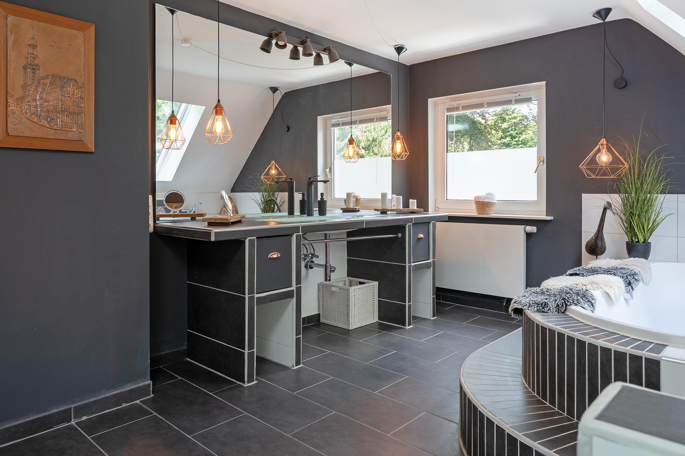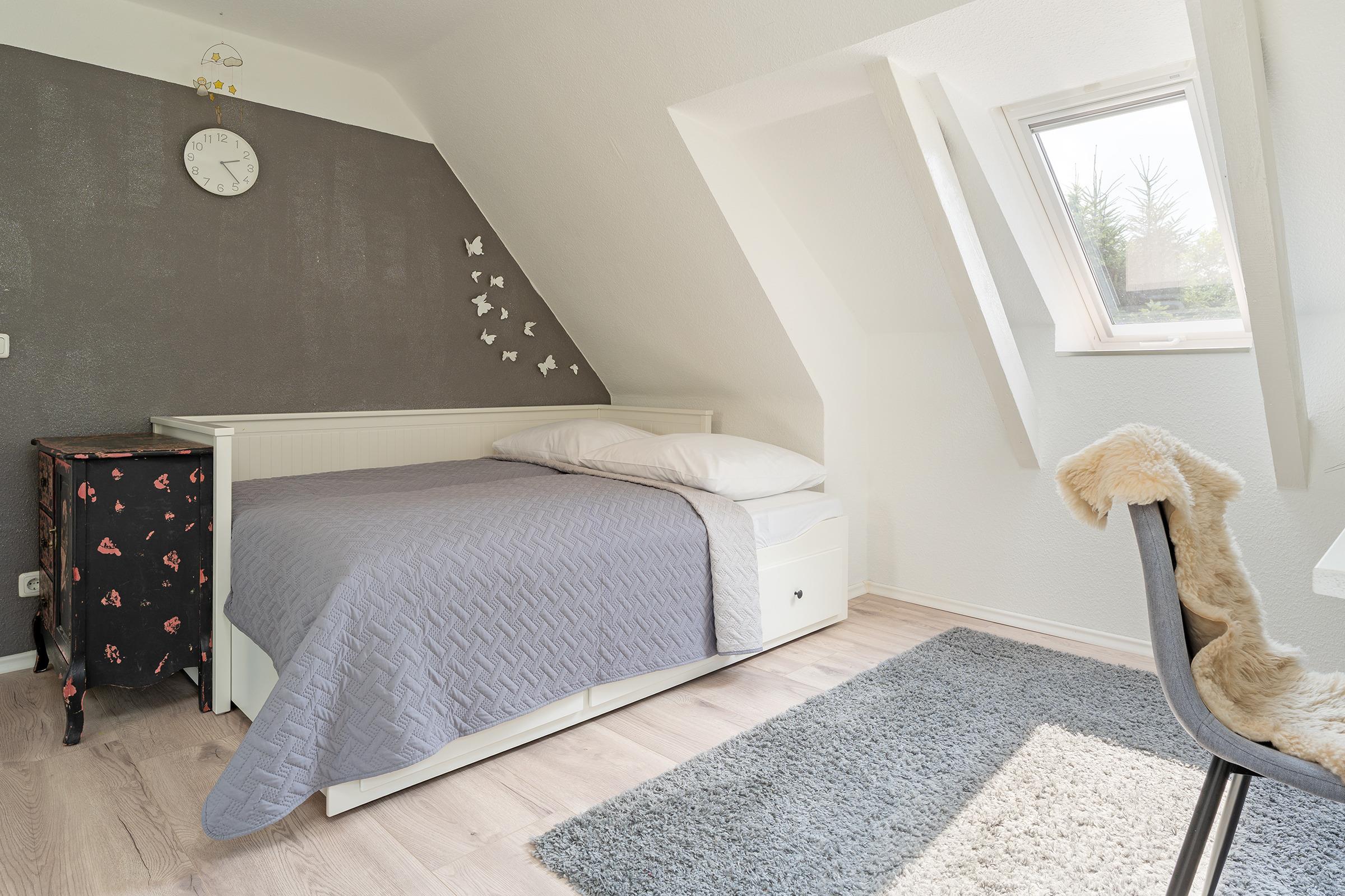 Im Obergeschoss befinden sich drei gemütlich eingerichtete Schlafzimmer: Das erste Schlafzimmer ist mit einem komfortablen Doppelbett (180×200?cm) ausgestattet. Im zweiten Schlafzimmer steht ein weiteres Doppelbett (2x 80×200?cm) zur Verfügung. Das dritte Zimmer bietet ein Schlafsofa (140×200?cm) und eignet sich ideal für Kinder oder flexible Schlafmöglichkeiten. Im Erdgeschoss befindet sich ein weiteres Schlafzimmer mit einem Doppelbett (2x 90×200?cm) – ideal für Gäste, die auf eine ebenerdige Unterkunft angewiesen sind oder einfach mehr Rückzugsmöglichkeiten wünschen. Ihre Urlaubsgarderobe verstauen Sie mühelos im jeweiligen Kleiderschrank. Im Obergeschoss erwartet Sie ein modern ausgestattetes Vollbad. Zusätzlich befindet sich im Erdgeschoss ein praktisches Gäste-WC.