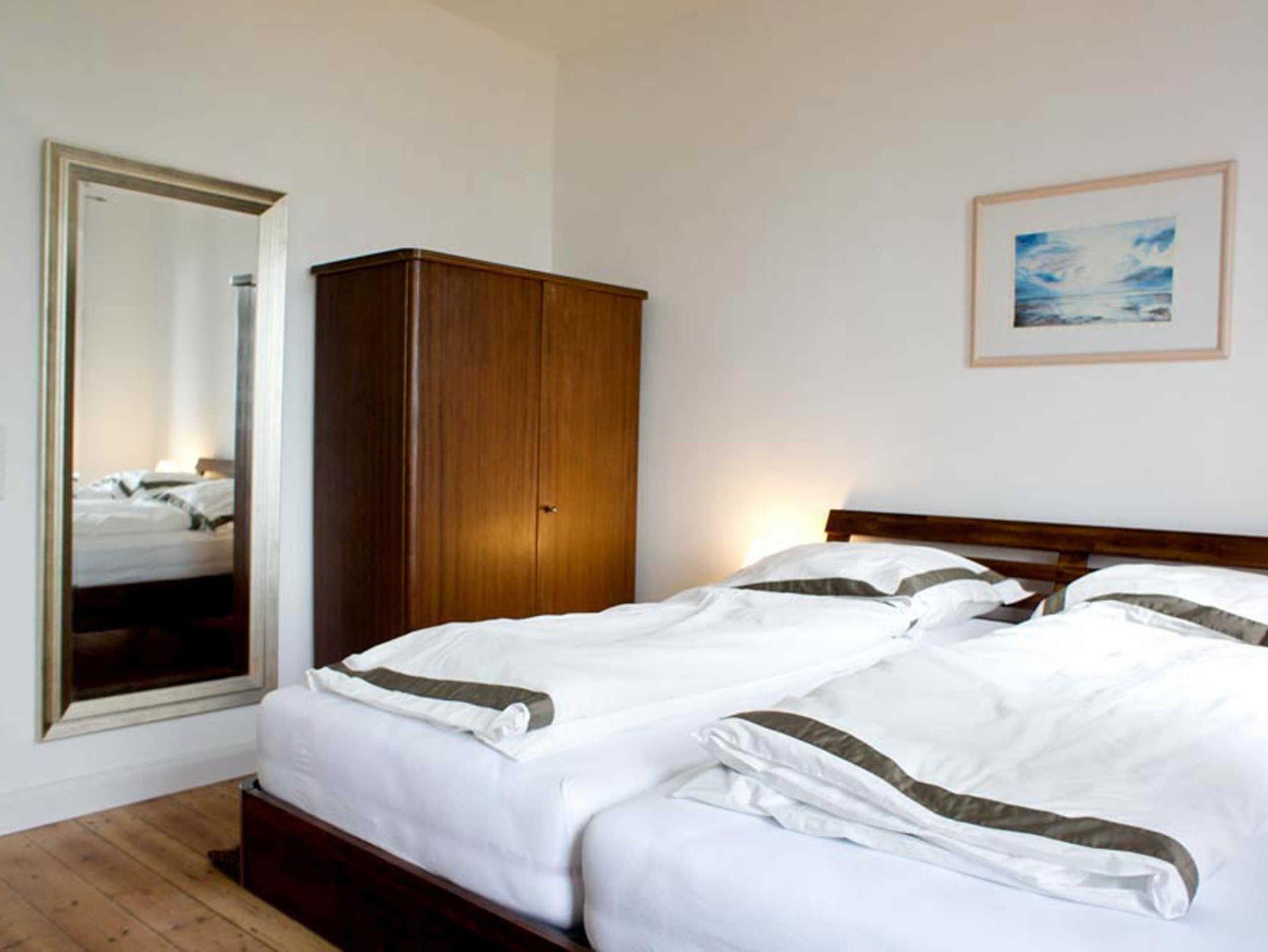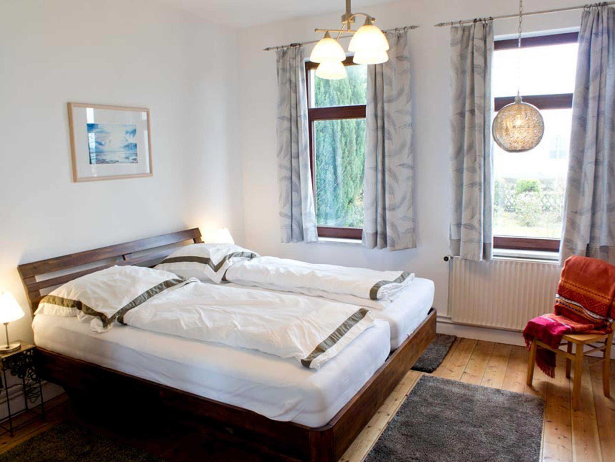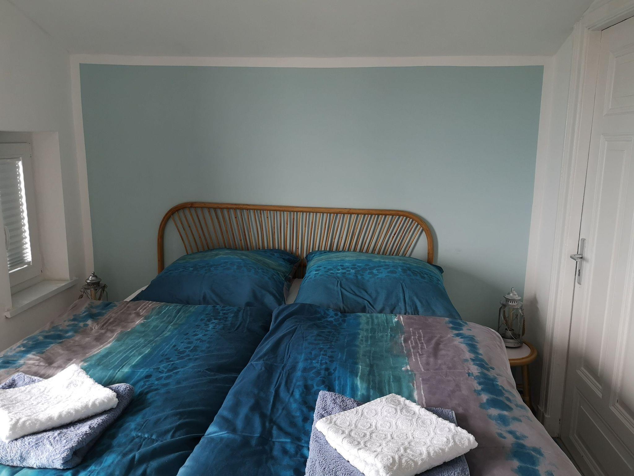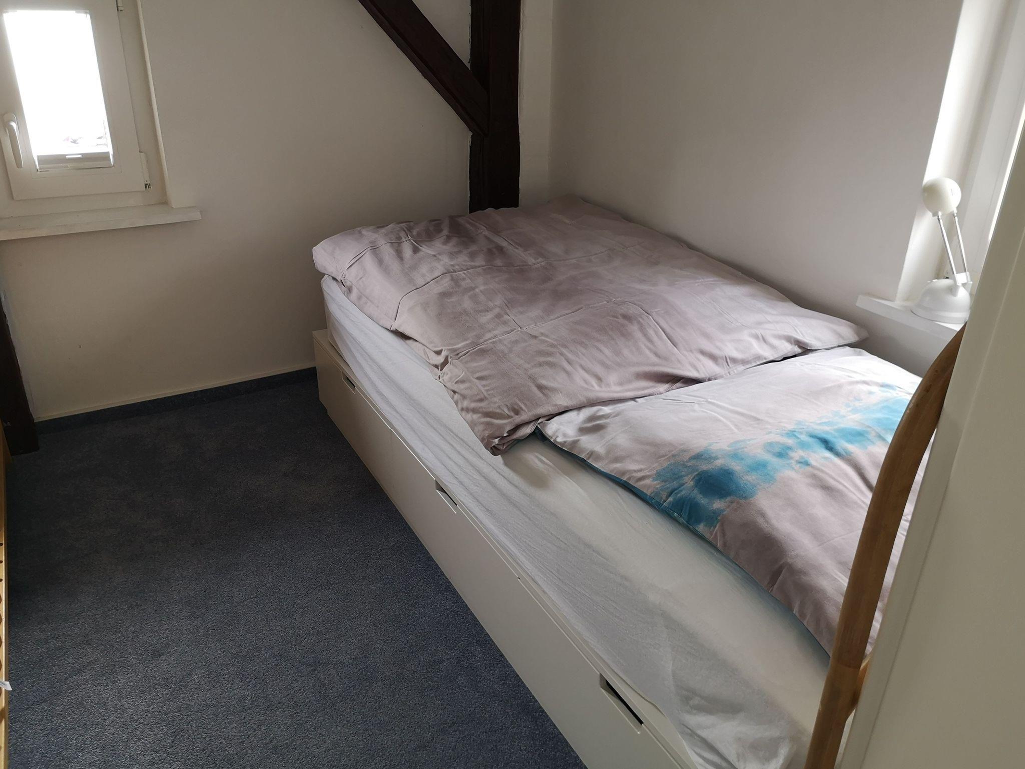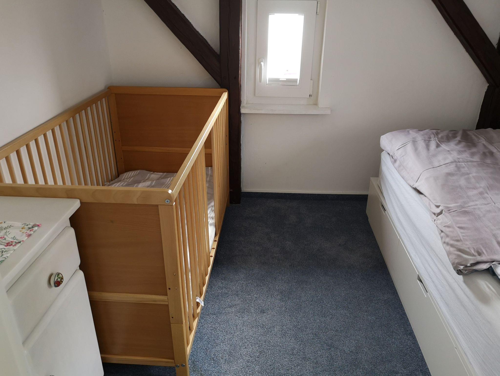 Auf der unteren Wohnebene befindet sich ein Schlafzimmer (Doppelbett) und im Dachgeschoss steht ein weiteres Doppelzimmer mit Aufenthaltsraum zur Verfügung. An das Doppelzimmer (Durchgangszimmer) grenzt ein weiteres kleines Schlafzimmer mit Einzelbett. Ein vorhandenes Kinderbett lässt sich flexibel aufstellen. Im hinteren Bereich der Wohnung bietet eine geräumige und umfangreich ausgestattete Küche die Möglichkeit, sich bei Bedarf selbst zu versorgen.