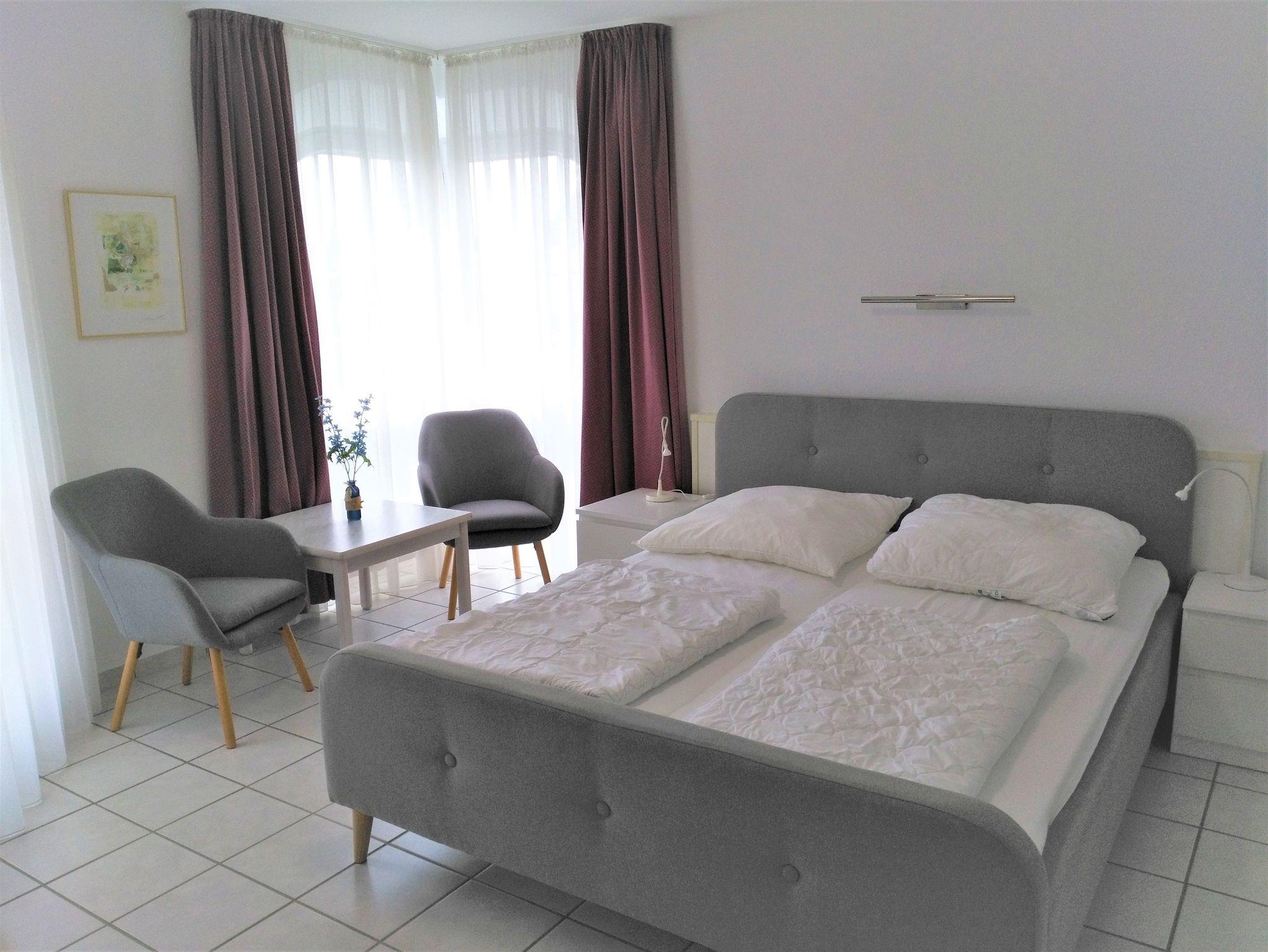 Das 1-Raum-Appartement-Studio befindet sich im 1. OG und besitzt 1 Wohn-Schlafraum, Duschbad, Küchenzeile, Balkon und Meerblick.
