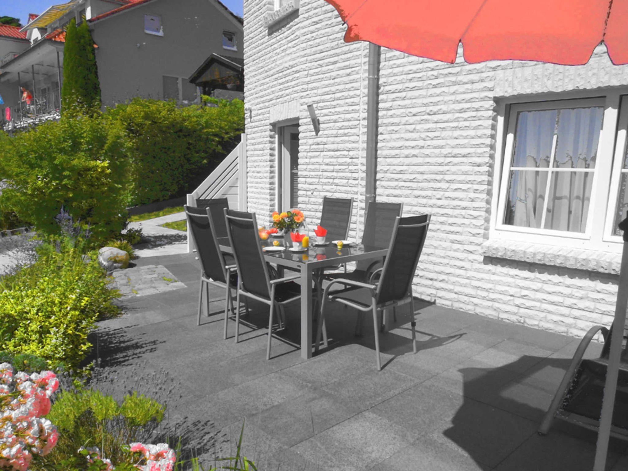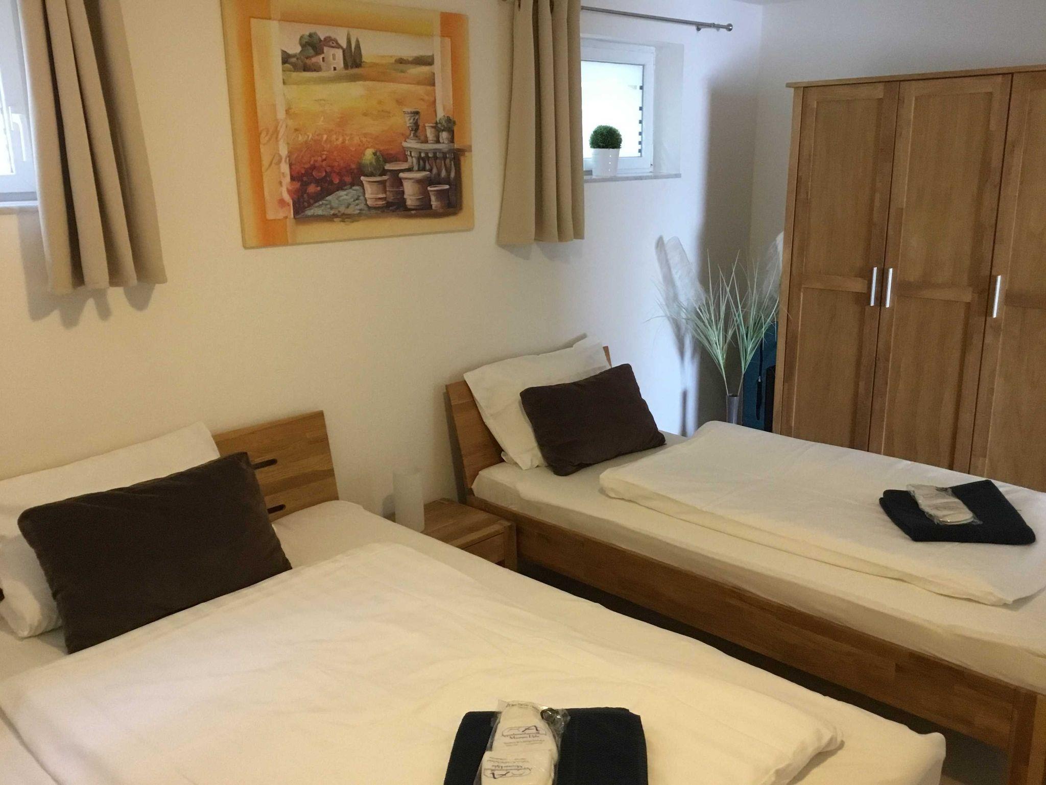 Die ca. 63 m² große Erdgeschosswohnung besitzt einen Wohn-Schlafraum mit moderner Schlafcouch, sowie zwei separate Schlafzimmer: eins mit einem Französischem Bett (140 x 200 cm) und zus. Einzelbett und eins mit zwei Einzelbetten. Ein Zustellbett für ein Kind (bis 3 Jahre) ist möglich. Die sep. Küche ist ausgestattet mit Spülmaschine, Mikrowelle und einer Einbauküche. Eine Terrasse lädt zum Verweilen am Abend ein.