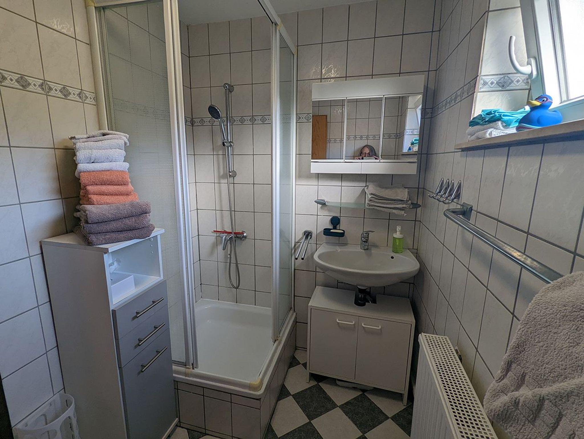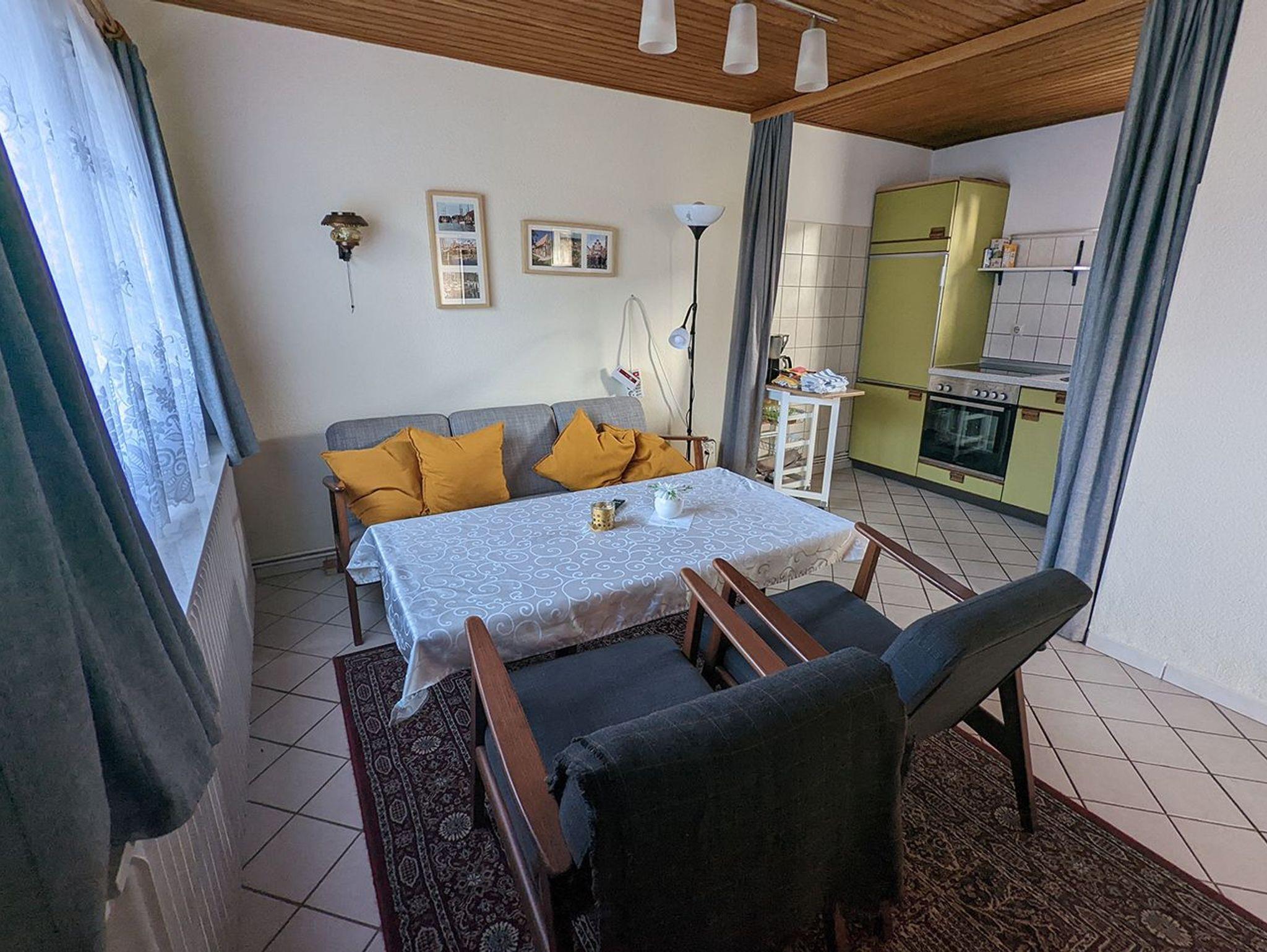 Die ca. 40 m² große Ferienwohnung mit Flur, Wohnzimmer, Duschbad/WC und zwei Schlafräumen ist für 3 Personen geeignet. Sie ist zentralbeheizt, die Böden sind gefliest, im Wohnzimmer liegt ein Teppich. Bad und Doppelzimmer grenzen an das Wohnzimmer. Durch das Doppelzimmer (Durchgangszimmer) erreicht man das zweite Schlafzimmer (Kinderzimmer). Im Kinderzimmer sind Teppichböden und ein Einzelbett (80x200 cm ausziehbar) . Handtücher, Küchentücher und Bettwäsche werden gestellt und wöchentlich gewechselt.