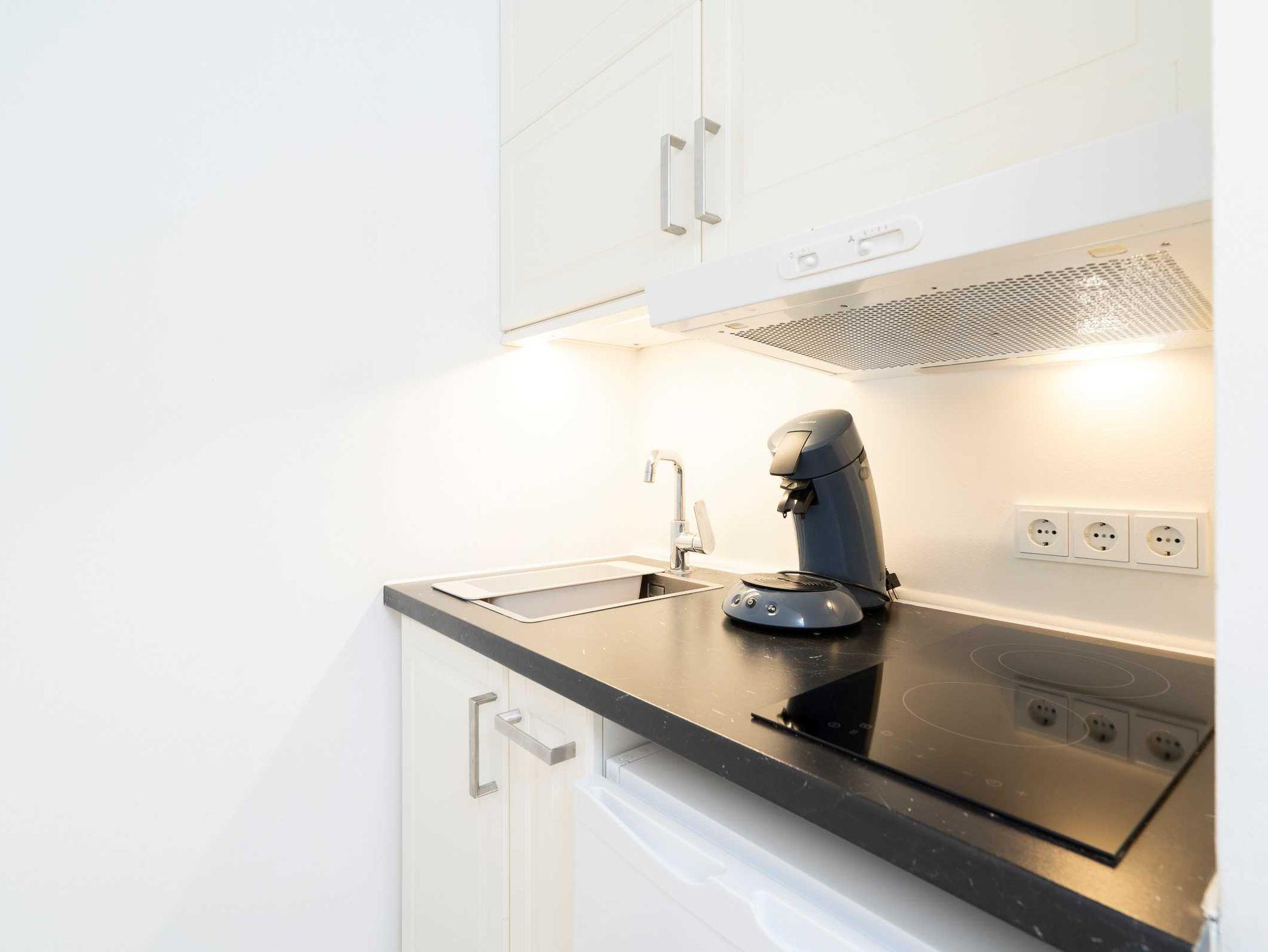 In der Küche befinden sich neben einem 2-Platten-Ceran-Kochfeld und Kühlschrank mit Gefrierfach auch ein Wasserkocher und eine Kaffeemaschine. Es sind ausreichend Geschirr, Töpfe und Pfannen für 4 Personen vorhanden.
