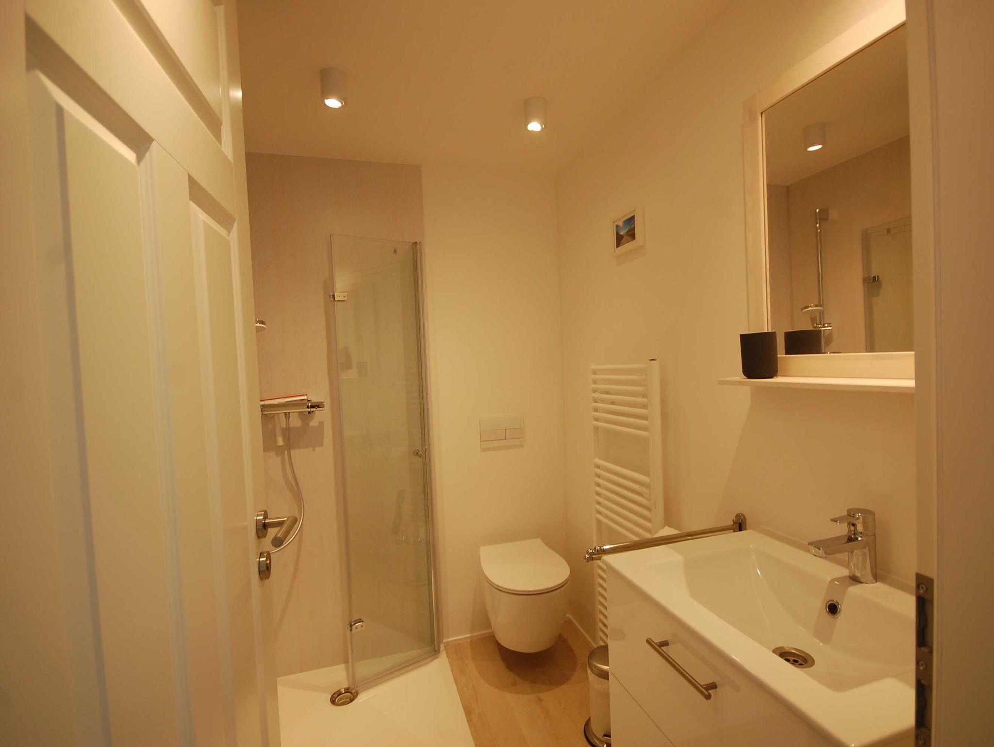 Eine Fußbodenheizung und ein großer Handtuchheizkörper machen es unseren Gäste im Bad gemütlich. Der Boden ist mit Vinyl belegt und die Wände hell geputzt. Die Walk-In-Dusche, das hochwertige WC, der Waschtisch aus Porzellan mit Echtholz-Schrank und eine Schublade mit Steckdose und Föhn machen das Bad perfekt.