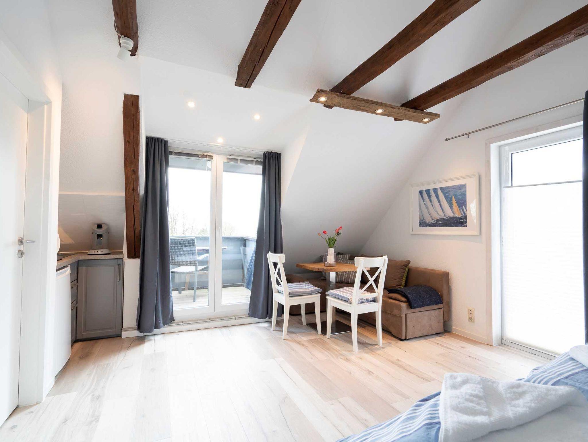 Das Studio wurde im Frühjahr 2022 renoviert und eingerichtet. Hier finden 2 Personen bequem Platz. Die Wohnung besteht aus nur einem Zimmer mit offener Küche, dem Duschbad und zwei Balkonen, die nach Südost und Südwest optimal ausgerichtet sind. Von hier blicken unsere Gäste auf die nur 250 m entfernte Ostsee. Es gibt ein 160 cm breites Doppelbett, einen Esstisch mit 2 Stühlen und ein gemütlichen Sofa.
