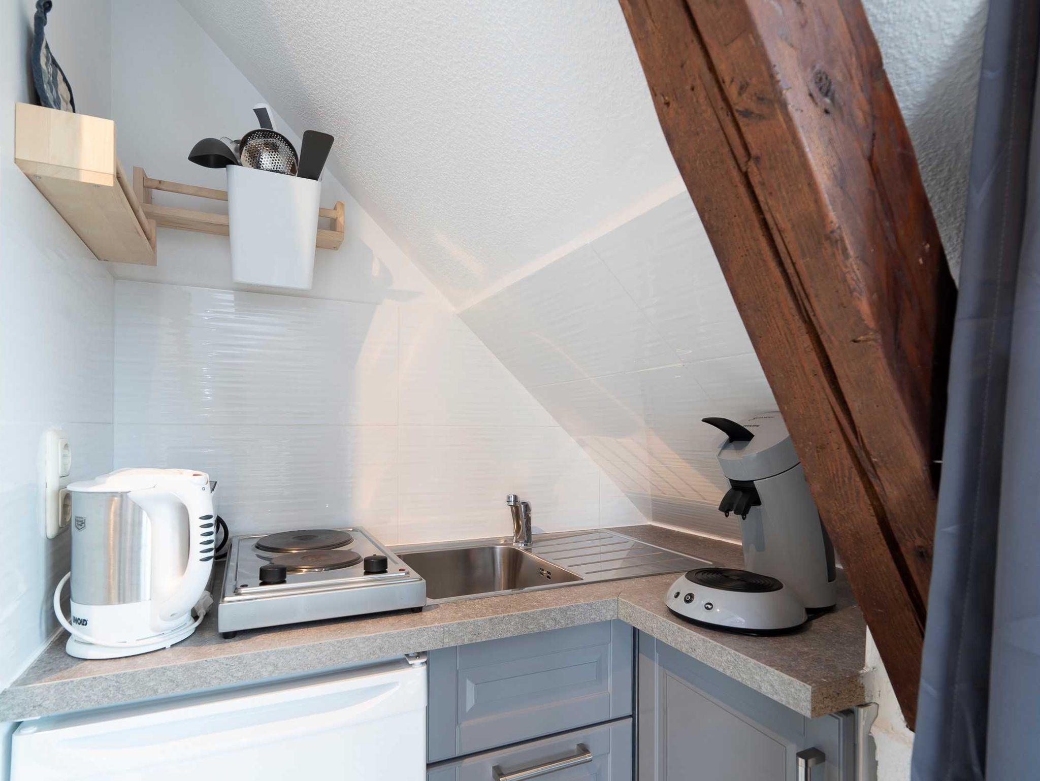 In der Pantryküche befinden sich ein 2-Platten-Kochfeld und ein Kühlschrank mit Gefrierfach, ein Wasserkocher und ein Coffeemaker. Es sind ausreichend Geschirr, Töpfe und Pfannen für 2 Personen vorhanden.