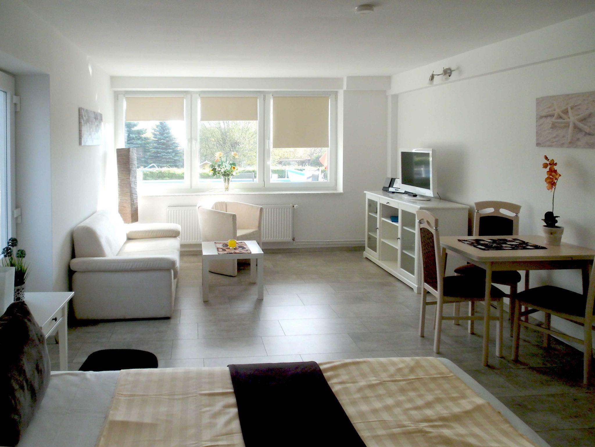 VV 13: EG, ca. 33 m², komb. Wohn-/Schlafzimmer, 2 Box-Spring-Betten und 1 Schlafcouch, Duschbad, separate Küche, große Terrasse direkt am Pool.