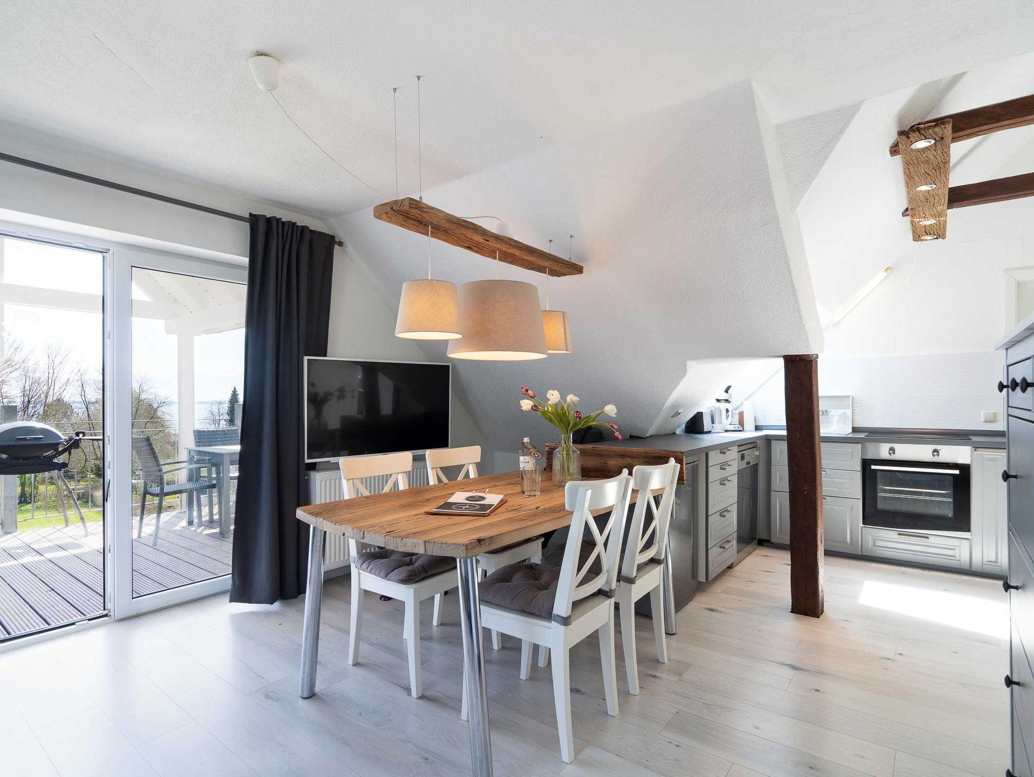 Die 3-Zimmer-Ferienwohnung wurde im Frühjahr 2022 renoviert und neu eingerichtet. Hier finden bis zu 6 Personen bequem Platz. Die Wohnung besteht aus einem Schlafzimmer, einem Kinderzimmer, dem Wohnzimmer mit offener Küche, der Dachterrasse mit Weber-Grill und einem Duschbad mit eigener Sauna.