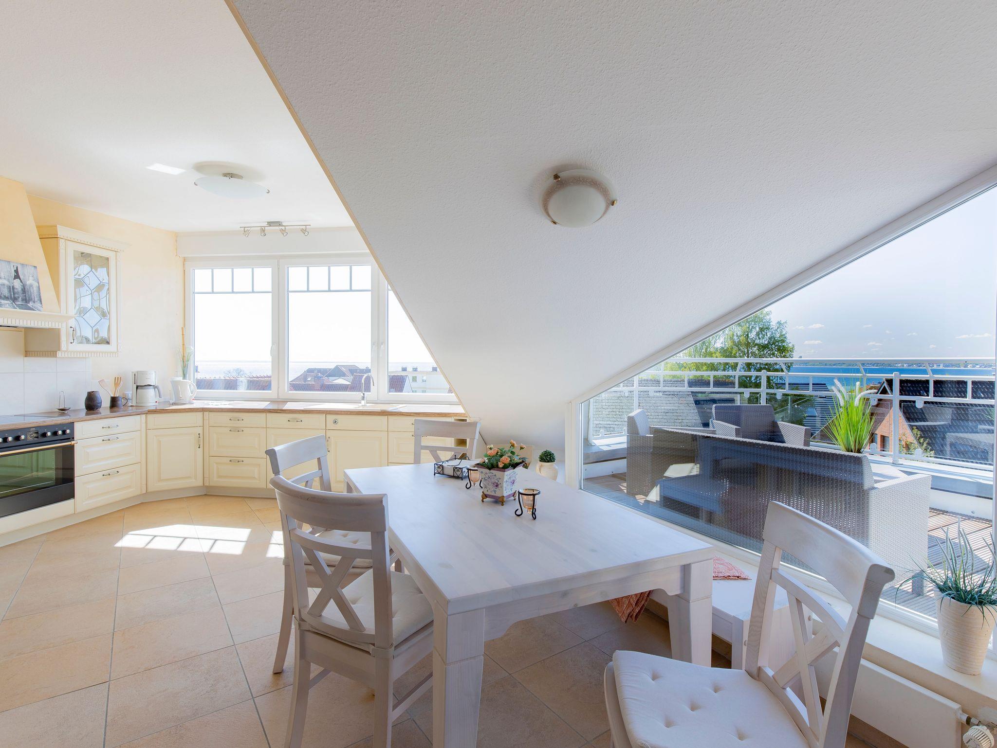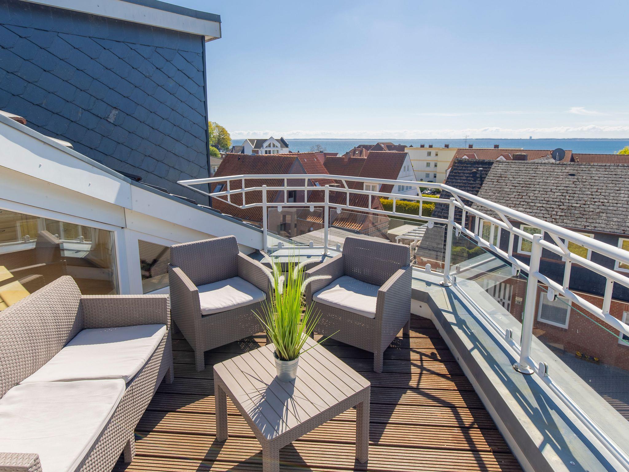 Die kleine, möblierte Loggia lädt am Morgen zum gemütlichen Sonnenfrühstück ein mit Blick über die Lübecker Bucht Richtung Timmendorfer Strand.
