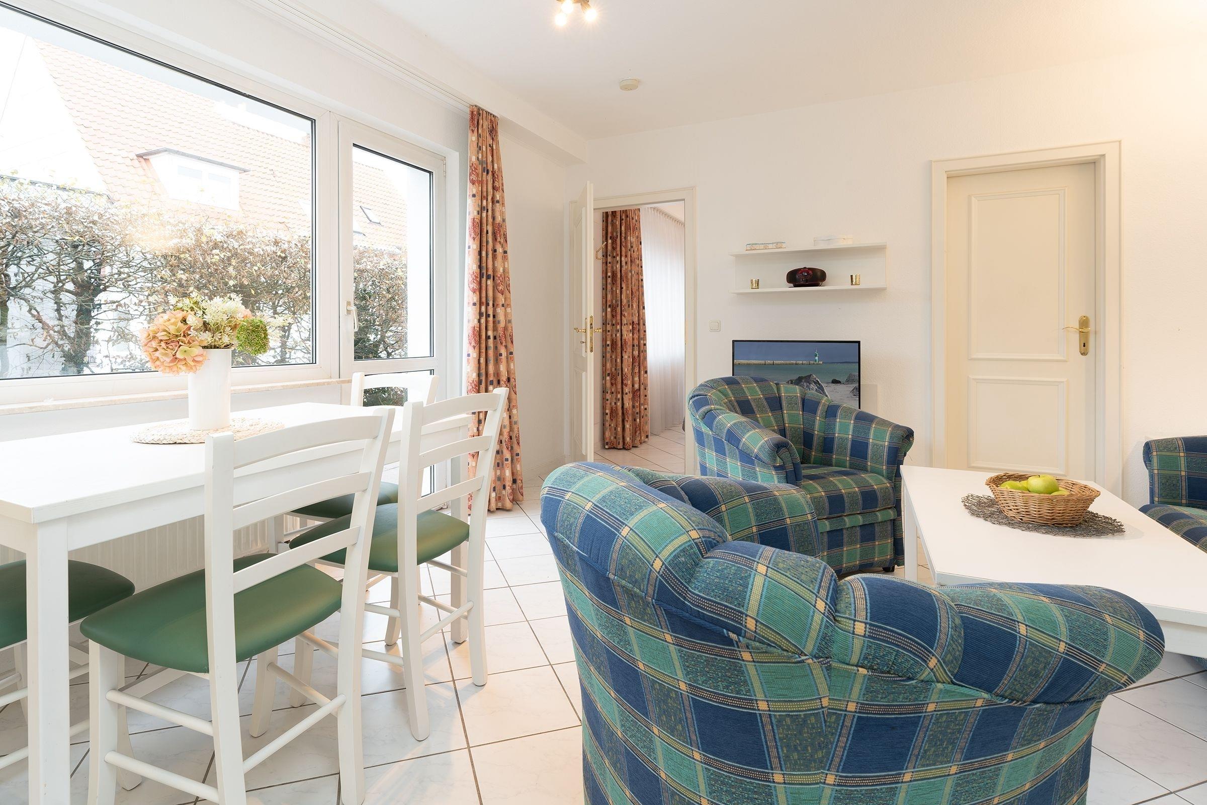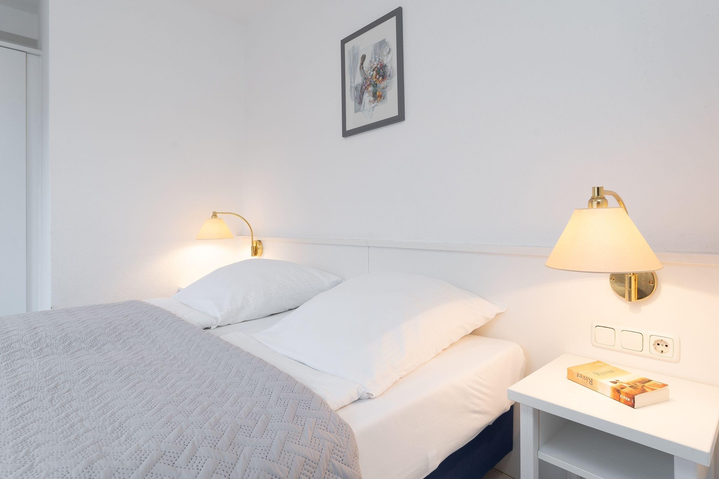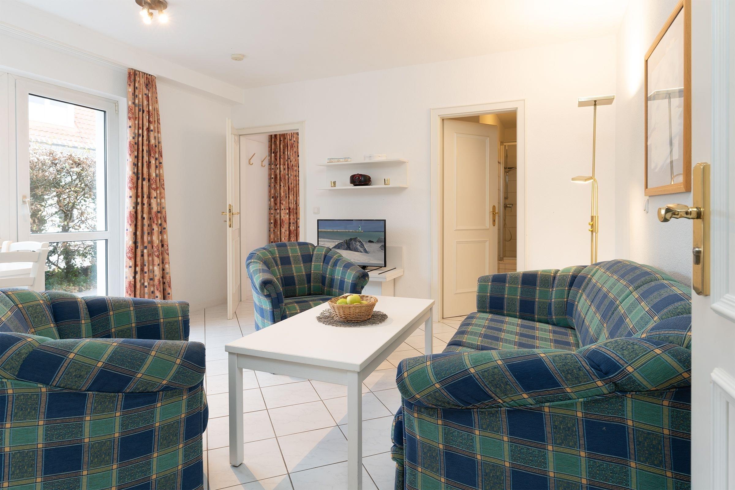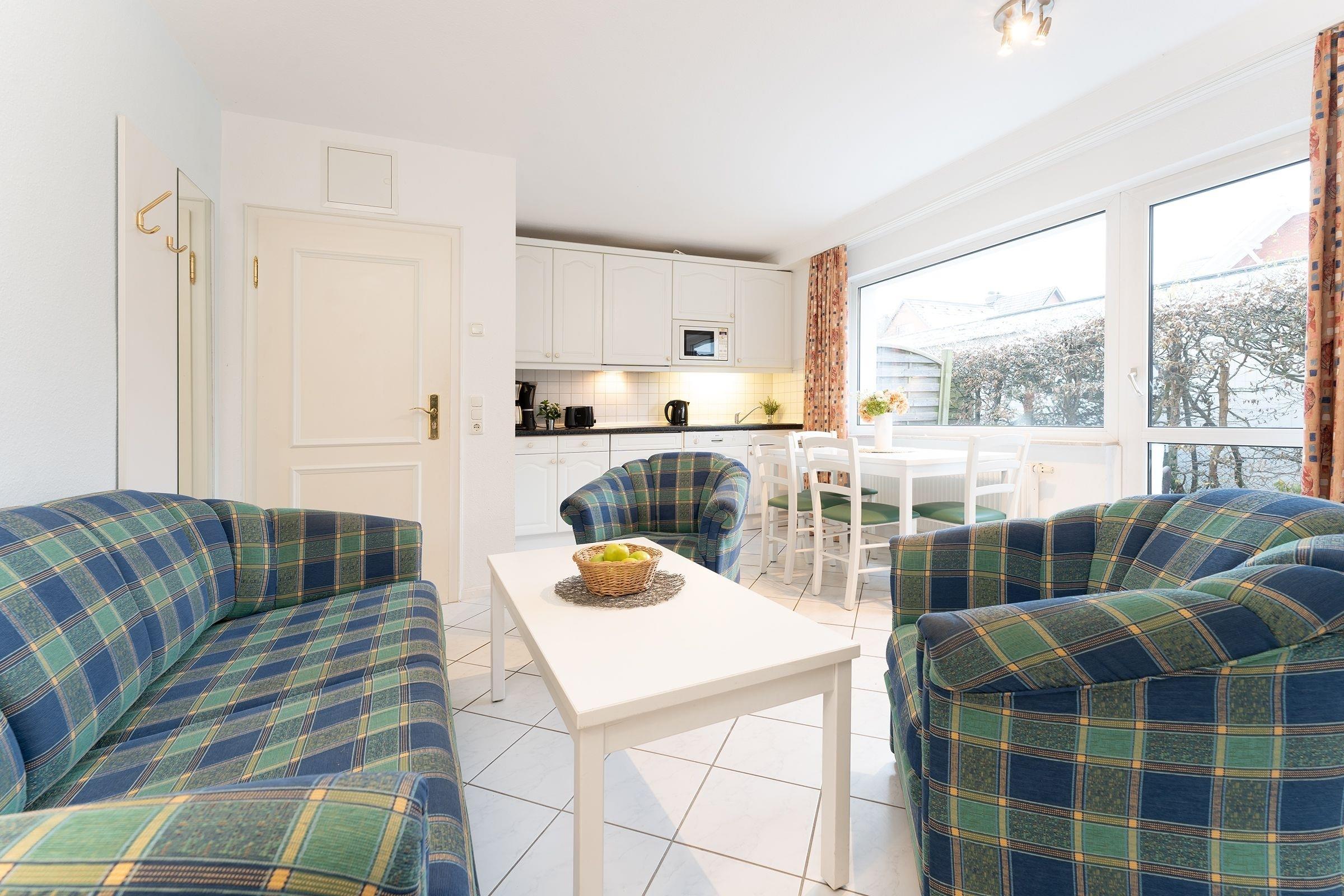Das 2-Zimmer-Appartement hat ca. 34 m² und bietet Platz für bis zu 4 Personen. Es ist komplett gefliest und verfügt über einen Wohnraum mit: Schlafcouch für 2 Personen, TV-Gerät, Radio/CD-Player, Essplatz, integrierter Küchenzeile sowie einem Zugang zur Terrasse mit Gartenmöbeln. Die moderne Küchenzeile ist ausgestattet mit: Induktionsherd (4 Kochplatten), Kühlschrank mit Gefrierfach, Mikrowelle, Geschirrspülmaschine, Wasserkocher, Kaffeemaschine und Toaster. Im Schlafzimmer befinden sich ein Doppelbett (2x 90x200 cm) und ein 2. Zugang zur Terrasse. Duschbad mit Fön.