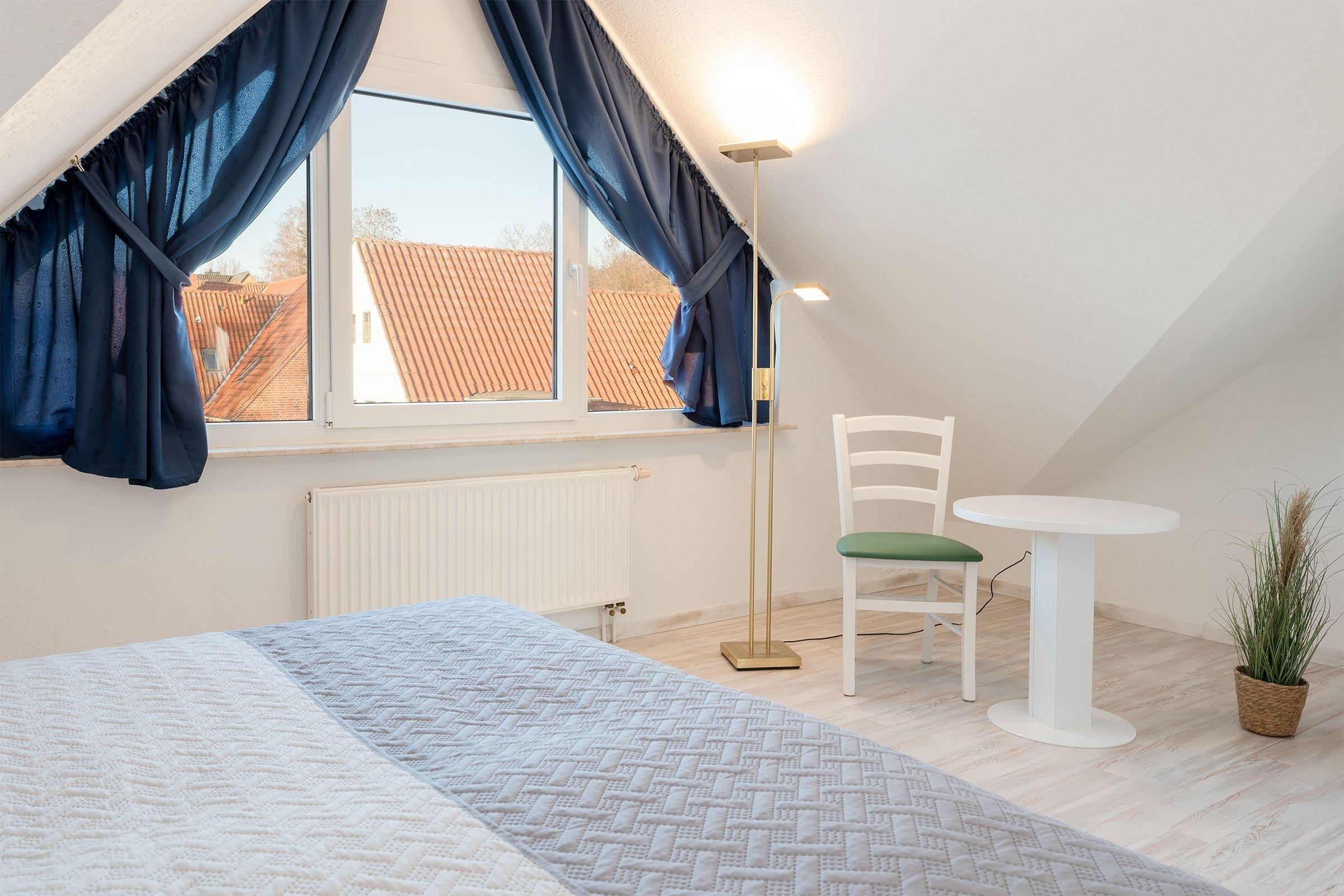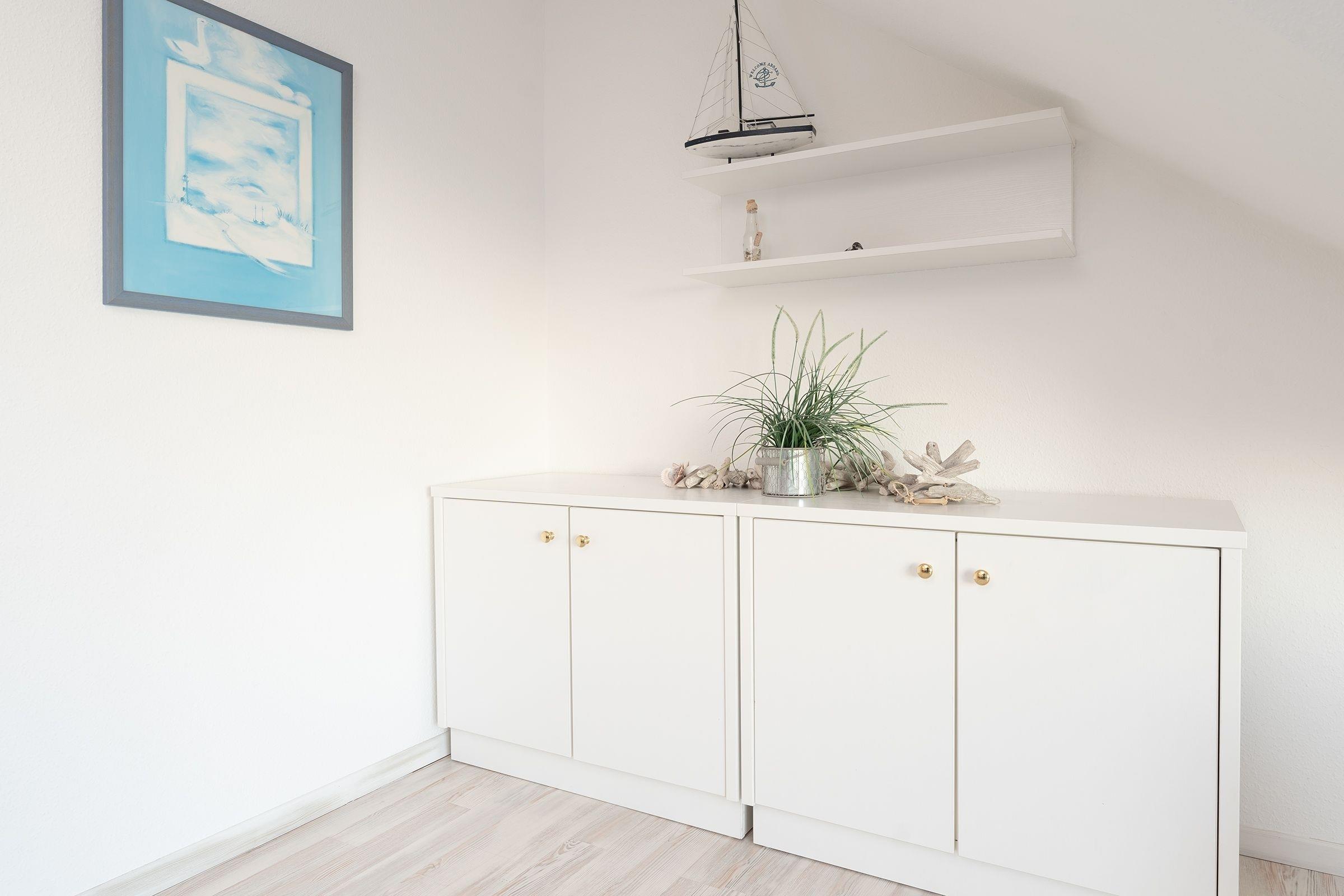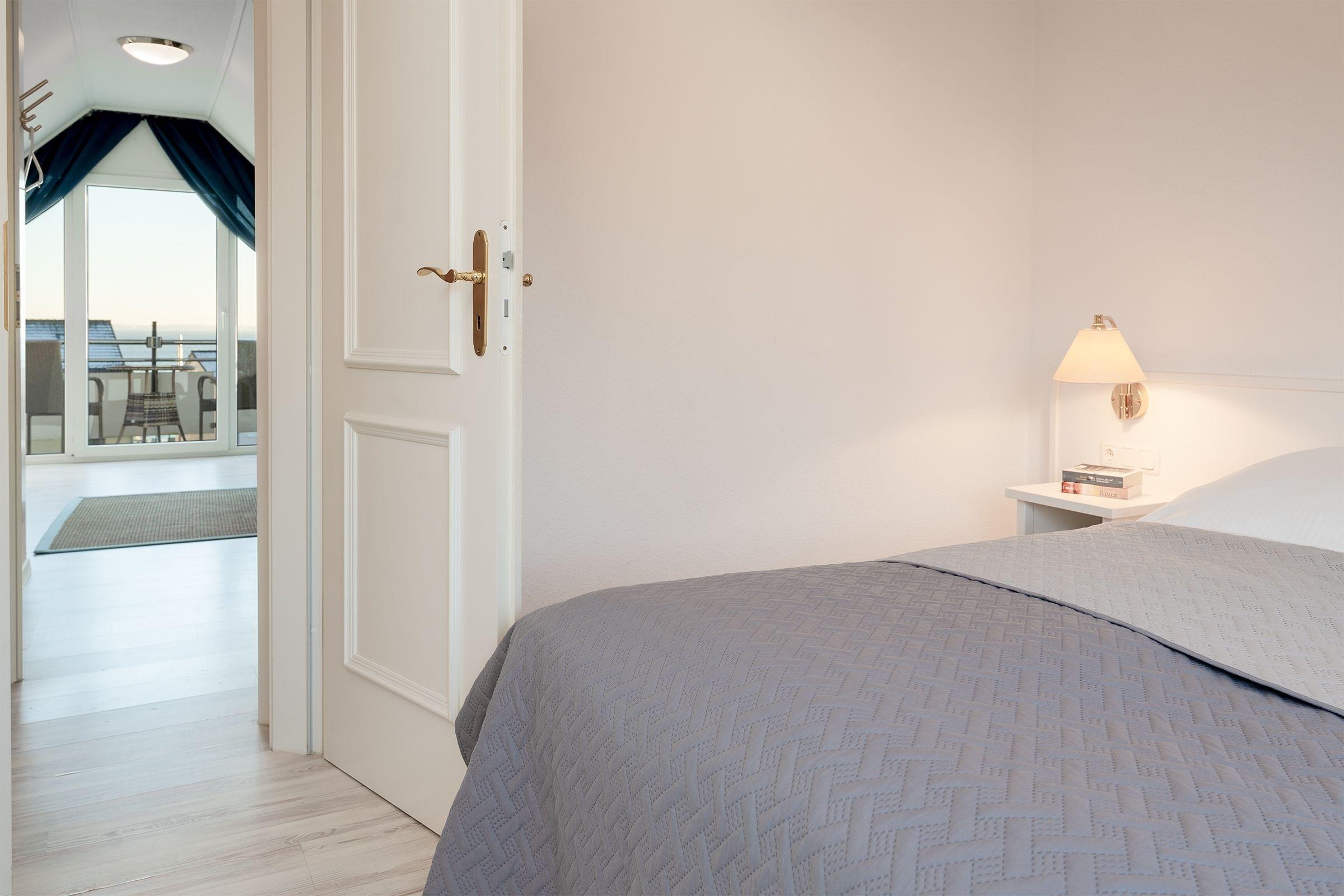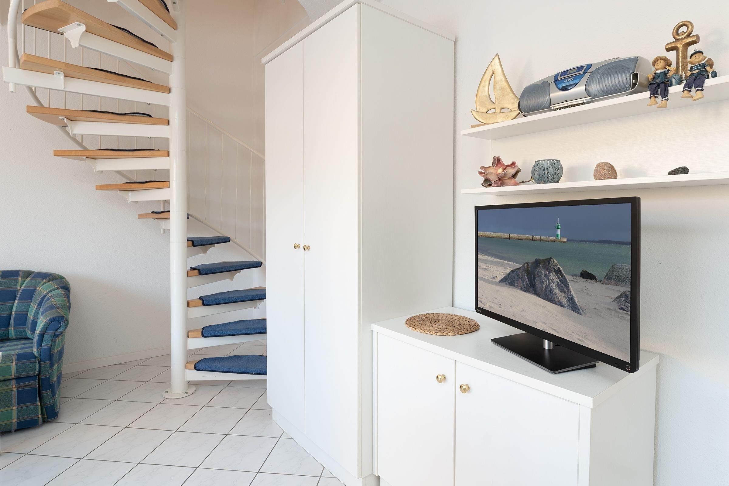 Auf der unteren Etage (1. Etage) befindet sich die großzügige Wohnküche mit einer Schlafcouch für 2 Personen und dem Essplatz. Die moderne Küchenzeile ist ausgestattet mit: Induktionsherd (4 Kochplatten), Kühlschrank mit Gefrierfach, Mikrowelle, Geschirrspülmaschine, Wasserkocher, Kaffeemaschine und Toaster. Das Dachgeschoss ist mit Laminat ausgelegt und verfügt über: Schlafraum mit Doppelbett (2x 90x200 cm), Duschbad mit Fön und Wohnraum mit TV-Gerät, Radio/CD-Player und einer weiteren Schlafcouch für 2 Personen. Vom Balkon hat man Meerblick.