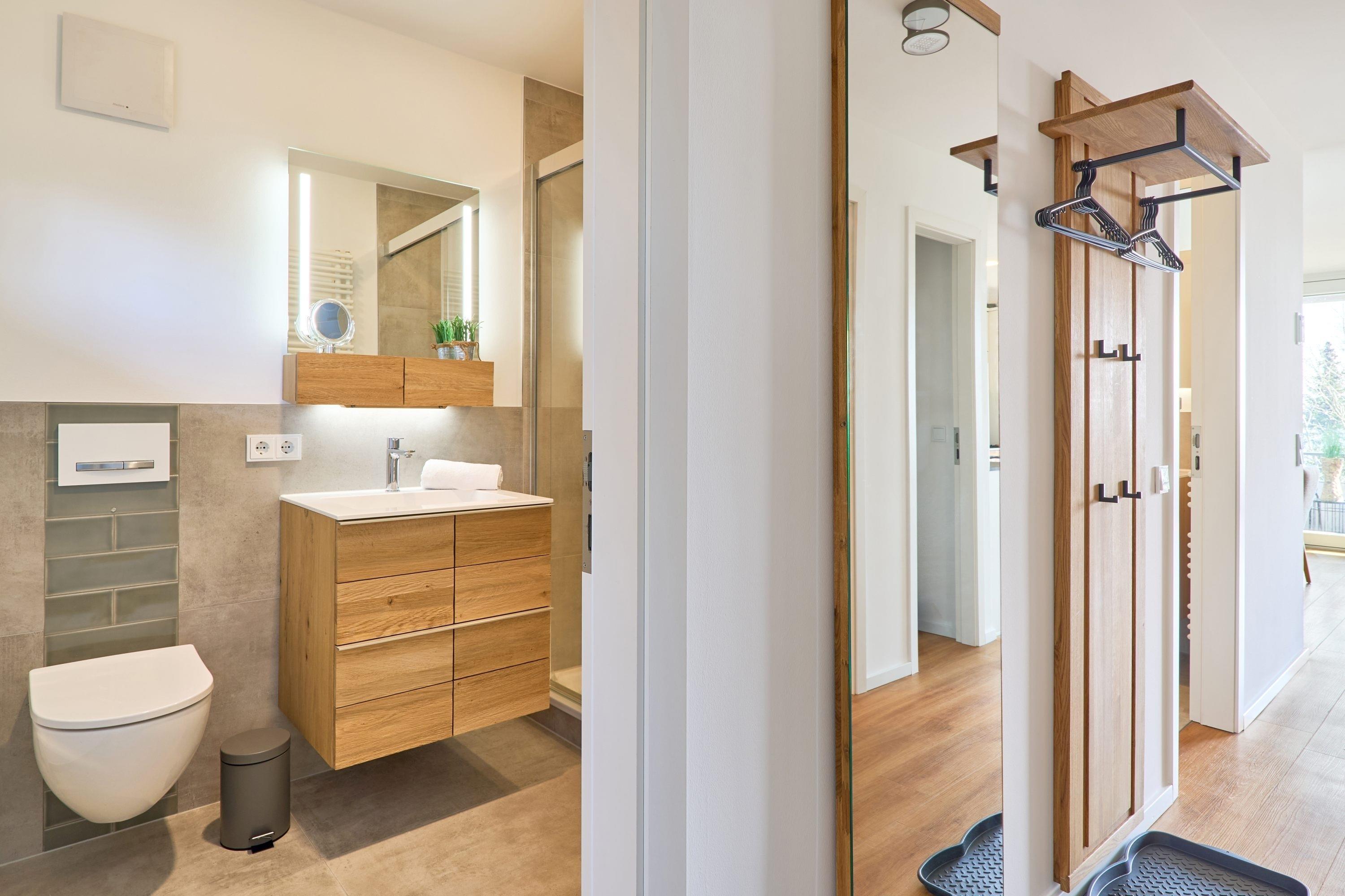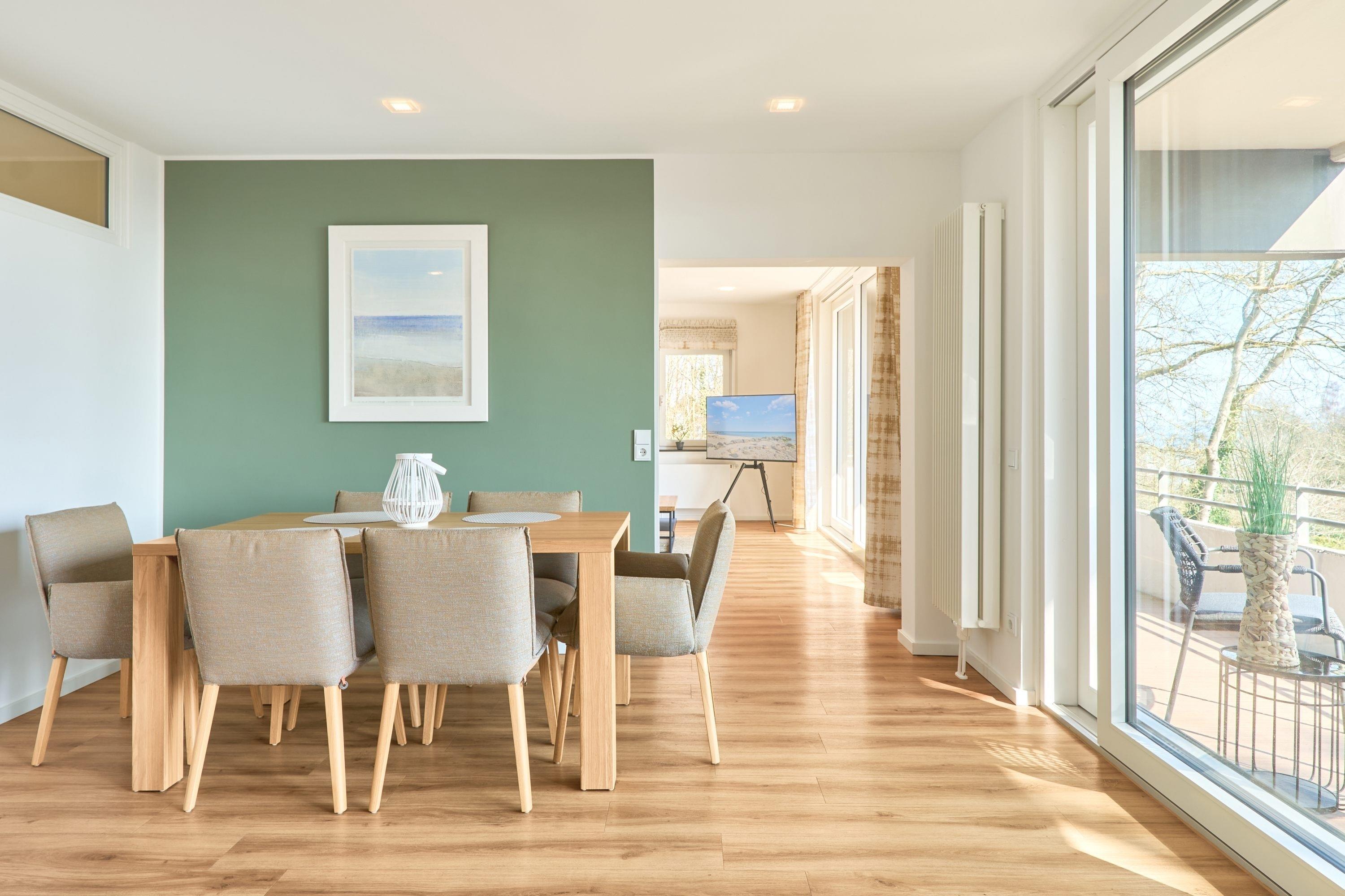 Diese schöne Wohlfühlwohnung hat einen großen Balkon mit Blick auf die Ostsee und ins Grüne. In der Wohnung erwarten Sie ein Geschmack vom Feinsten sowie Großzügigkeit. Lassen Sie sich überraschen. Eine großartige Wohnküche, ein großer[nbsp] Essbereich erwarten Sie in dieser Wohnung. Der Wohnbereich ist separiert und mit einer hochwertigen Einrichtung ausgestattet. Auch die technische Ausstattung lässt keine Wünsche offen: Ein Flachbildschirm-TV befindet sich im Wohnbereich sowie im großen Schlafzimmer. Das große Schlafzimmer ist mit einem Boxspringbett (1,80mx2,00m) ausgestattet. Die weiteren zwei Schlafzimmer besitzen Einzel-Boxspringbetten (1,00mx2,00m). Die Wohnung hat ein Tageslichtduschbad sowie ein sehr geräumiges Gäste-WC mit einer Waschmaschine. Ein Abstellraum befindet sich ebenfalls in der Wohnung. Kostenloses WLAN steht Ihnen zur Verfügung.