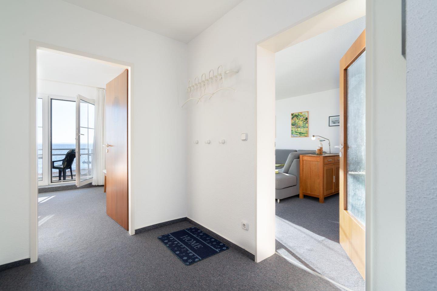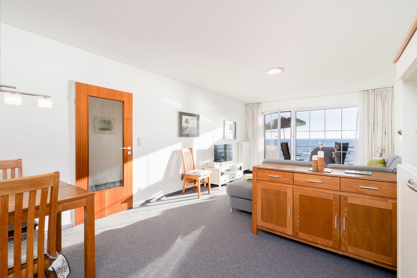 Die Ferienwohnung besteht aus einem großen sonnigen Zimmer mit einem kombinierten Wohn-, Ess- und Küchenbereich, einem Schlafzimmer mit Blick aufs Meer, einem kleinen innen liegendem Kinderzimmer mit Etagenbett, ein helles Duschbad, der Flur mit Schrankablage und zwei Balkonen zum Strand ausgerichtet.