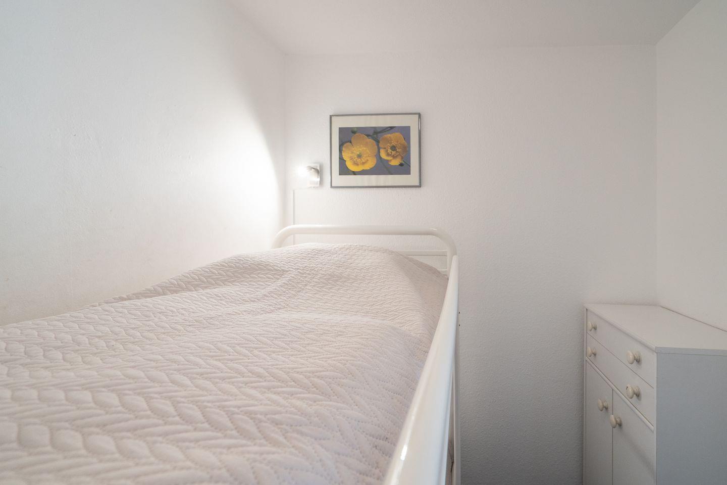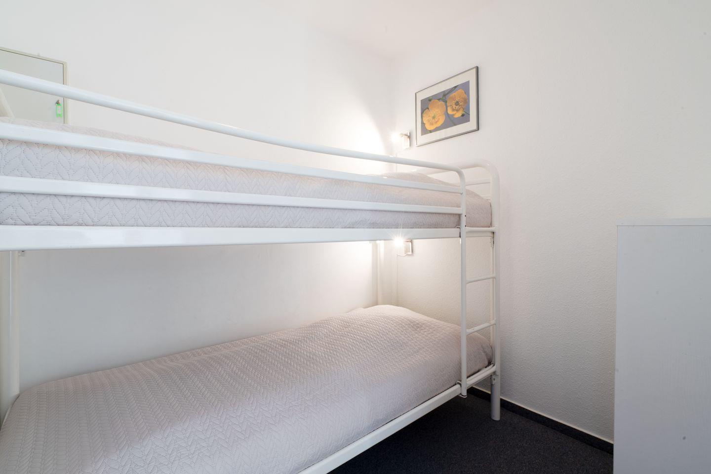 Die Ferienwohnung besteht aus einem großen sonnigen Zimmer mit einem kombinierten Wohn-, Ess- und Küchenbereich, einem Schlafzimmer mit Doppelbett (2x 90 x 200 cm) und Blick aufs Meer, einem kleinen innenliegenden Kinderzimmer mit Etagenbett (jeweils 80 x 200 cm), einem hellen Duschbad, einem Flur mit Schrankablage und zwei Balkonen, die zum Strand ausgerichtet sind.