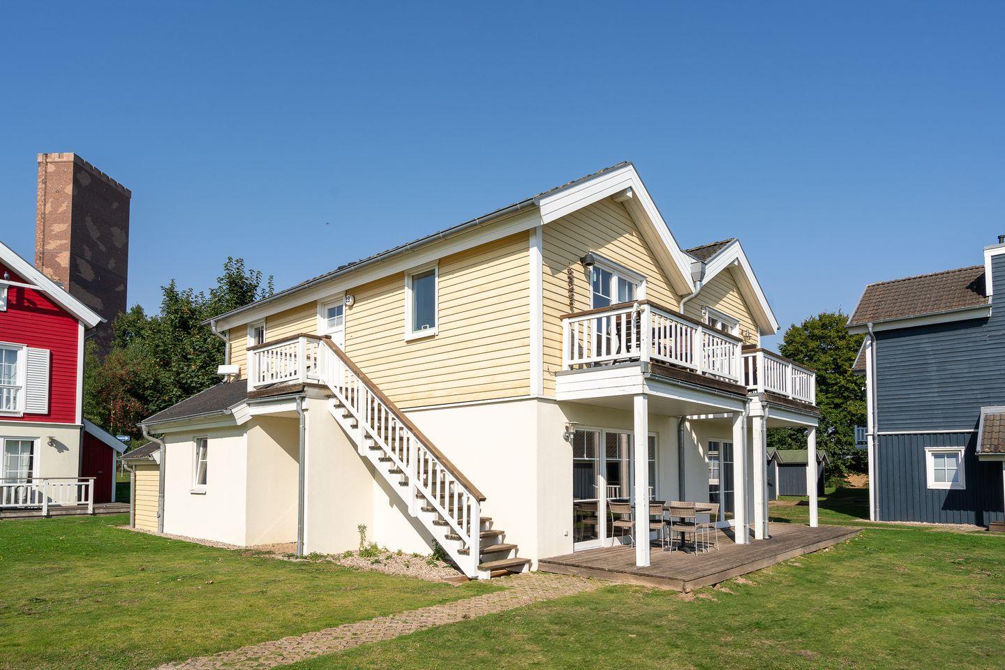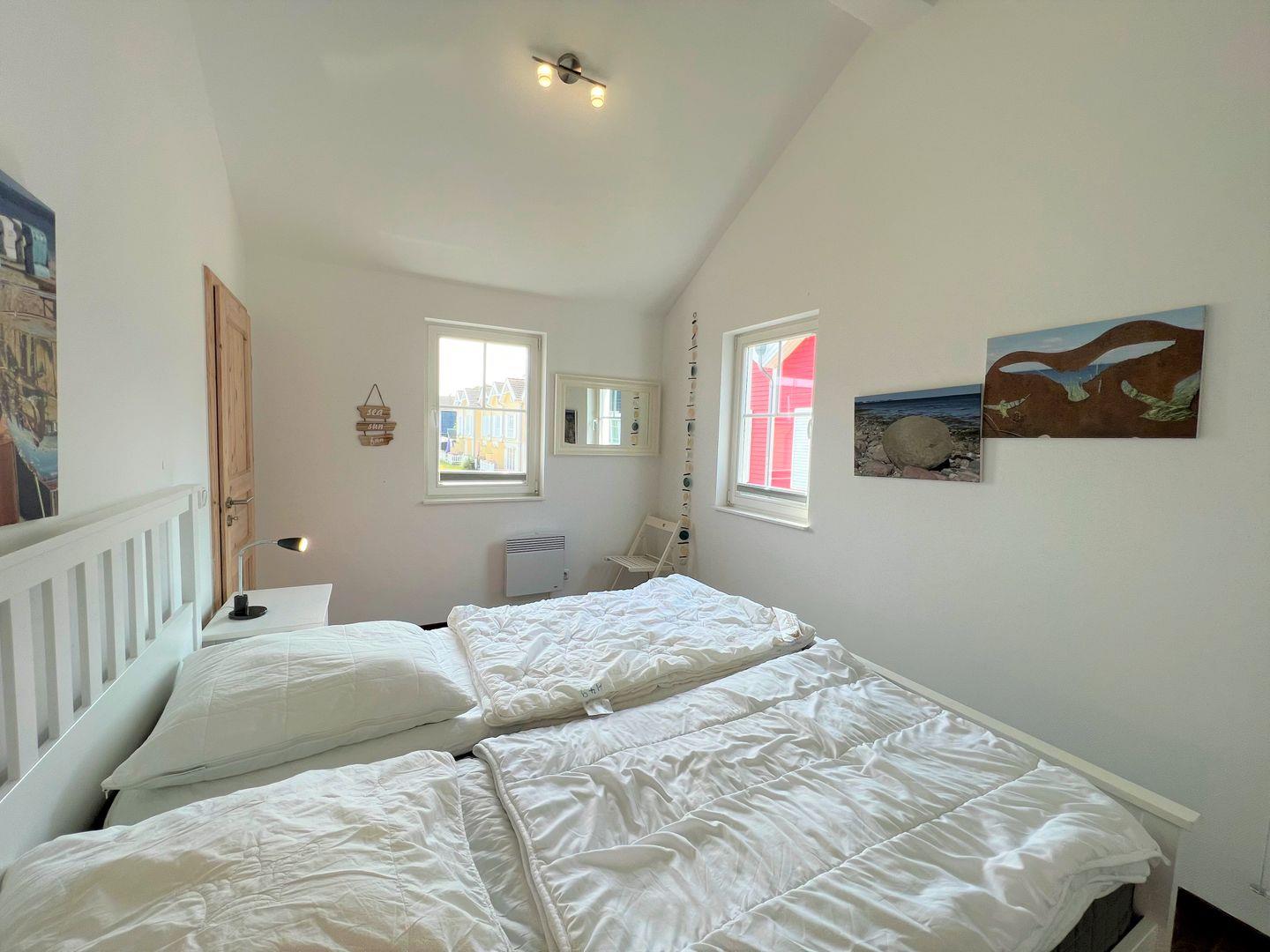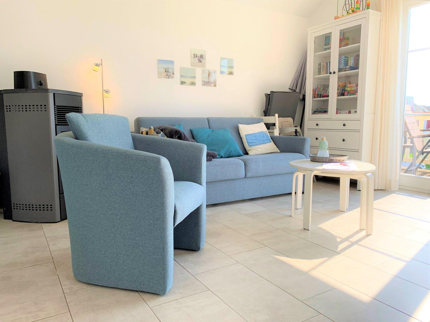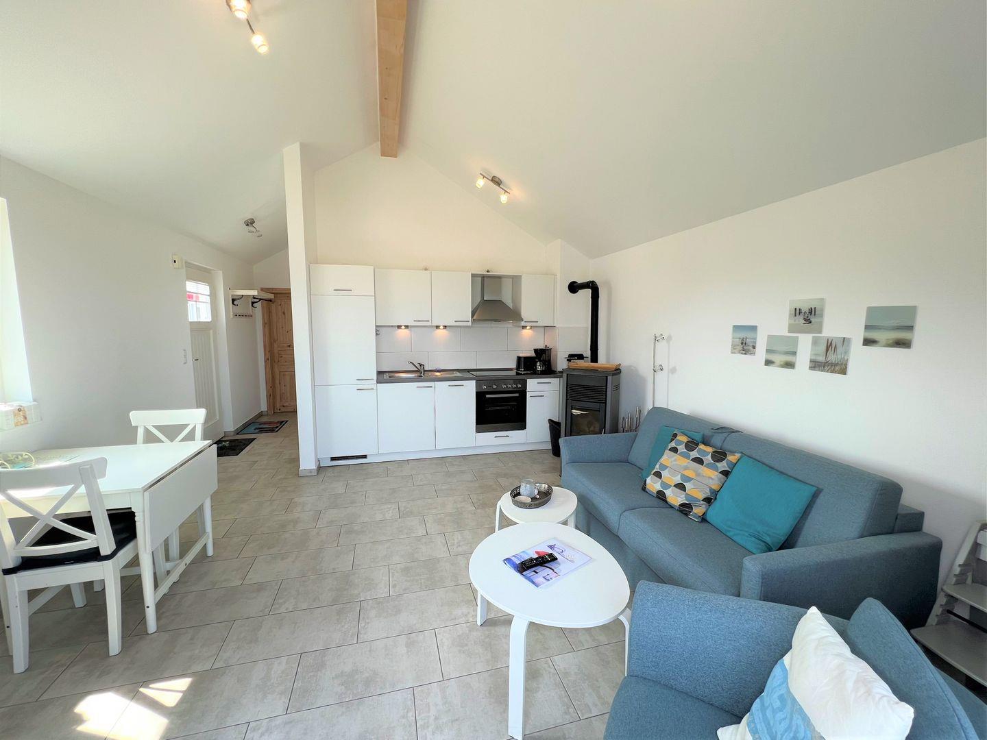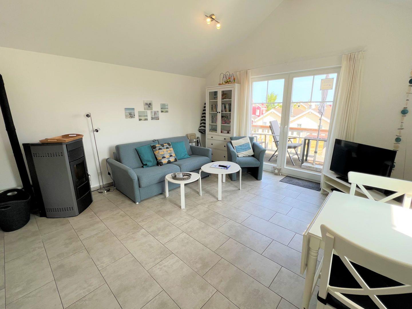 Es stehen Ihnen ein Schlafraum mit Doppelbett (2x 90 x 190 cm) und ein geräumiger Wohnraum mit offener Küchenzeile und Pelletofen zur Verfügung. Der Ofen sorgt für gemeinsame und gemütliche Stunden. Auf der Schlafcouch im Wohnraum ist Platz für zwei weitere Personen. Vom Balkon aus können Sie über die Anlage hinweg die Ostsee sehen. Die Küche ist mit Geschirrspülmaschine, Herd und Backofen gut ausgestattet. Im Bad finden Sie auch die Sauna, sowie eine Dusche und die Waschmaschine. Der Komfort einer eigenen Sauna wird sehr von unseren Wintergästen geschätzt. Die Beheizung erfolgt über Elektroheizungen und den Kamin.