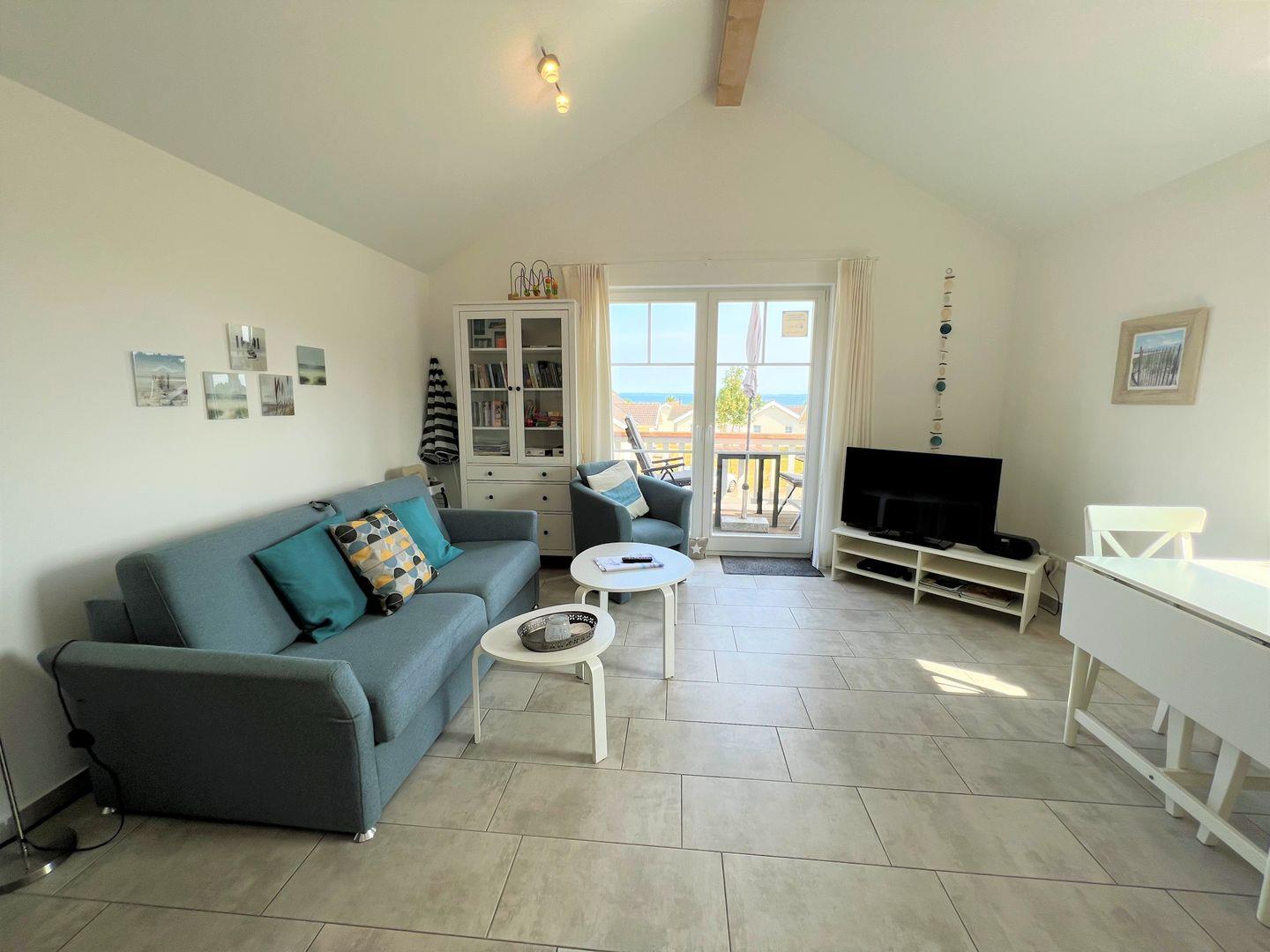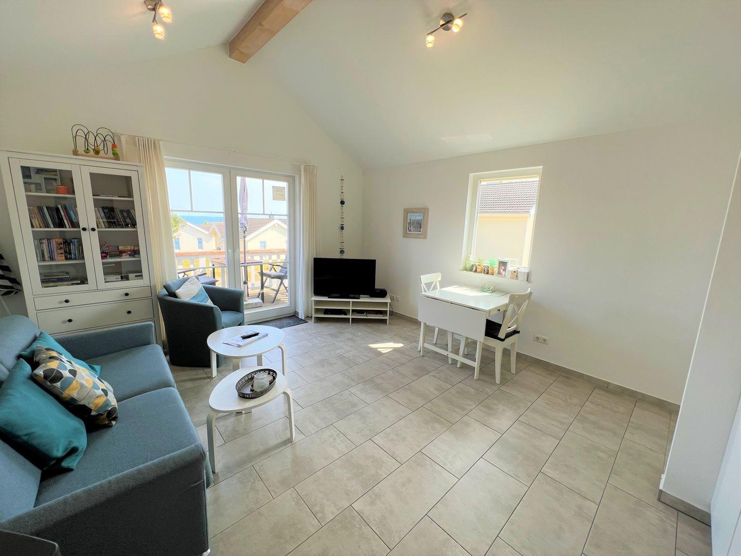 Die schöne Ferienwohnung "Schnigge" Nr.49 liegt in der 1. Etage eines Mehrparteienhauses in der Strandpark-Anlage. Vom gemütlichen Wohnraum mit Pelletofen und integrierter, voll ausgestatteter Küchenzeile haben Sie Zugang zum Balkon. Von hier haben Sie über die anderen Häuser hinweg Blick auf die Ostsee. Im Schlafraum steht ein Doppelbett, auf der Schlafcouch im Wohnraum ist Platz für eine weitere Person. Das Bad ist mit Dusche, Sauna und Waschmaschine ausgestattet. WLAN ist inklusive.