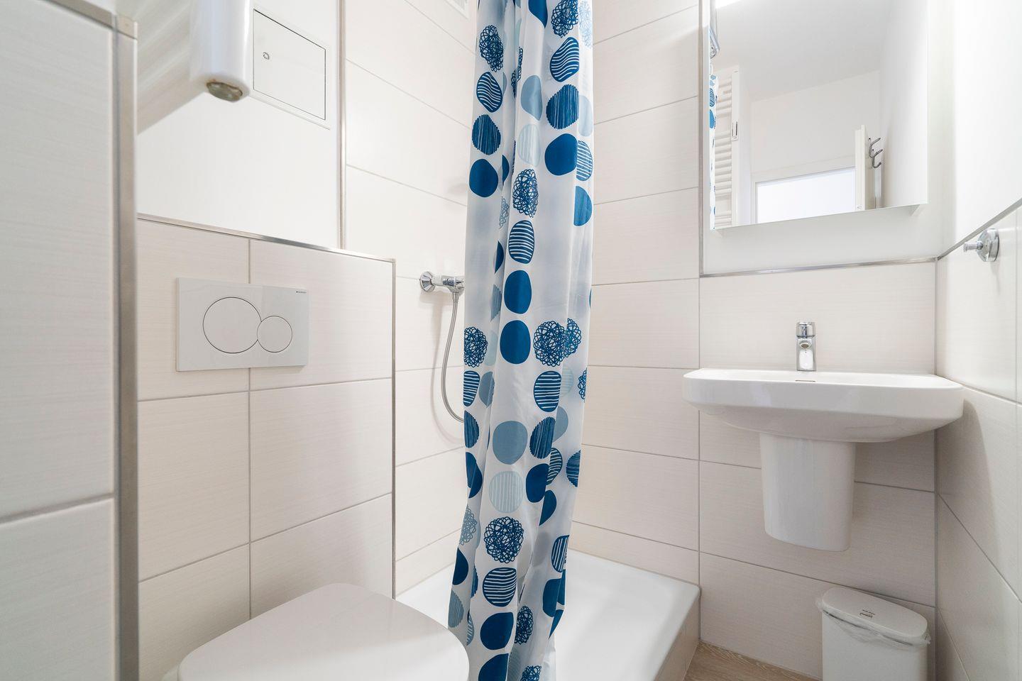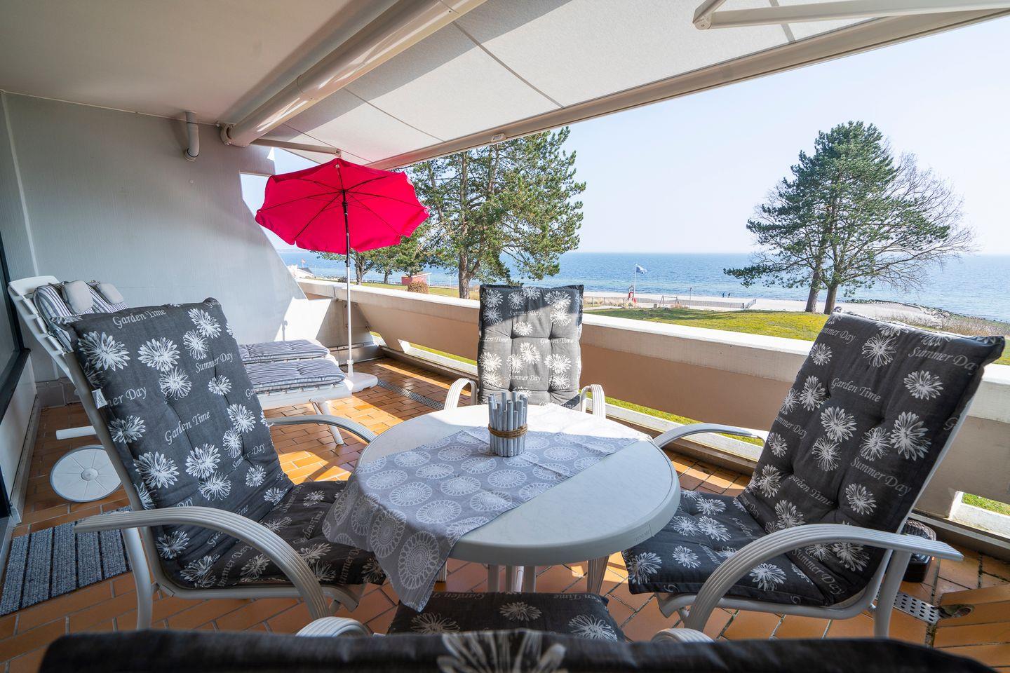die Ferienwohnung befindet sich in der 1. Reihe zum Meer sowie in der 1. Etage der Terrassenhäuser mit ebenerdigem Eingang. Ein toller 100% Meerblick, ein großer möblierter Balkon mit elektrischer Markise und eine modern eingerichtete Wohnung bieten einen tollen Ort für eine schöne Zeit an der Ostsee. Auf dem großen, teilweise überdachten Balkon können Sie von Sonnenaufgang bis zum Nachmittag auf den Möbeln die Sonne und den atemberaubenden, uneingeschränkten Meerblick genießen. Vom stilvoll eingerichteten kombinierten Wohn- und Essbereich haben Sie Zugang zum Balkon. Durch die großen Panoramafenster haben Sie einen traumhaften Blick auf die Ostsee. DIe mit Spülmaschine, Backofen und Herd ausgestattete Küche ist in den Wohn- und Essbereich integriert. Im ersten Schlafraum befinden sich 2 Einzelbetten (je 90 m x 190 cm), die man nicht zusammenschieben kann. Im zweiten Schlafraum steht ein Etagenbett (2x 90 cm x 190 cm) und ein Kleiderschrank für ausreichend Verstaumöglichkeiten. In den Schlafräumen ist kein Platz, um ein Kinderreisebett aufzustellen, für Verdunkelung stehen elektr. Rollläden zur Verfügung. Das moderne Duschbad ist innenliegend. Der zugehörige, persönliche und kostenlose PKW-Stellplatz befindet sich ebenfalls nur wenige Meter ebenerdig zum Eingang Ihrer Unterkunft. Da das Meer und der Strand direkt vor der Tür liegen, sind es nur wenige Stufen und Schritte zu gehen.