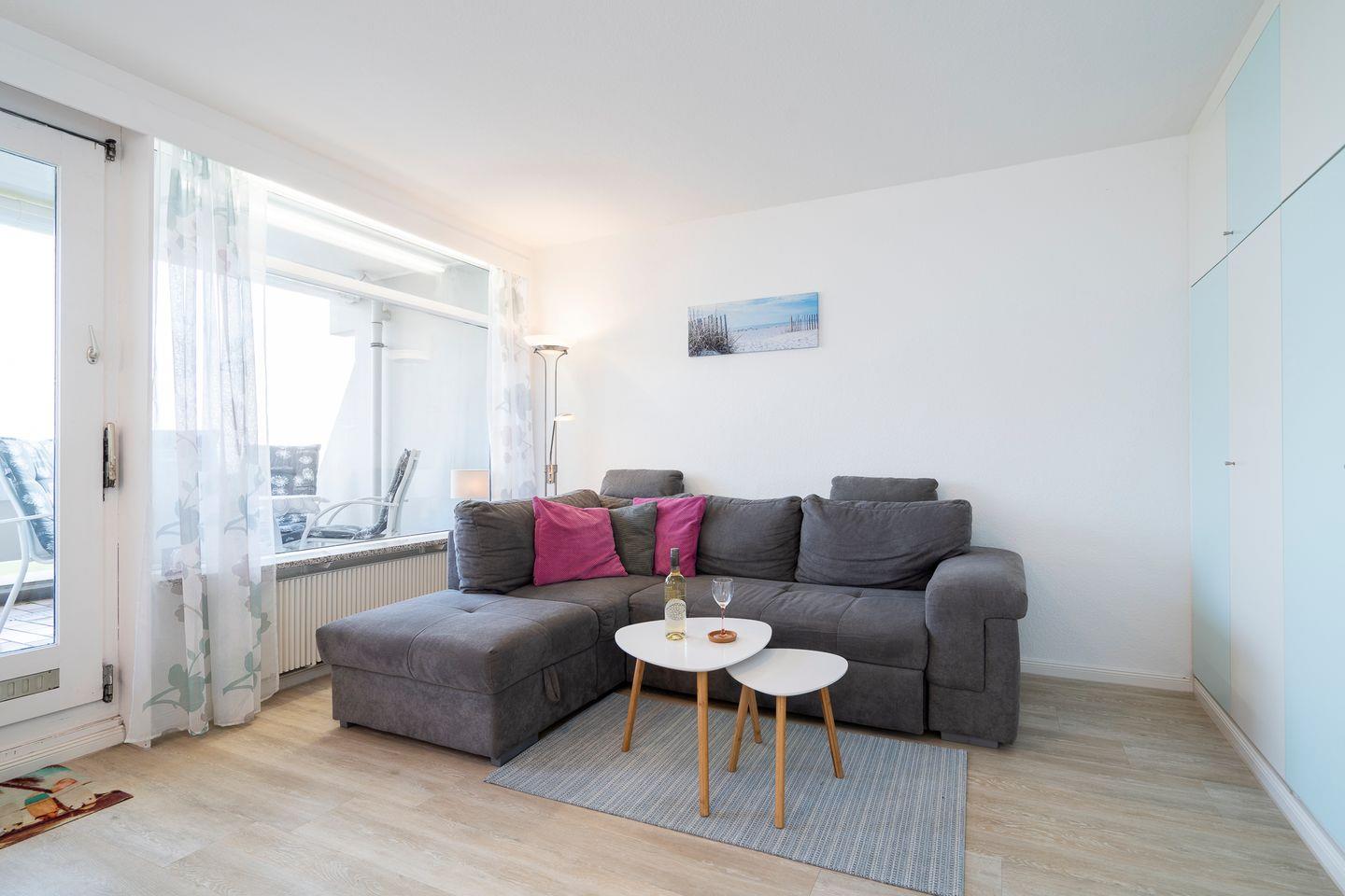 Herzlich willkommen in der 3-Raum-Ferienwohnung Nr. 051. Genießen Sie vom großzügigen Balkon den uneingeschränkten Meerblick und genießen Sie Ihren Urlaub in der modern und geschmackvoll eingerichteten Wohnung. Die voll ausgestattete Küche ist in den kombinierten Wohn- und Essbereich integriert. Im ersten Schlafraum stehen 2 Einzelbetten, die man nicht zusammenschieben kann. Im zweiten Schlafraum steht ein Etagenbett. Das moderne Duschbad ist innenliegend. WLAN ist inklusive.