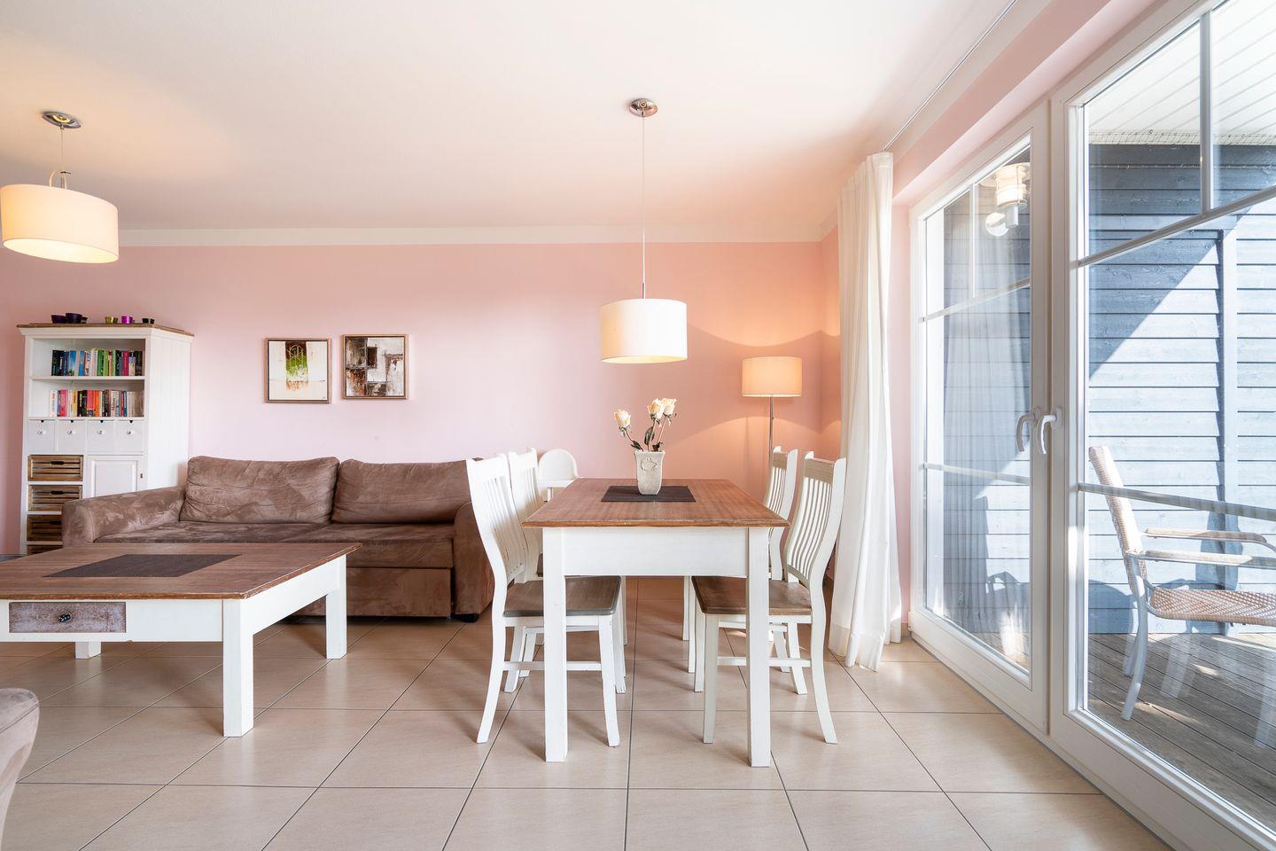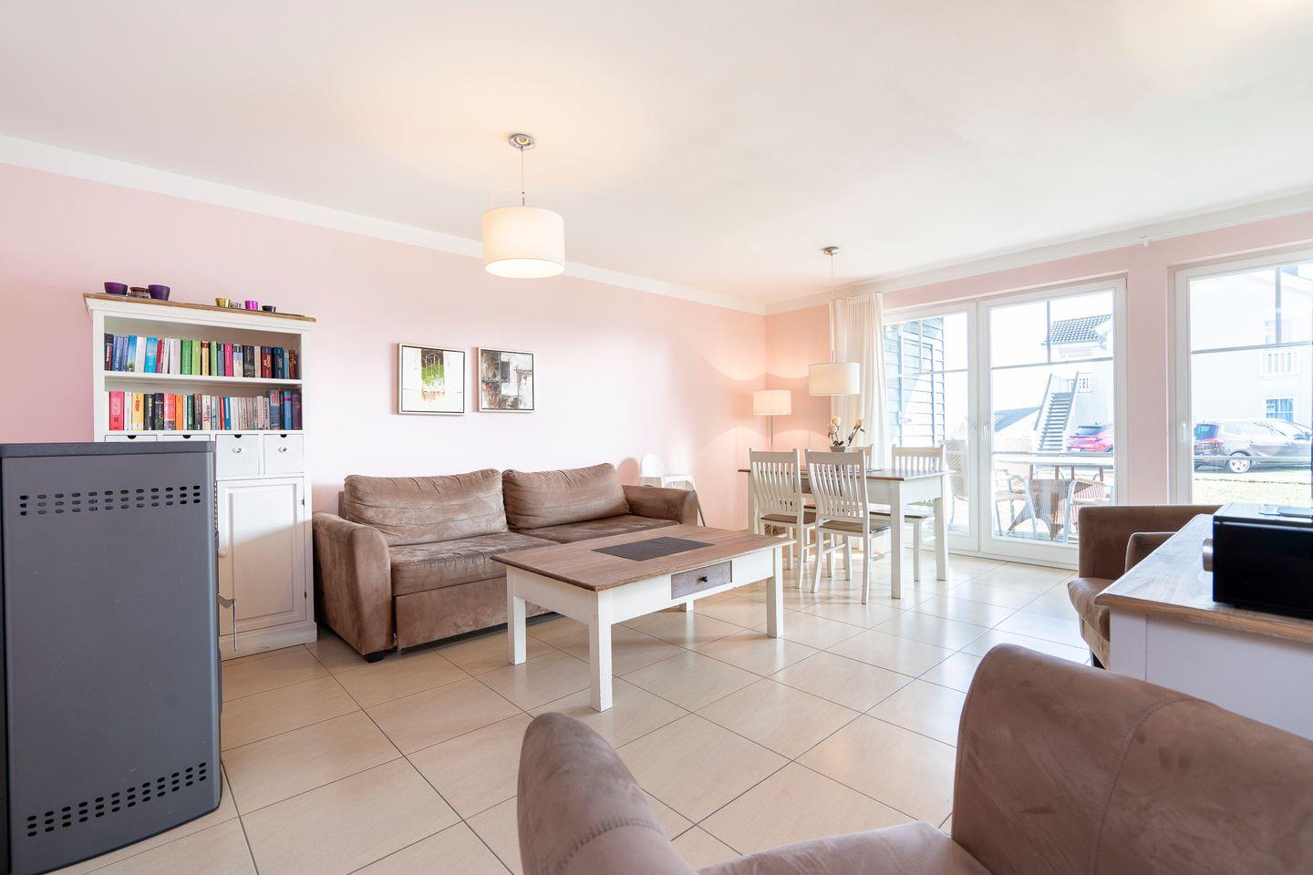 Die schöne Ferienwohnung „Brigantine“ Nr. 23 liegt im Parterre eines Quattrobungalows, hat aber einen separaten Eingang. Vom geräumigen Wohn- und Essraum mit Pelletofen haben Sie Zugang zur Terrasse. Die offene Küche ist mit Spülmaschine, Backofen und Herd ausgestattet, zudem steht eine Waschmaschine zur Verfügung. Der erste Schlafraum hat ein Doppelbett, im zweiten stehen zwei Einzelbetten. Das Bad ist mit Dusche und Sauna ausgestattet. WLAN ist inklusive.