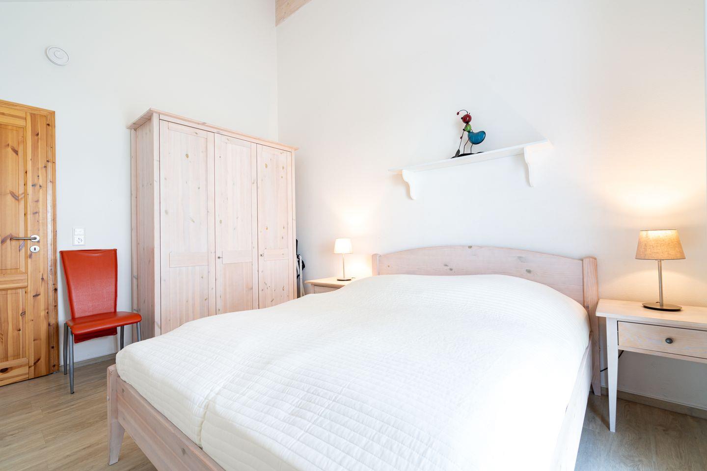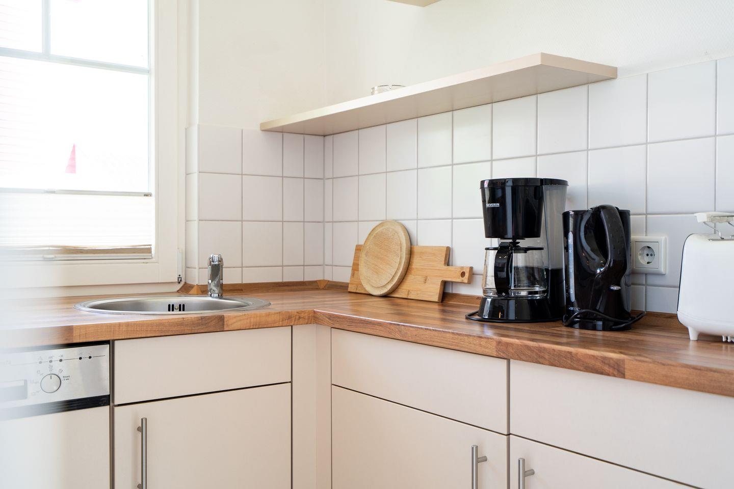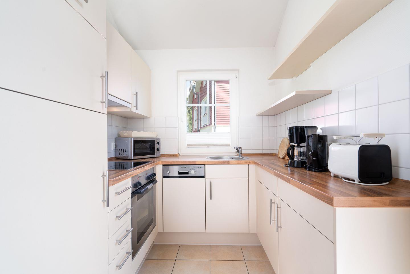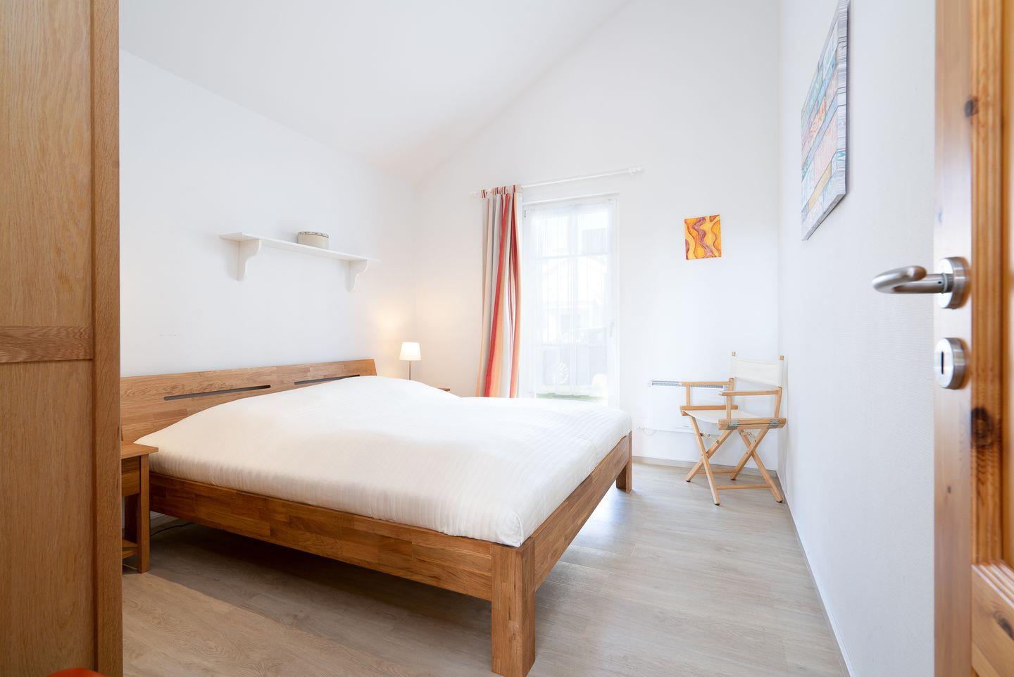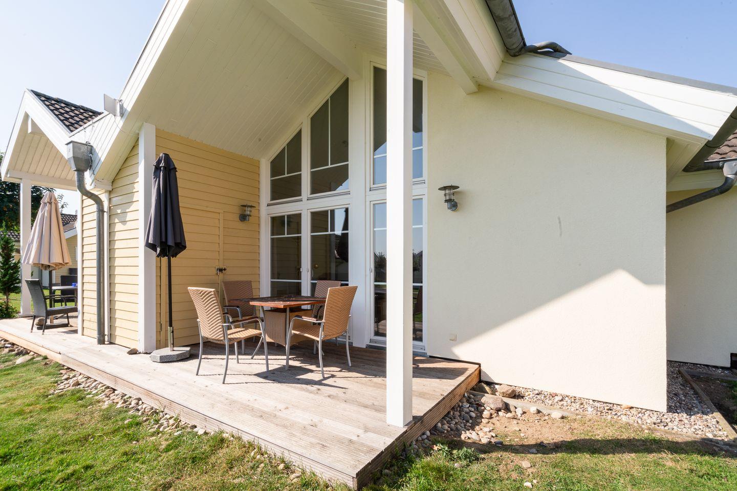 Auf 70 qm auf einer Ebene stehen Ihnen 2 Schlafräume, ein geräumiger Wohn- und Essraum mit Kamin und Zugang zur Terrasse zur Verfügung. Von hier können Sie durch die anderen Häuser hindurch die Ostsee sehen. Der Kaminofen sorgt für gemütliche Stunden mit Freunden und Familie. Beide Schlafzimmer sind mit Doppelbetten ausgestattet (im ersten Schlafraum 2x 90 cm x 200 cm, im zweiten 2x 80 cm x 200 cm). Die zum Wohn- und Essbereich offene Küche ist mit Geschirrspülmaschine, Herd und Backofen gut ausgestattet. Im Bad finden Sie auch die Sauna, sowie eine Badewanne. Der Komfort einer eigenen Sauna wird sehr von unseren Wintergästen geschätzt. Eine Waschmaschine gehört ebenfalls zur Ausstattung. Die Beheizung erfolgt über Elektroheizungen und den Kamin.