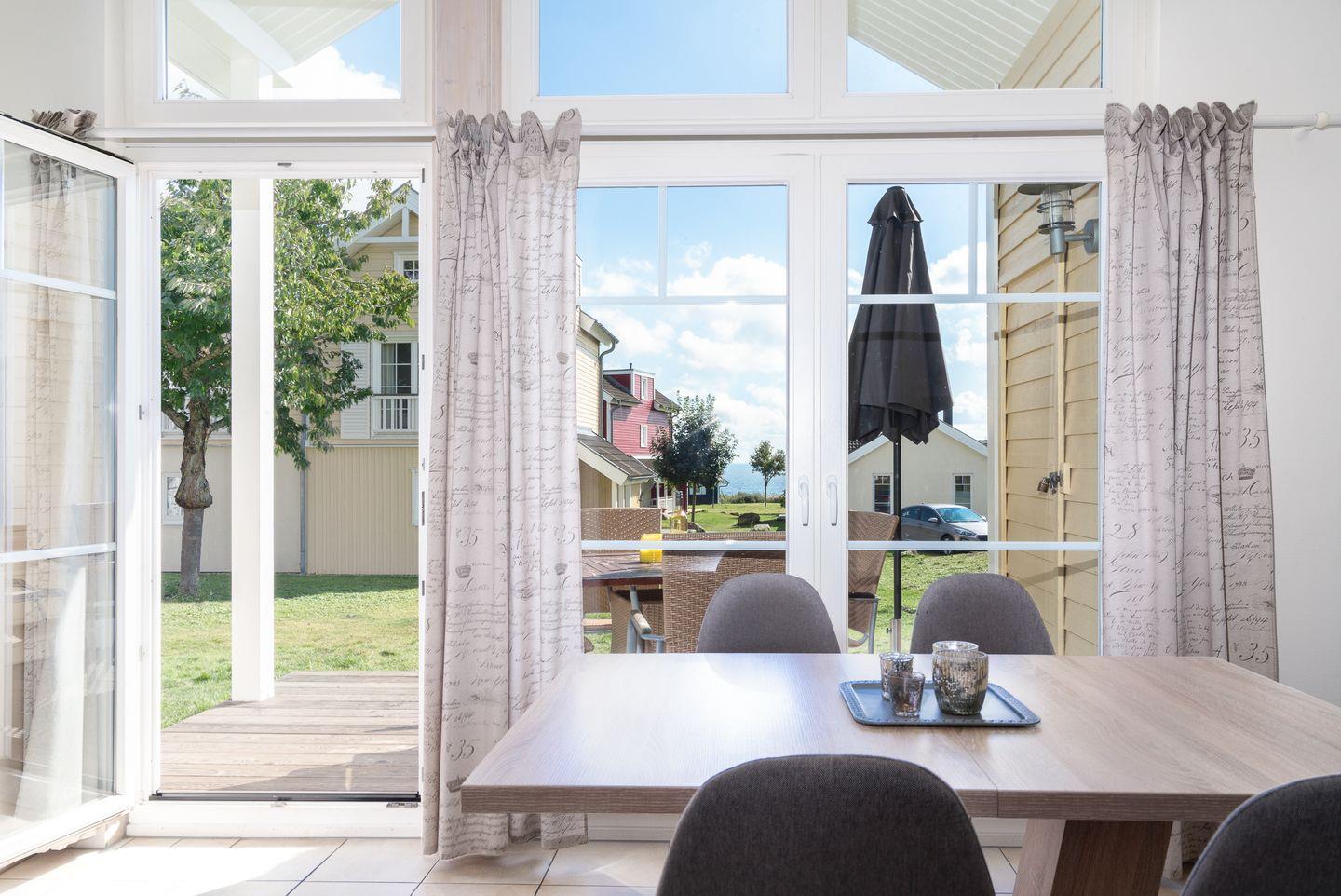 Die komfortable Bungalowhälfte "Waterkant" Nr.60 liegt in der Strandpark-Anlage und ist für 4 Personen geeignet. Vom geräumigen Wohnraum mit Kamin und offener Küche haben Sie Zugang zur Terrasse. Von hier können Sie durch die anderen Häuser hindurch die Ostsee sehen. Die Küche ist mit Spülmaschine, Backofen und Herd ausgestattet. Im ersten Schlafraum steht ein Doppelbett, im zweiten stehen zwei Einzelbetten. Das Bad ist mit Badewanne, Sauna und Waschmaschine ausgestattet. WLAN ist inklusive.