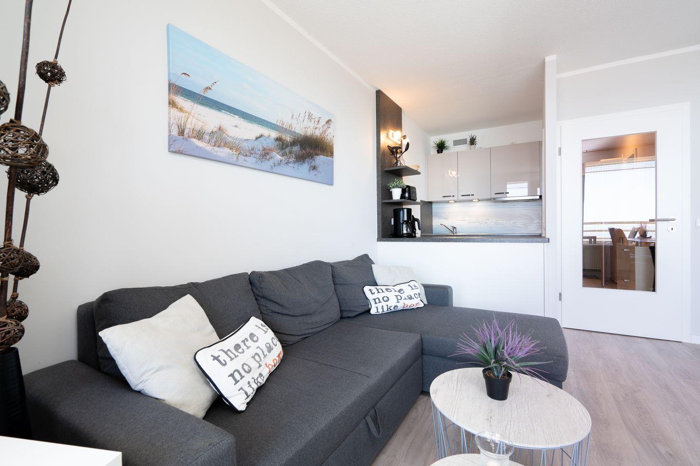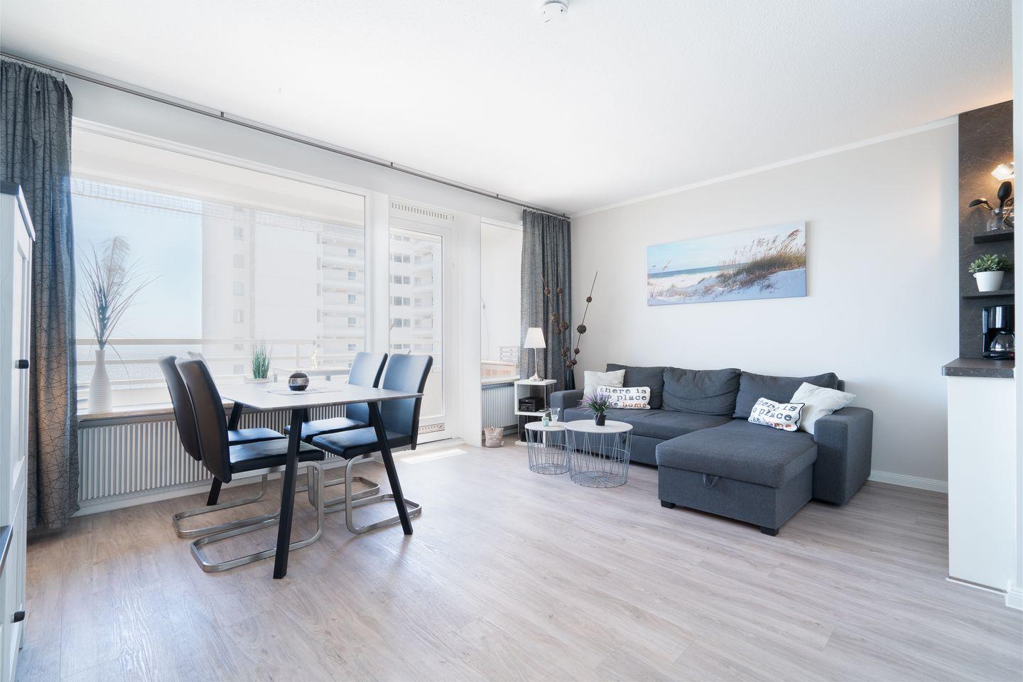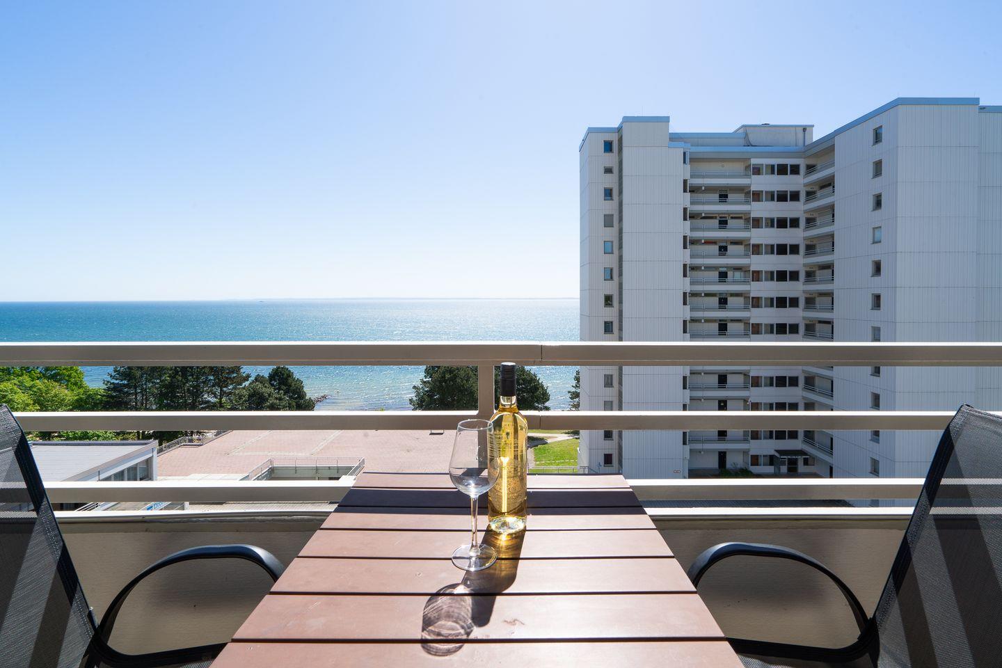Genießen Sie vom Balkon aus in der 6. Etage den wunderschönen Blick auf die Ostsee. Im gemütlich ausgestatteten, kombinierten Wohn- und Essbereich steht eine Schlafcouch (140 x 200 cm). Die mit Geschirrspüler, Backofen und Herd ausgestattete Küche ist zum Wohn- und Essbereich offen. Im innenliegenden Schlafzimmer stehen 2 Einzelbetten (90 x 200 cm), die man nicht zusammenschieben kann. Das Duschbad ist ebenfalls innenliegend. Der Strand ist fußläufig in max. 5 min. zu erreichen.