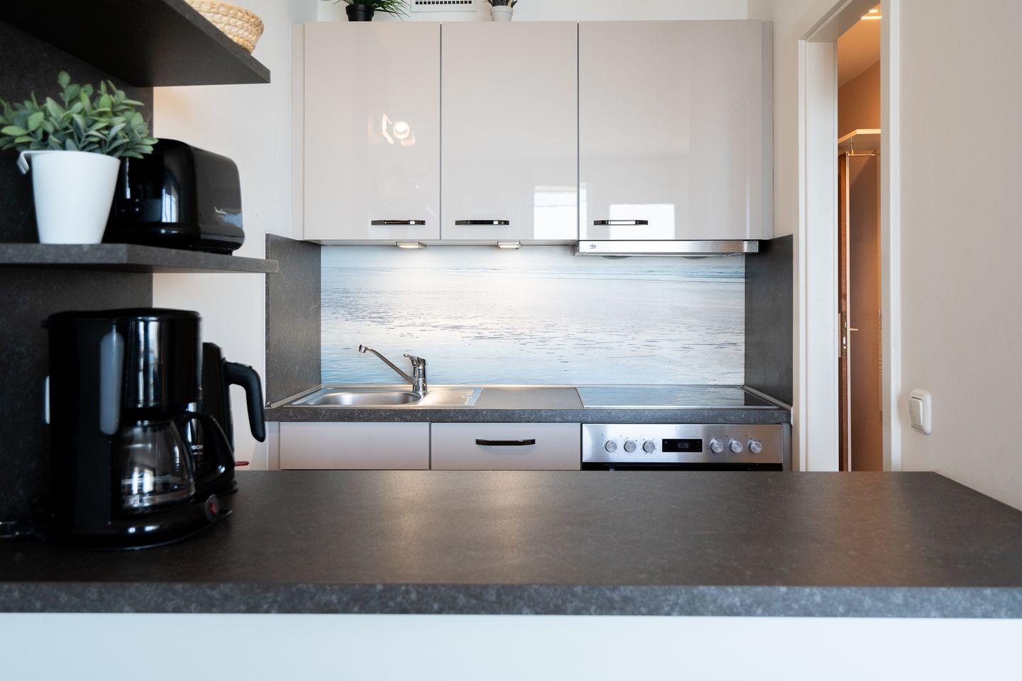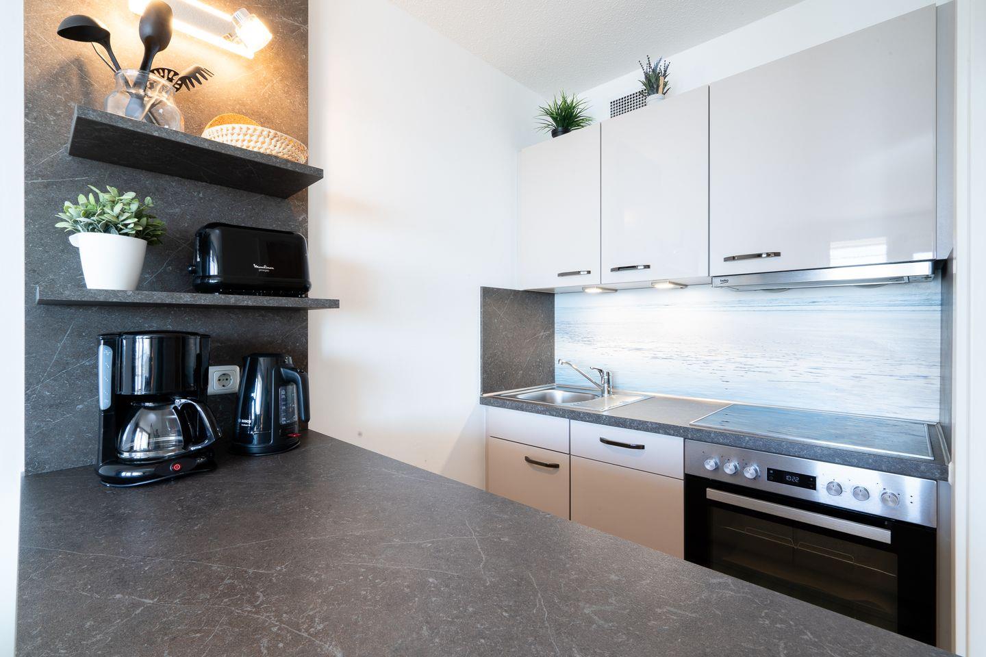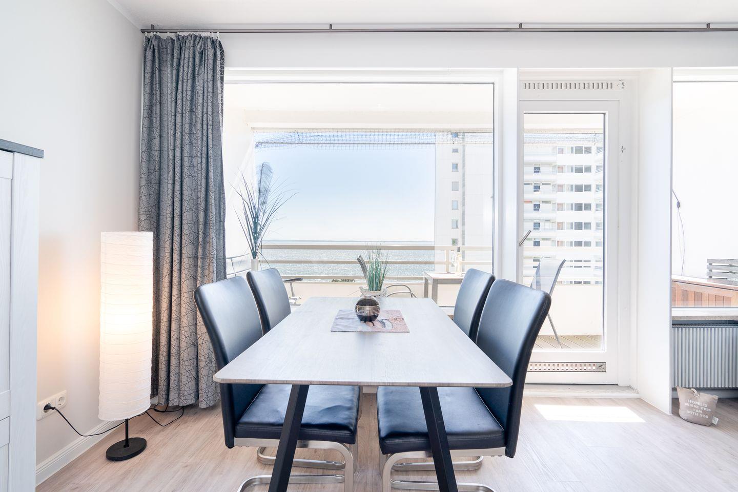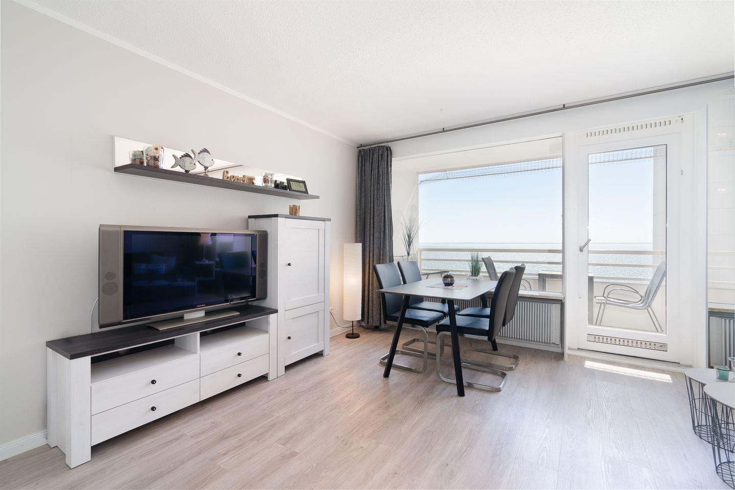 Genießen Sie vom Balkon aus in der 6. Etage den wunderschönen Blick auf die Ostsee. Im gemütlich ausgestatteten, kombinierten Wohn- und Essbereich steht eine Schlafcouch (140 x 200 cm). Die mit Geschirrspüler, Backofen und Herd ausgestattete Küche ist zum Wohn- und Essbereich offen. Im innenliegenden Schlafzimmer stehen 2 Einzelbetten (90 x 200 cm), die man nicht zusammenschieben kann. Das Duschbad ist ebenfalls innenliegend. Der Strand ist fußläufig in max. 5 min. zu erreichen.