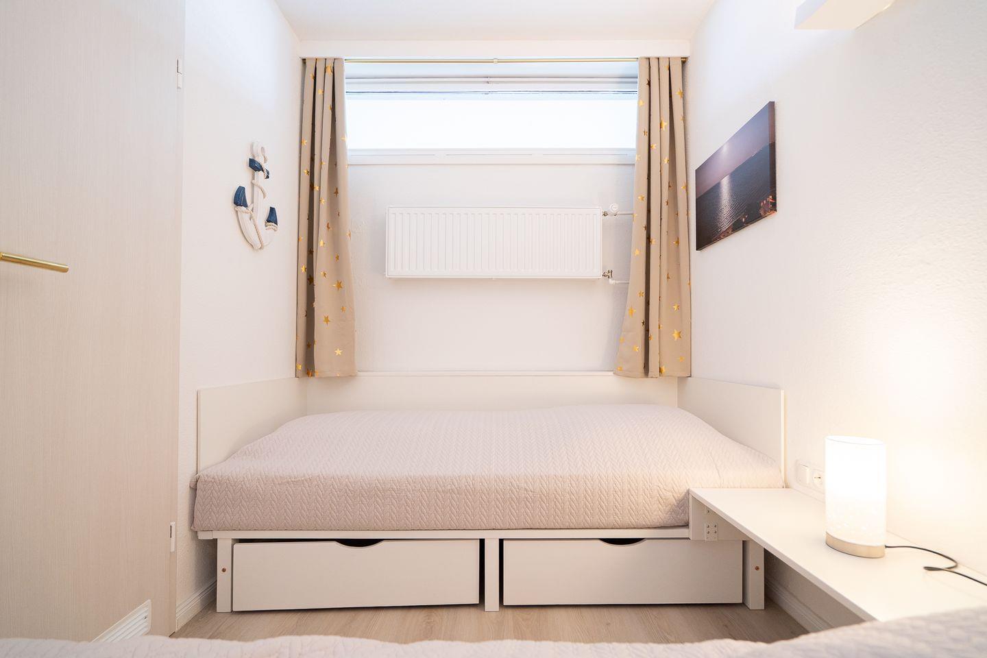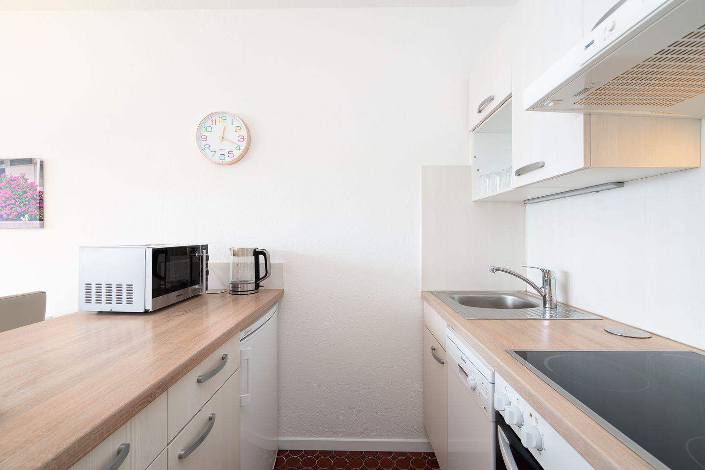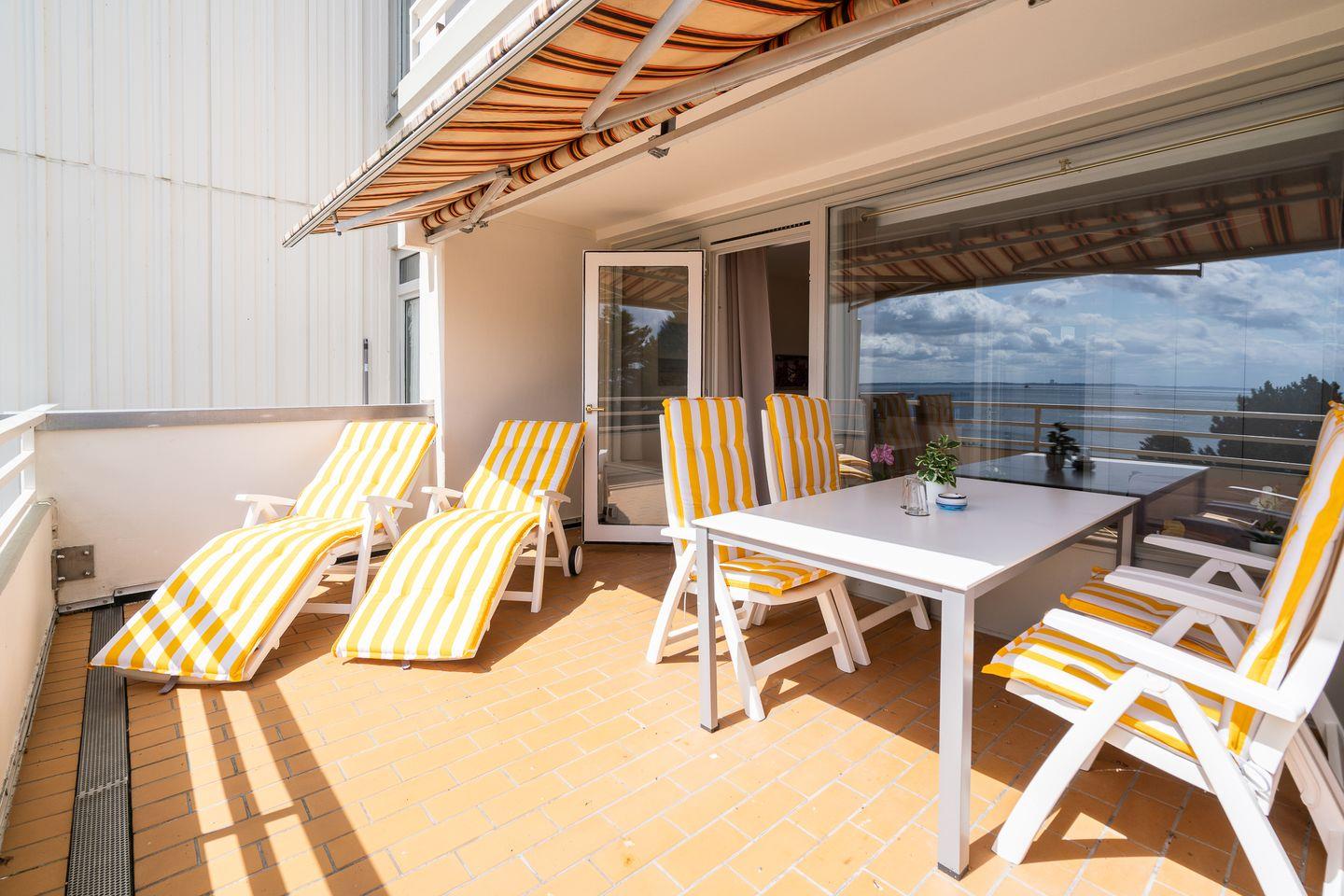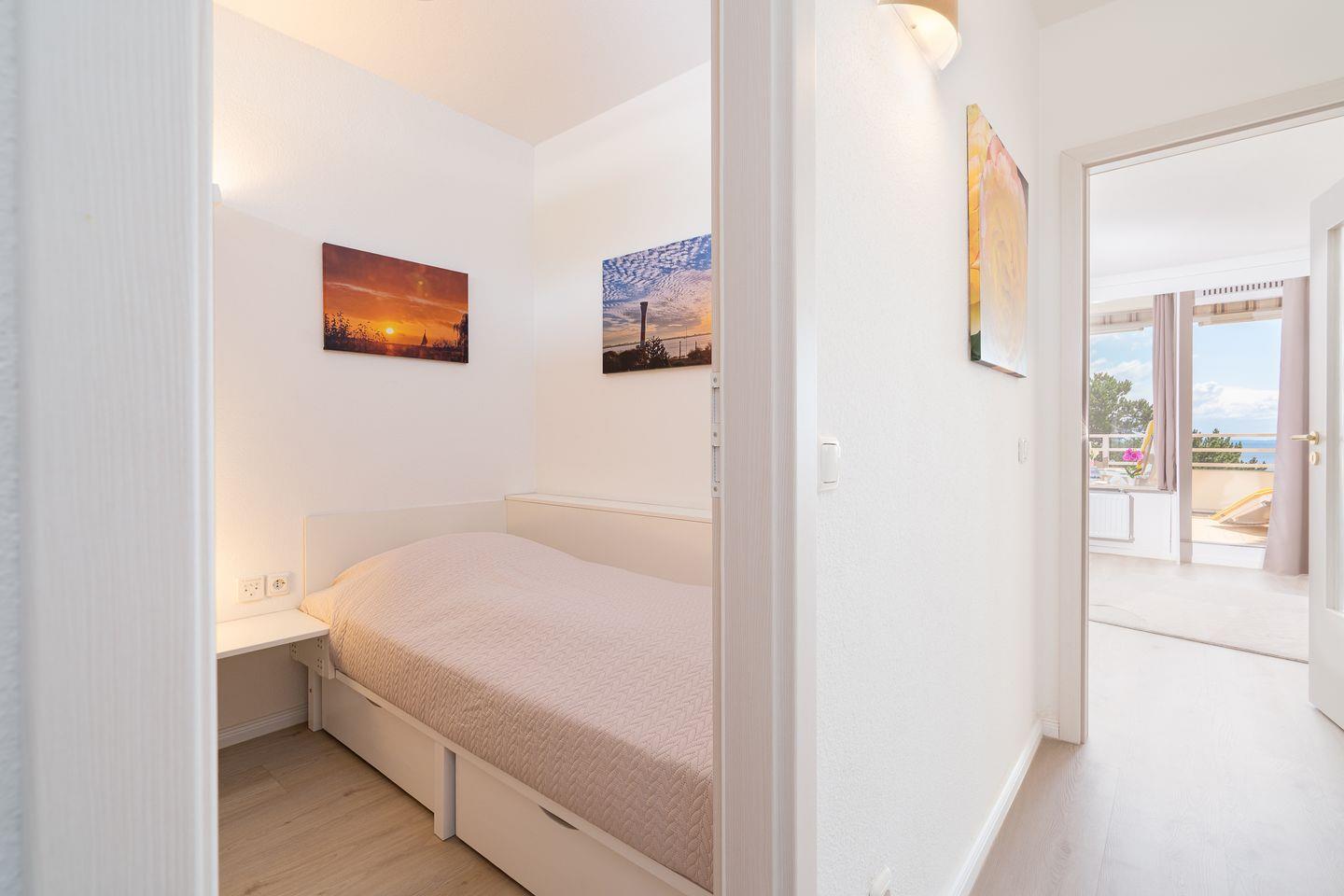 Willkommen in der 2-Raum-Ferienwohnung Nr. 269. In der 1. Reihe gelegen, bietet der große Balkon mit Süd-Ost-Lage einen tollen, direkten Meerblick. Die Wohnung ist für 4 Personen geeignet. Vom kombinierten Wohn- und Essbereich haben Sie Zugang zum Balkon. Die Küche, mit Spülmaschine, Herd und Backofen ausgestattet, ist in den Wohn-/Essbereich integriert. Im Schlafraum stehen zwei Einzelbetten (90 x 200 cm), die man nicht zusammenschieben kann. Das Sofa mit Schlaffunktion (125 x 200 cm) bietet zwei weitere Schlafmöglichkeiten. Das modernisierte Duschbad hat ein Fenster. Zum Strand und zur Promenade sind es nur wenige Minuten zu Fuß. Der PKW-Stellplatz ist nur über eine Treppen zu erreichen, aber über einen Seiteneingang geht es zum Fahrstuhl, der ebenerdiges Be-und Entladen ermöglicht.
